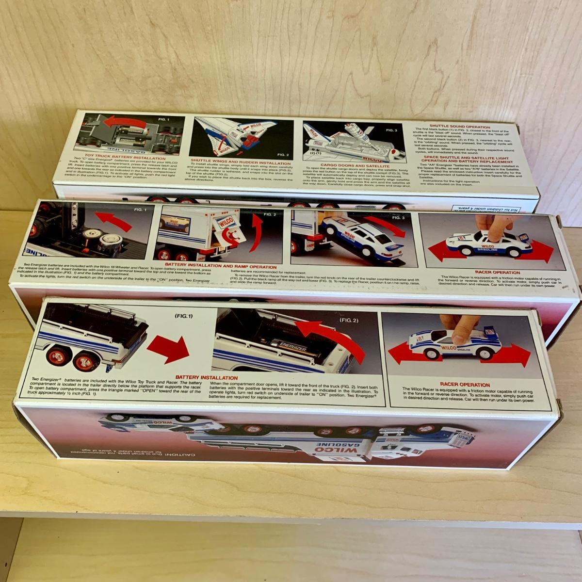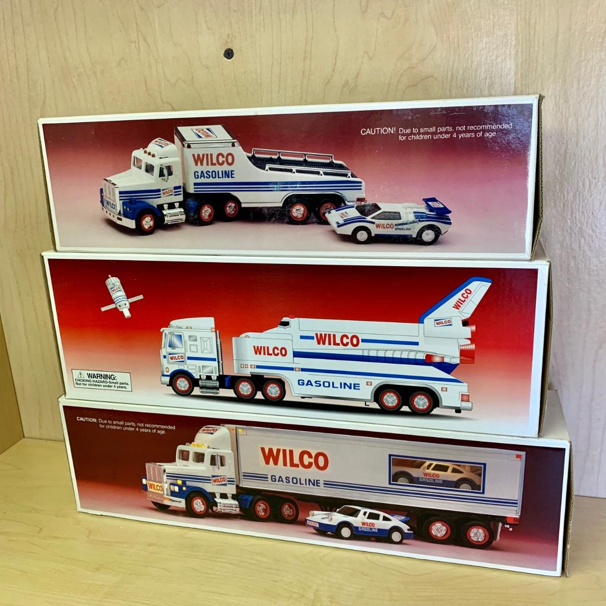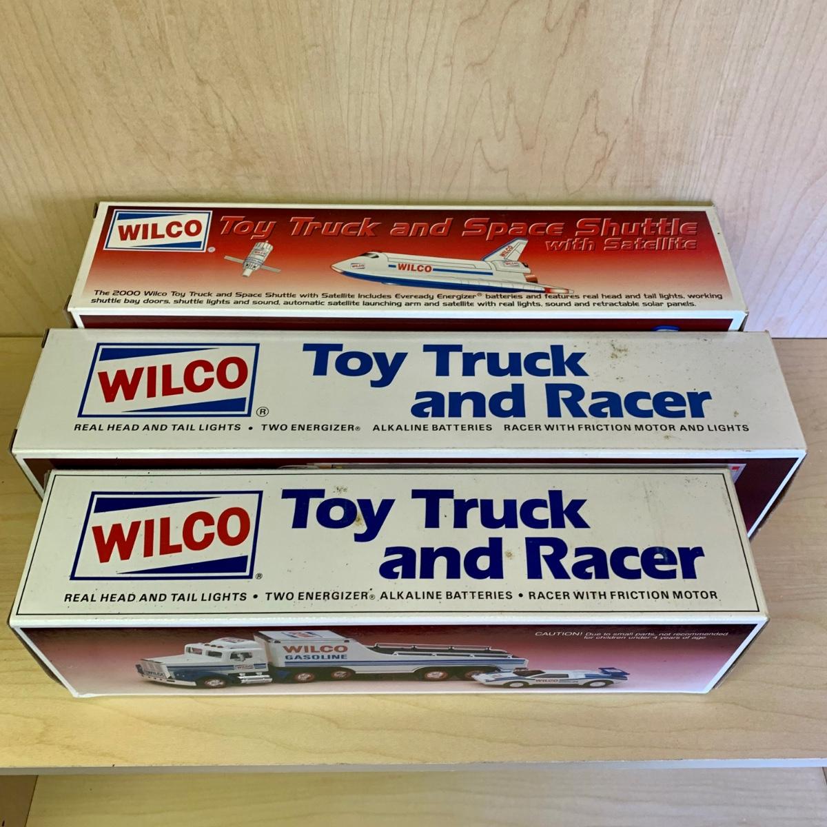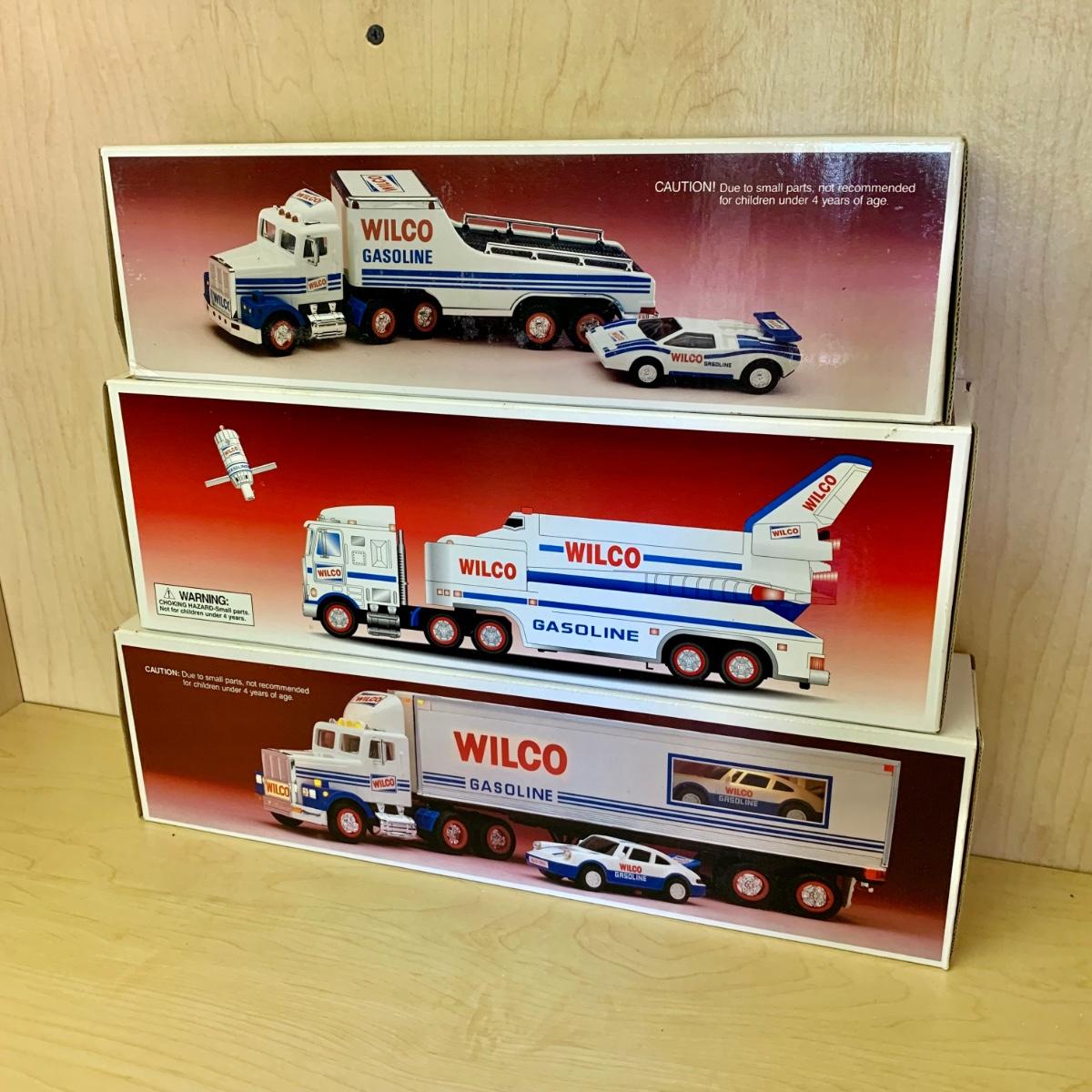 LOT 211: Wilco Toy Truck Collection: Patrol Car, Recreation Van With Dune Buggy And Motorcycle, Emergency Truck, & More