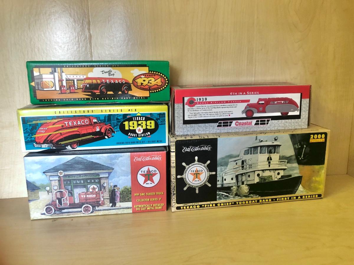 LOT 229: Ertl Collectibles - Coastal 1939 Dodge Airflow Tanker & Texaco - 1934 Doodle Bug Bank, 2000 "Fire Chief" Tugboat Bank, 1939 Dodge Airflow Bank & 1919 GMC Tanker Truck