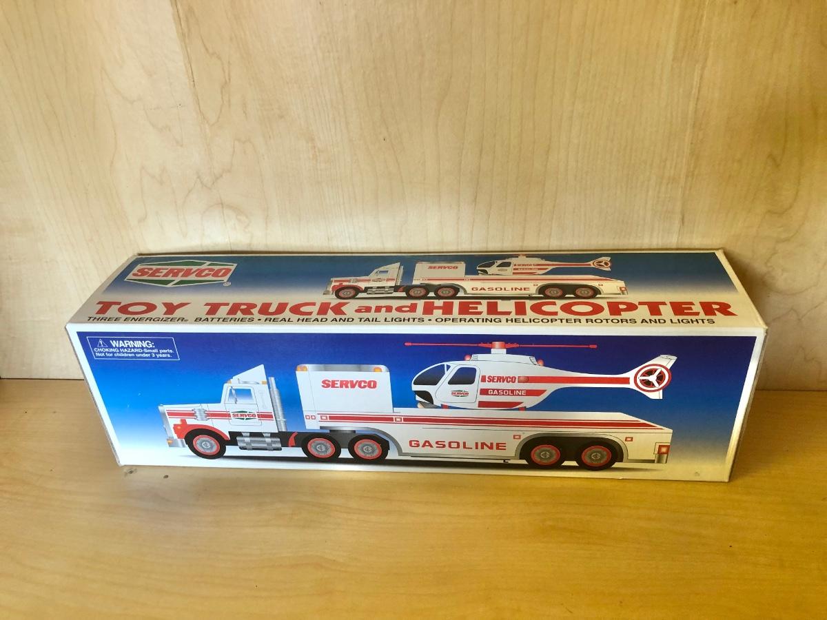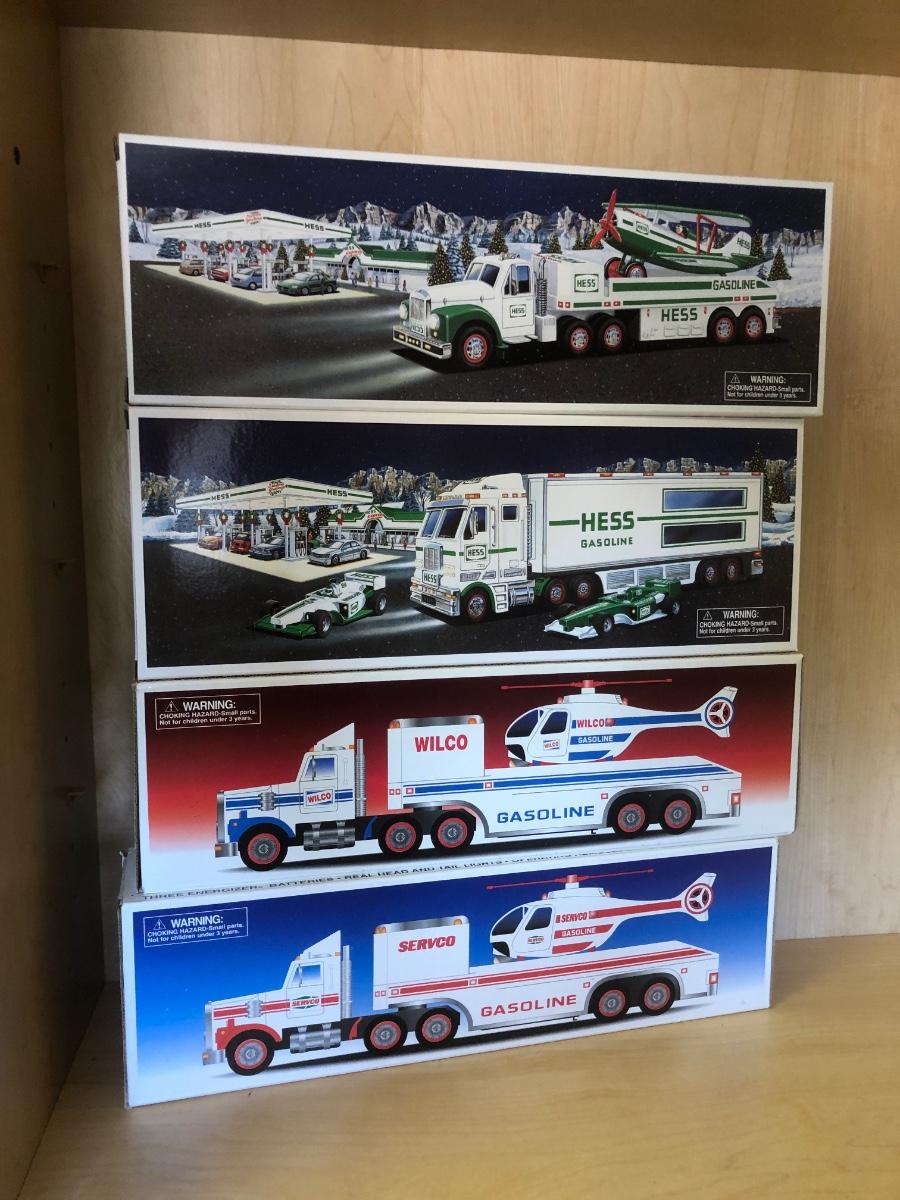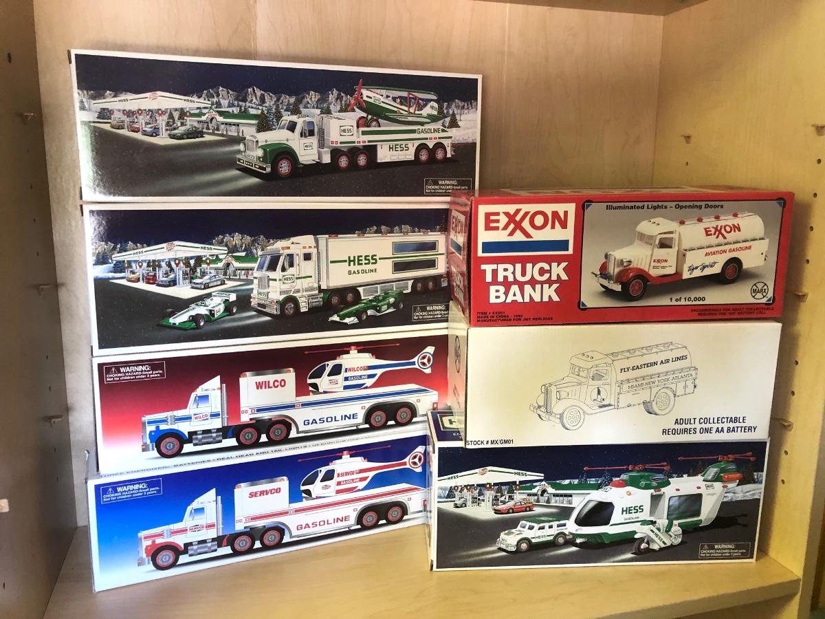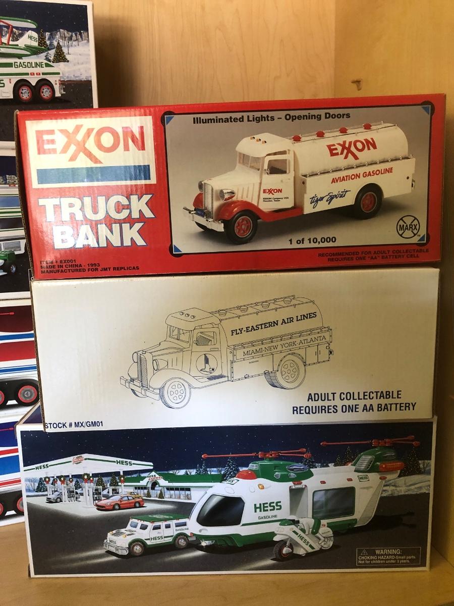 LOT 234: Exxon Truck Bank (one of 10,000), Hess Helicopter & Prop Plane Trucks, Fly-eastern Air Lines Tanker Truck, Servco & Wilco Transport Trucks w/ Helicopters