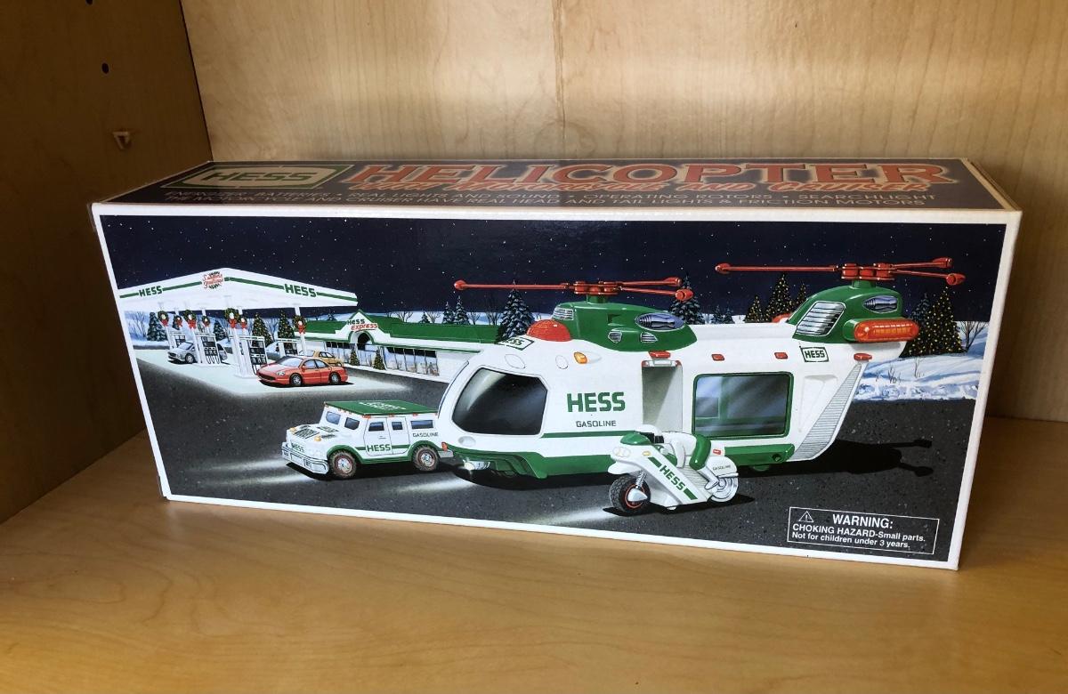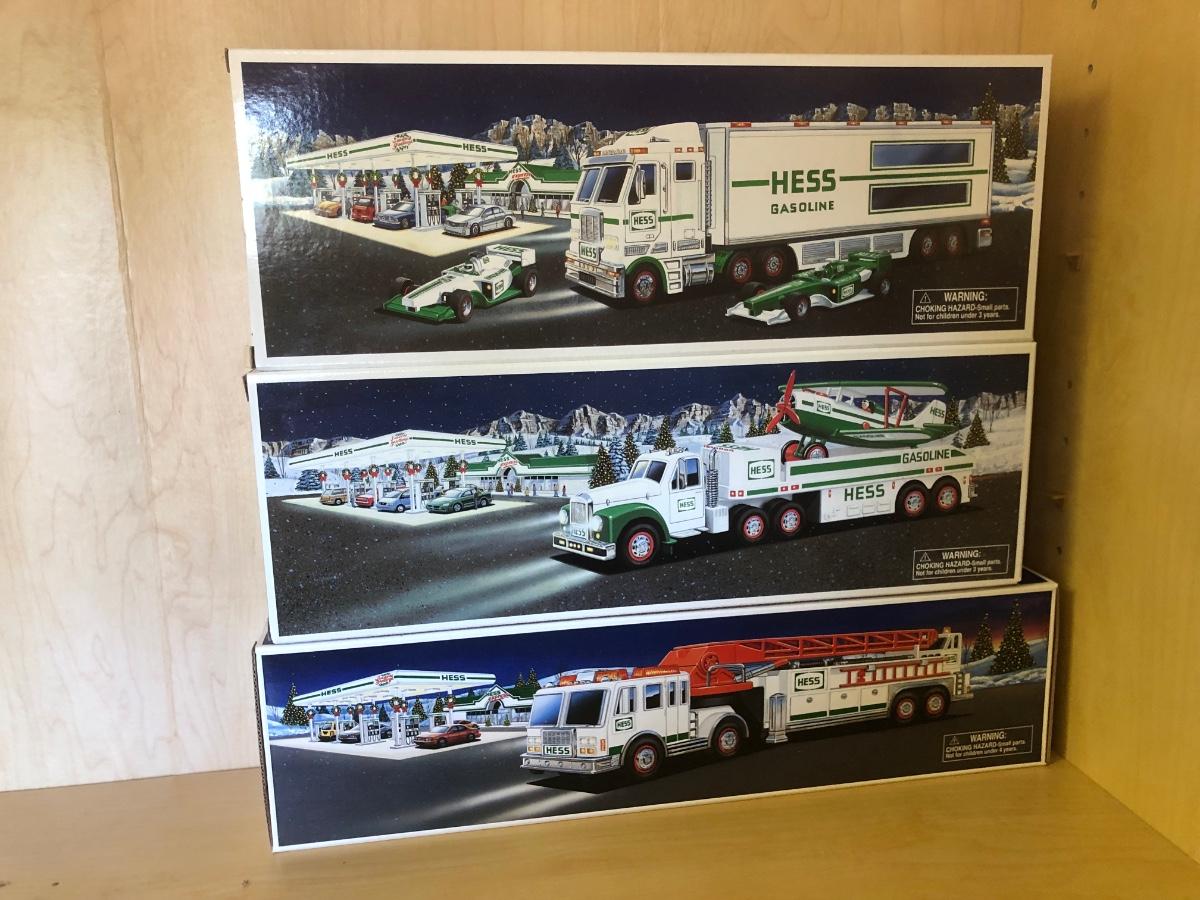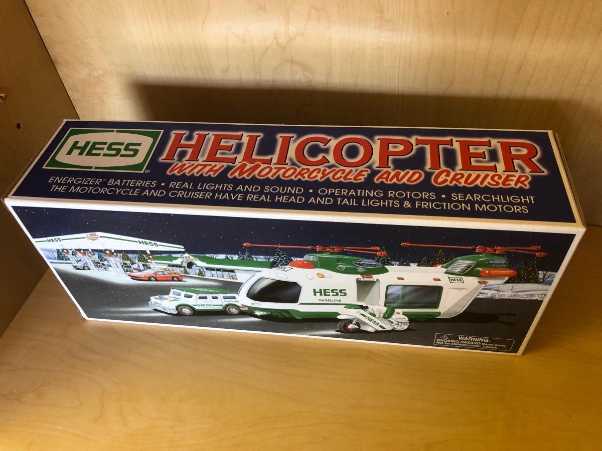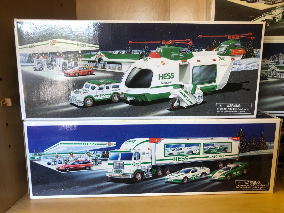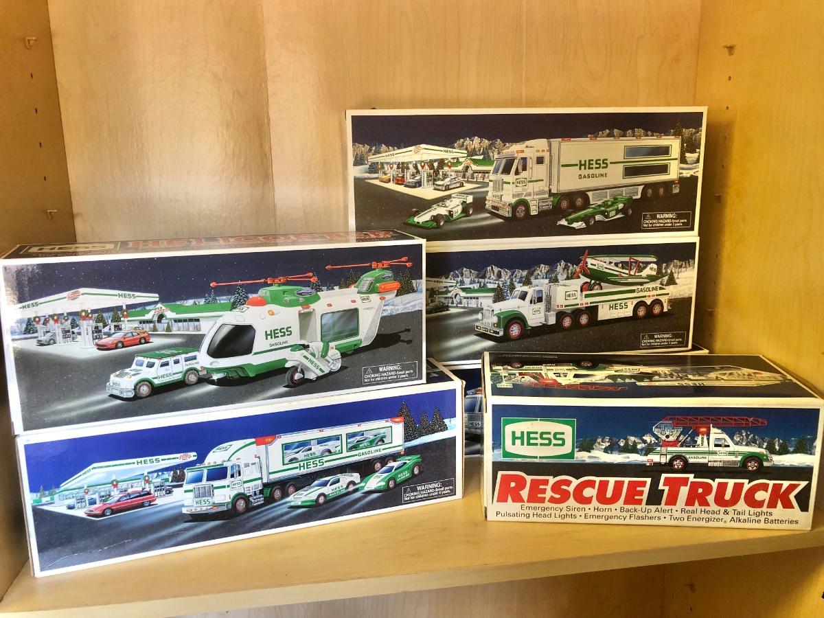 LOT 237: Hess Collectibles - Rescue Truck, Fire Truck, Toy Truck & Racecars, Toy Truck & Airplane, Helicopter w/ Motorcycle & Cruiser