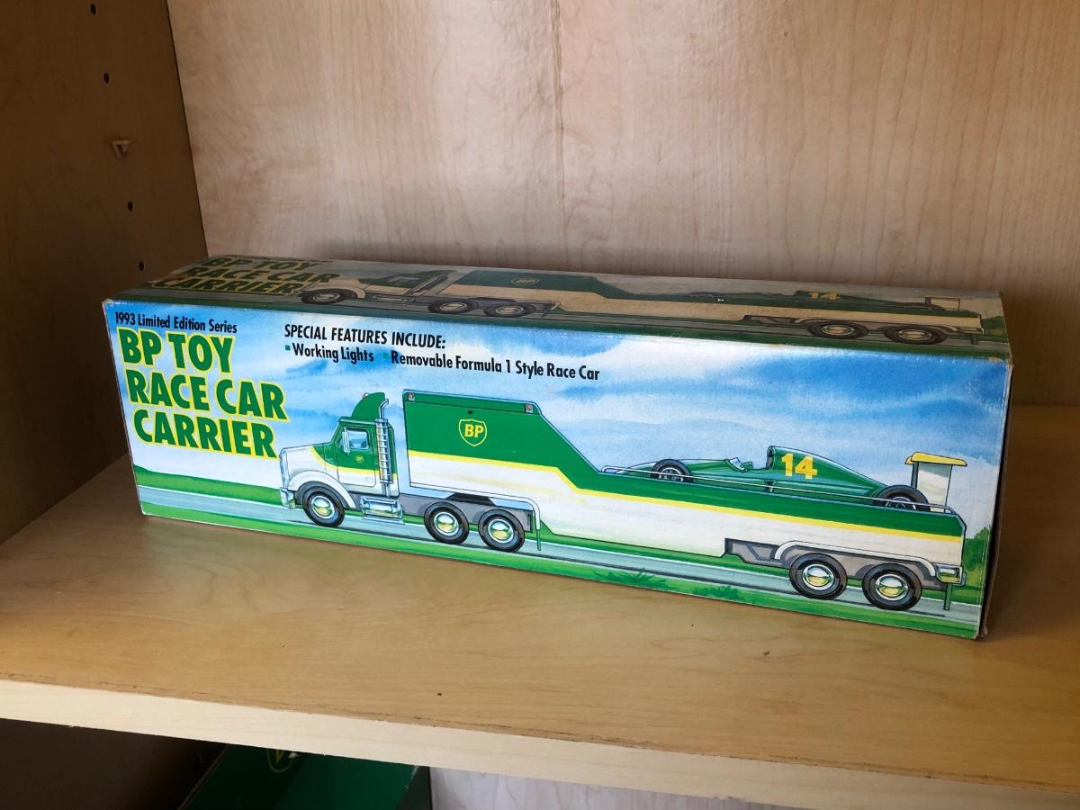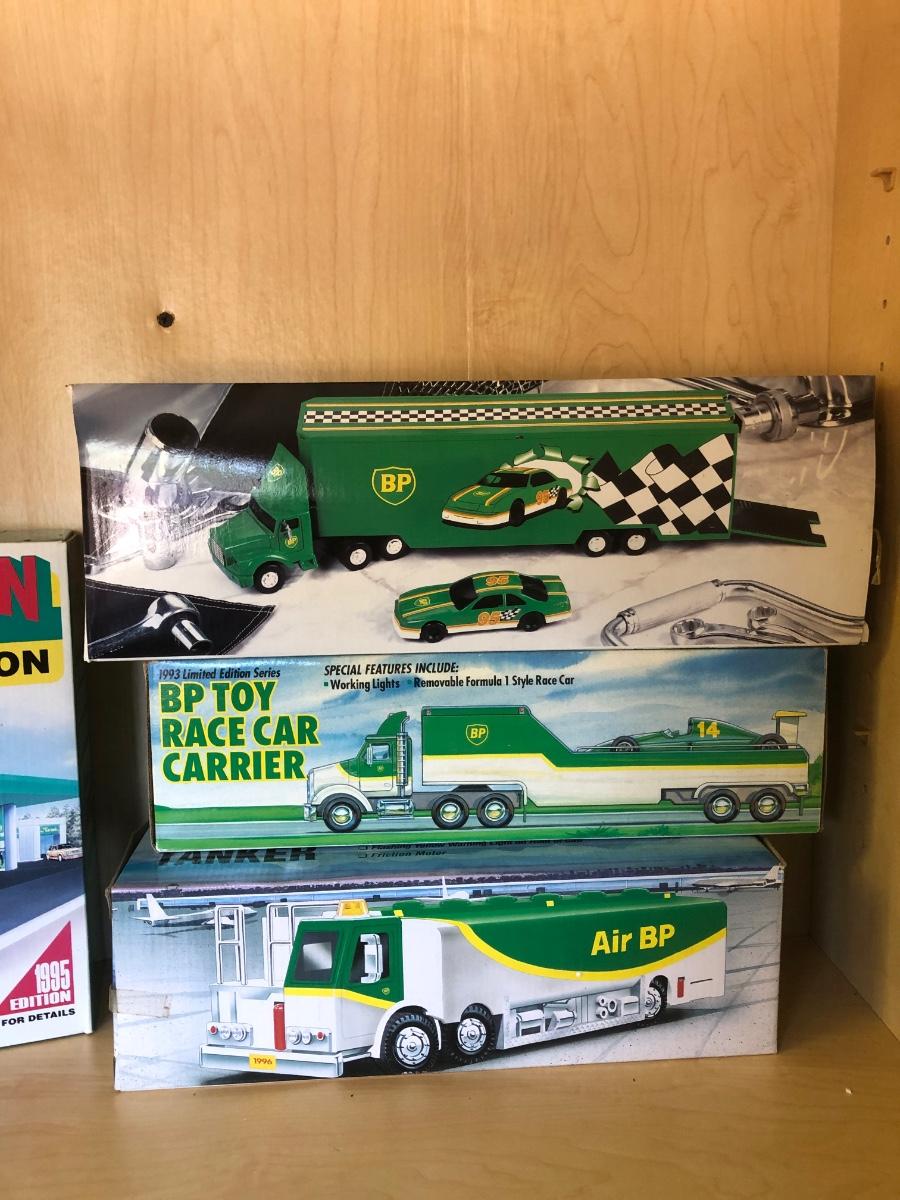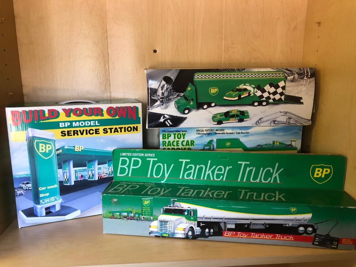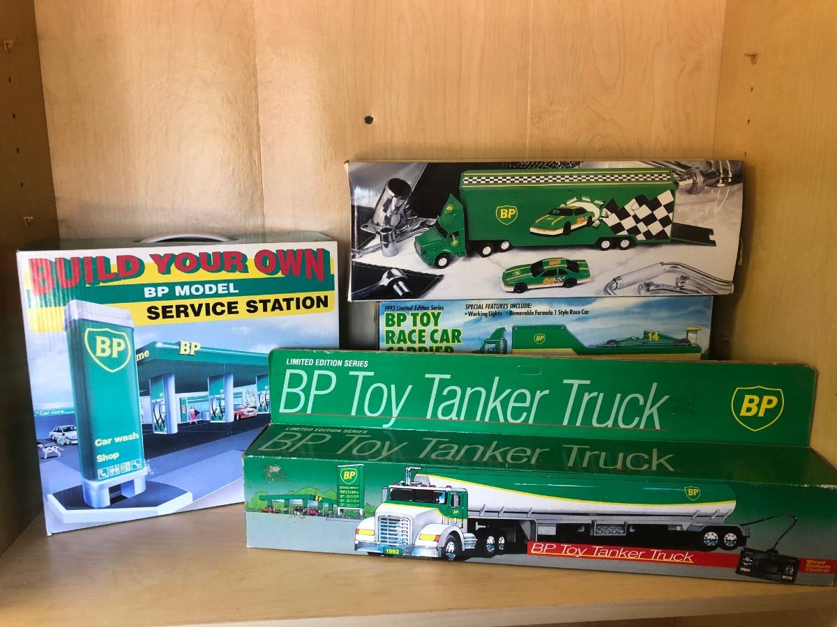 LOT 238: BP Collection - Build Your Own BP Model Service Station, Toy Tanker Truck, Toy Race Car Carrier, Aviation Tanker & More