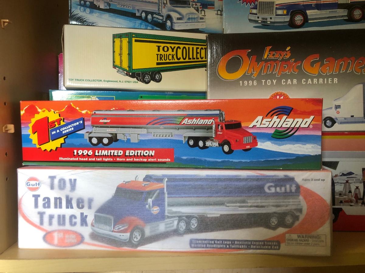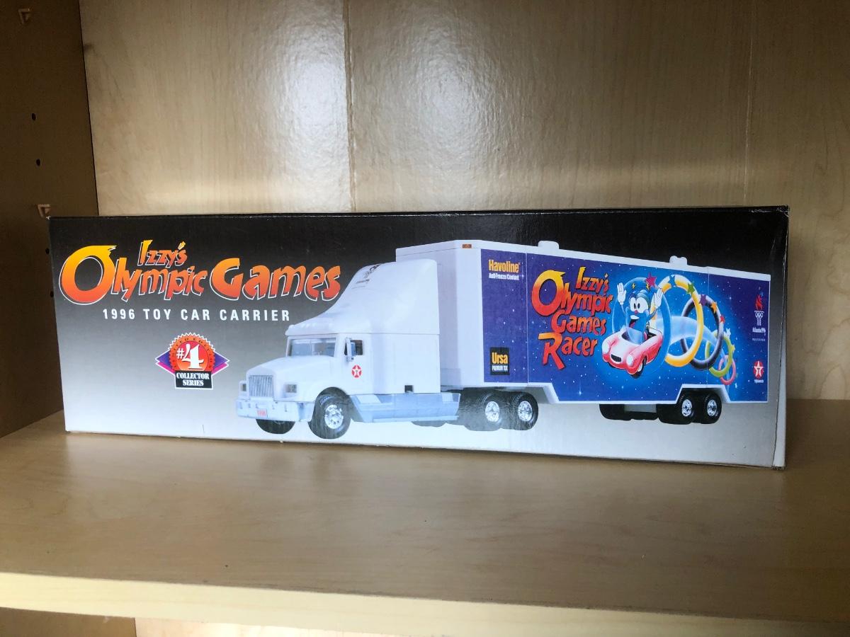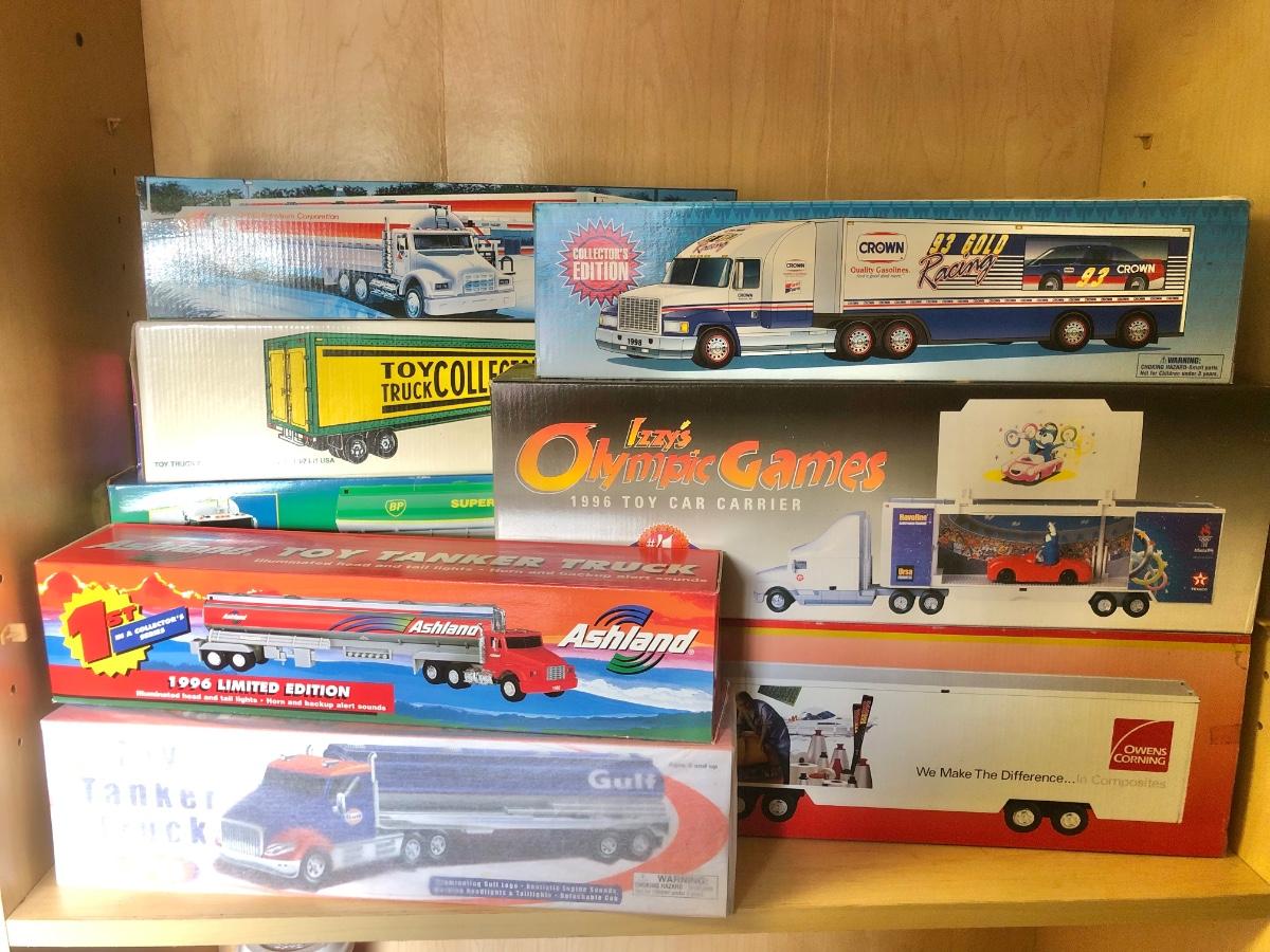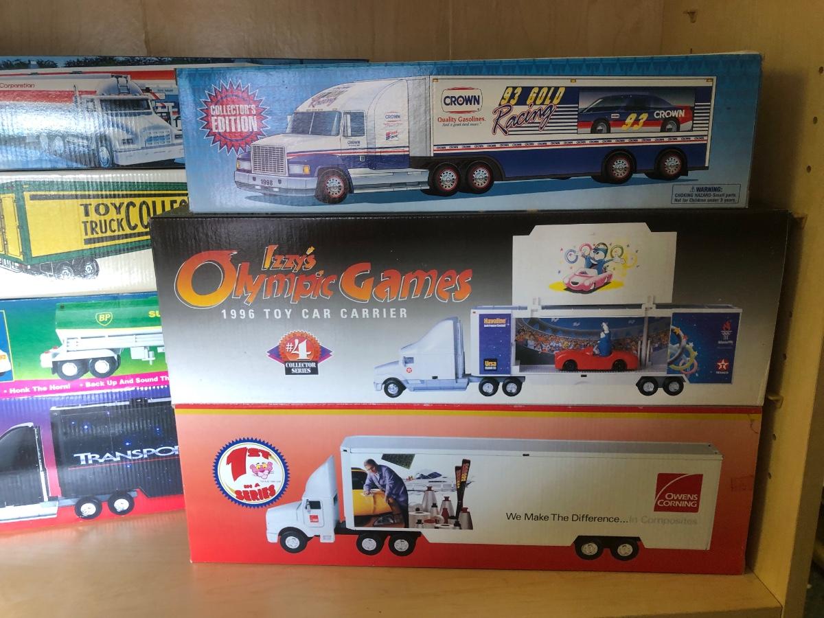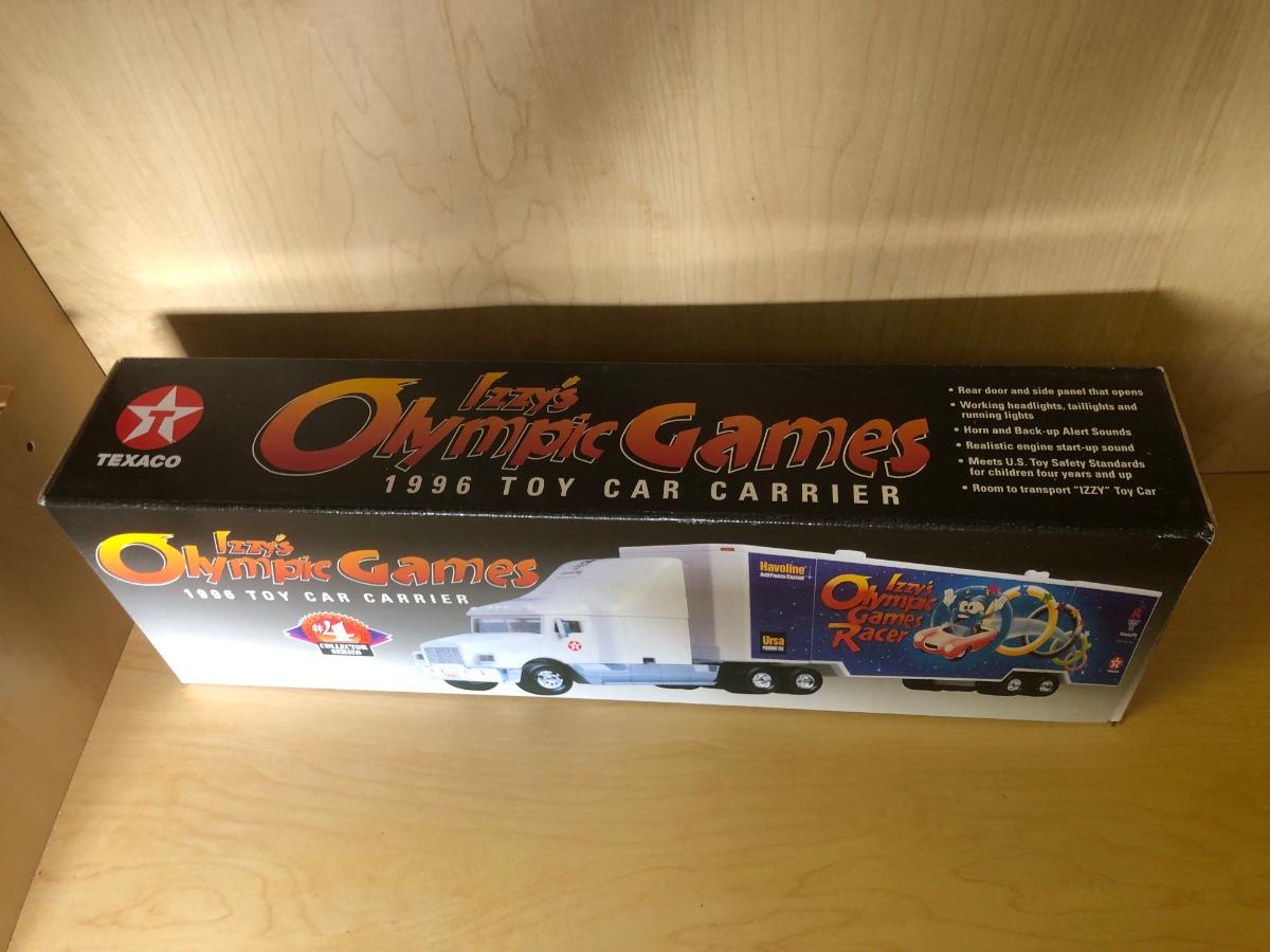 LOT 240: Collectible Toy Trucks - Texaco 1996 Izzy's Olympic Games Car Carrier, Gulf Tanker, Ashland 1996 Tanker, Crown 93 Gold Racing Car Carrier & More