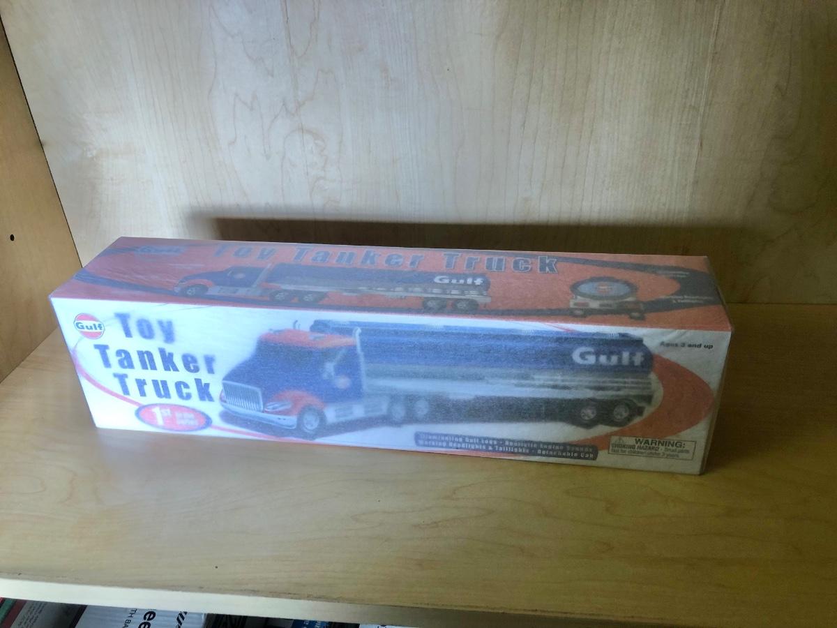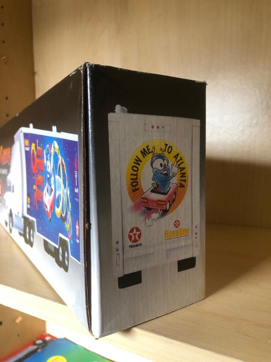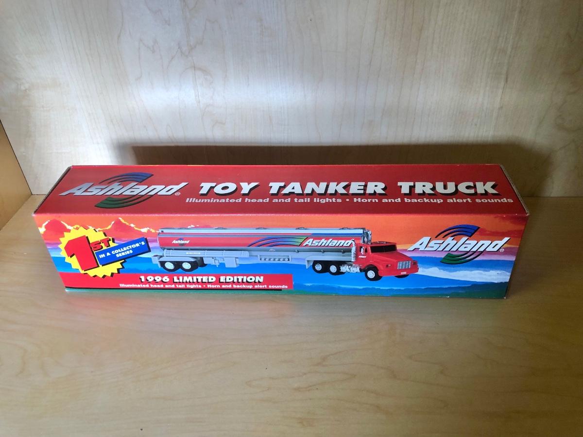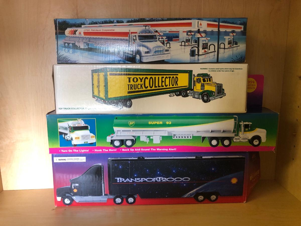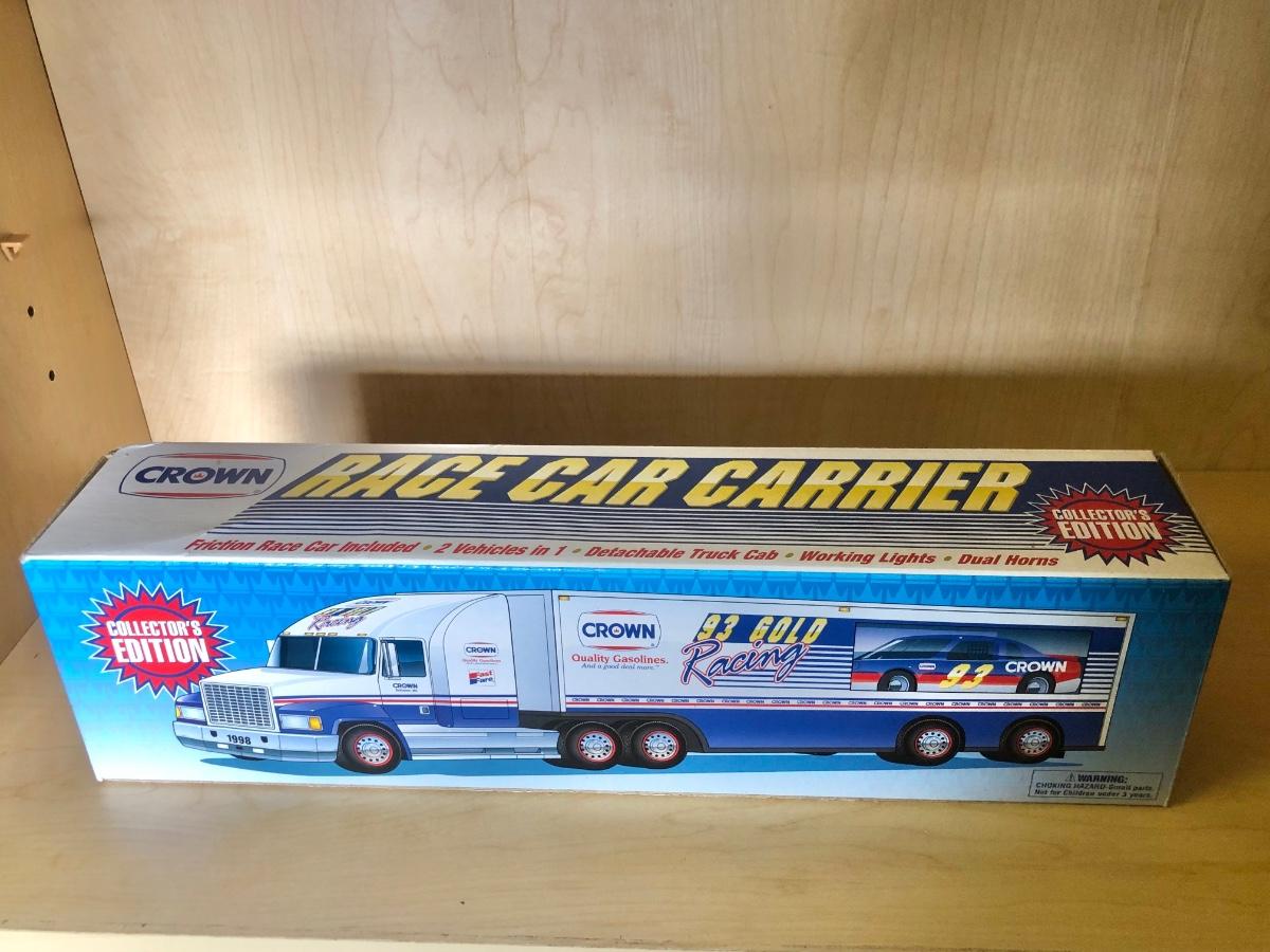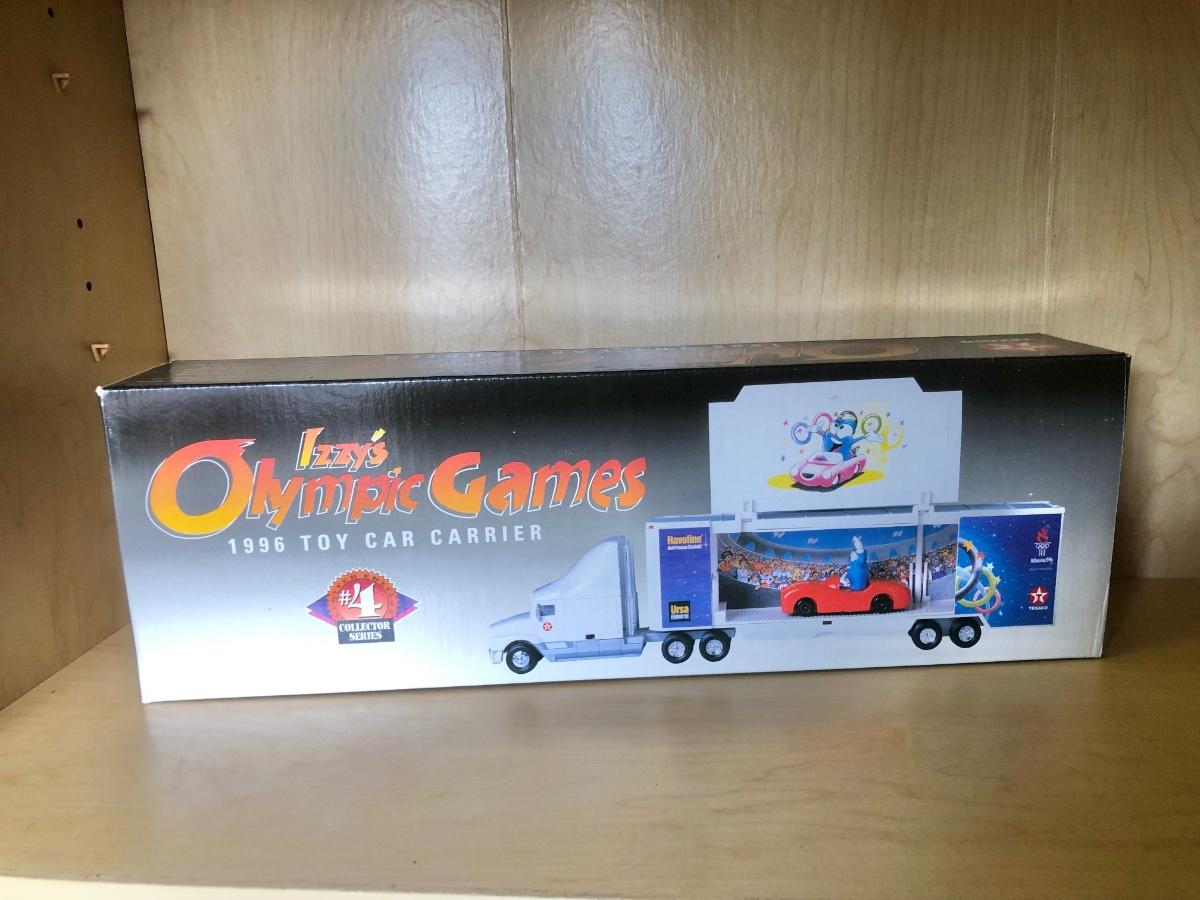 LOT 240: Collectible Toy Trucks - Texaco 1996 Izzy's Olympic Games Car Carrier, Gulf Tanker, Ashland 1996 Tanker, Crown 93 Gold Racing Car Carrier & More
