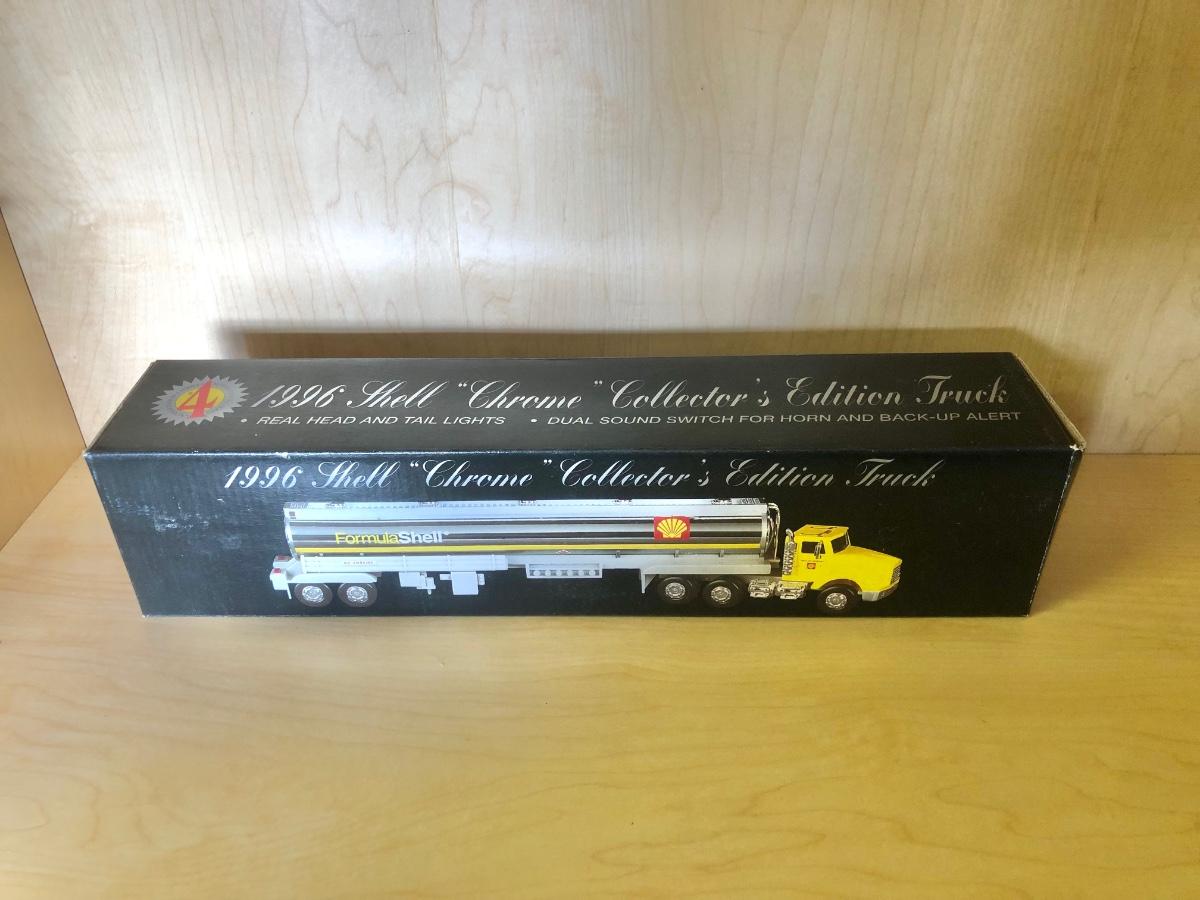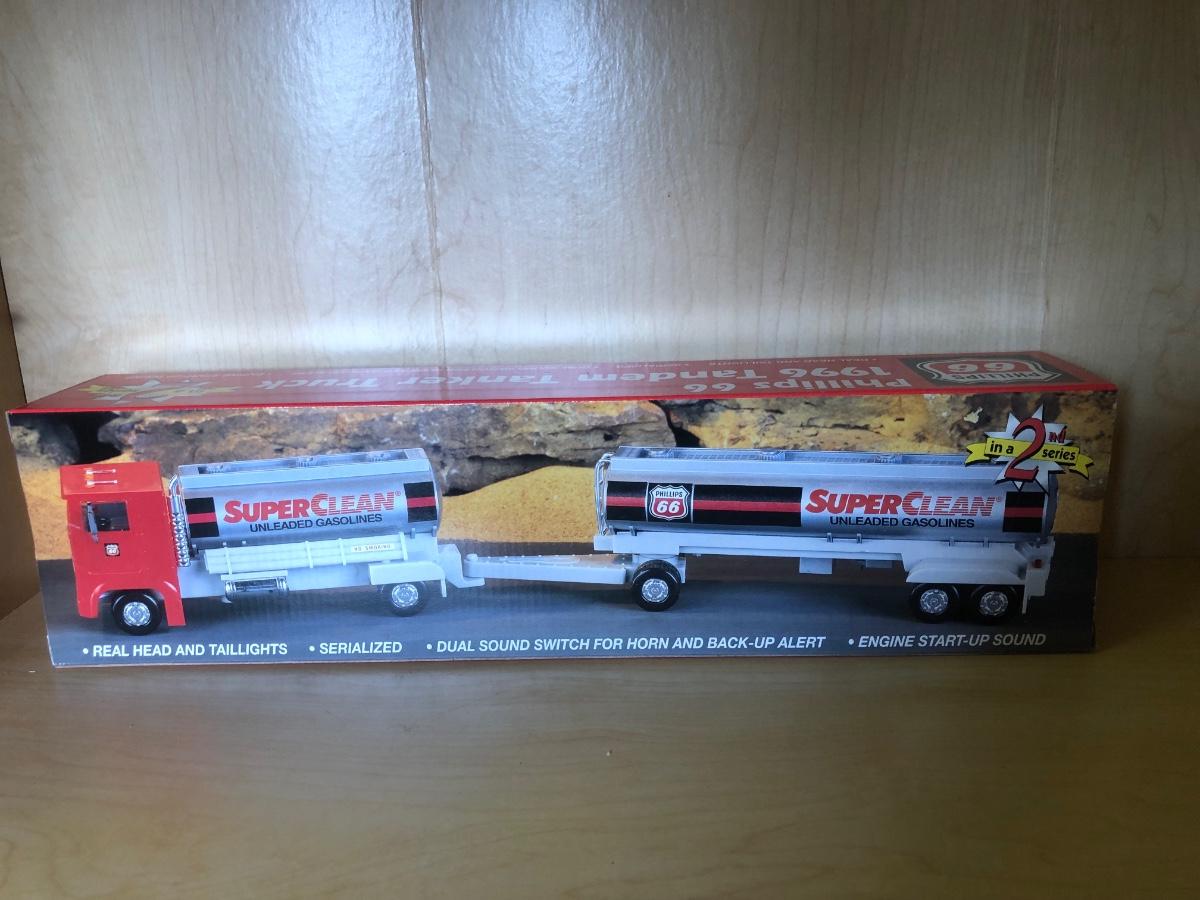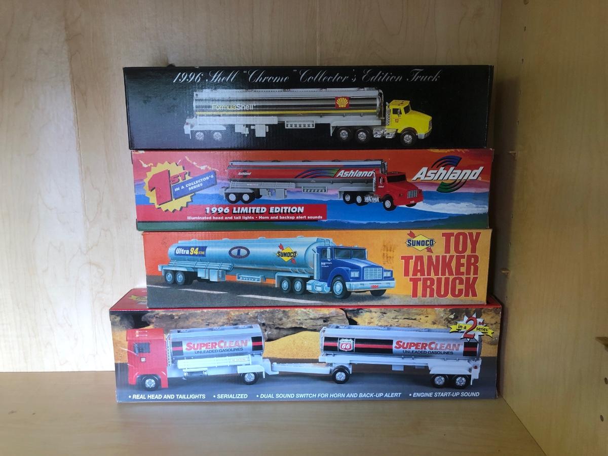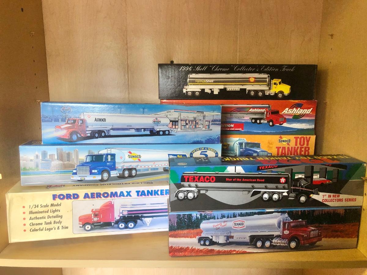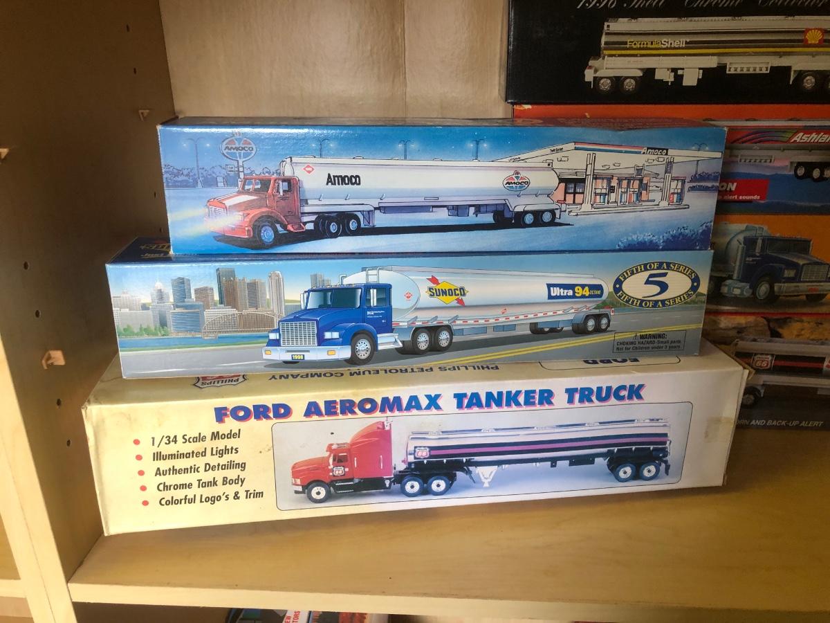 LOT 241: Collectible Toy Tanker Trucks - 1996 Shell Chrome Collector's Edition, Amoco, Phillips 66 Ford Aeromax, 1994 Texaco, Sunoco