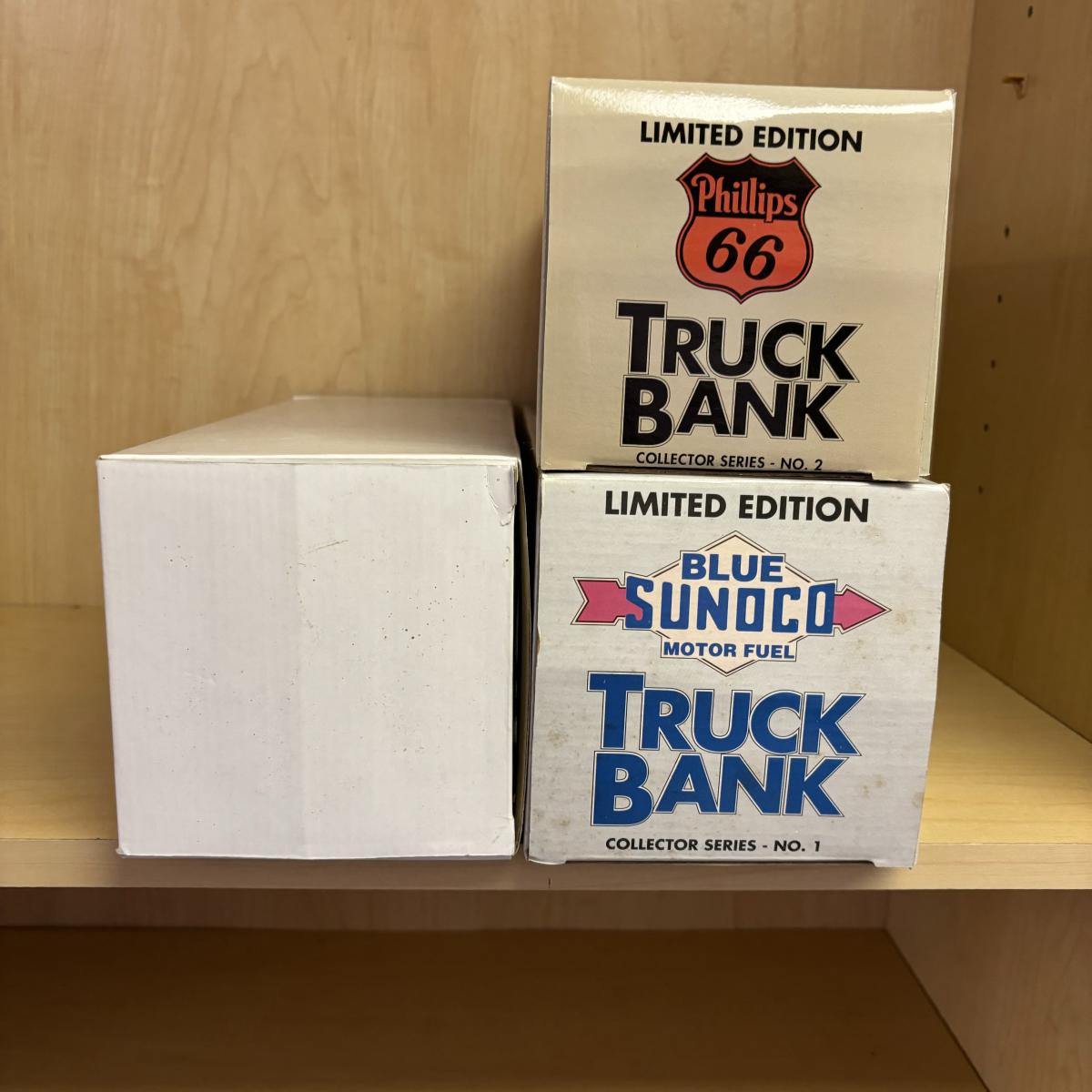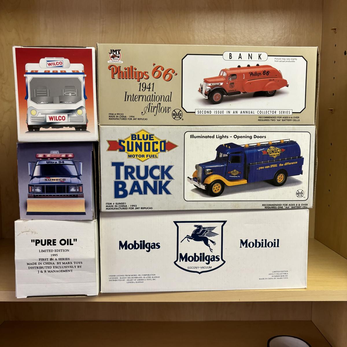 LOT 288: Collectible Toy Trucks & Bank: Phillips 66, Sunoco Bank, Wilco, Sunoco Tow Truck, Mobil Gas, Pure Oil