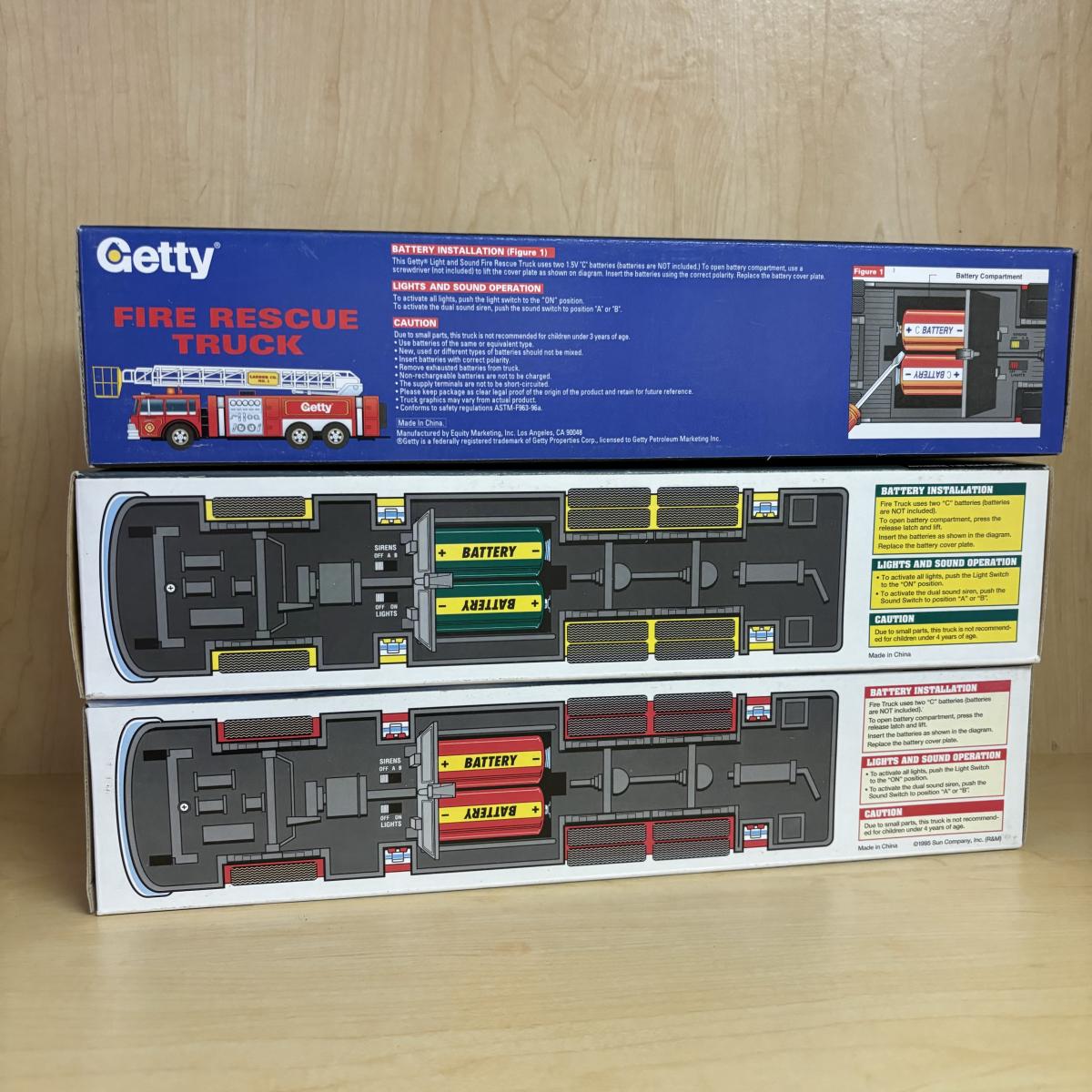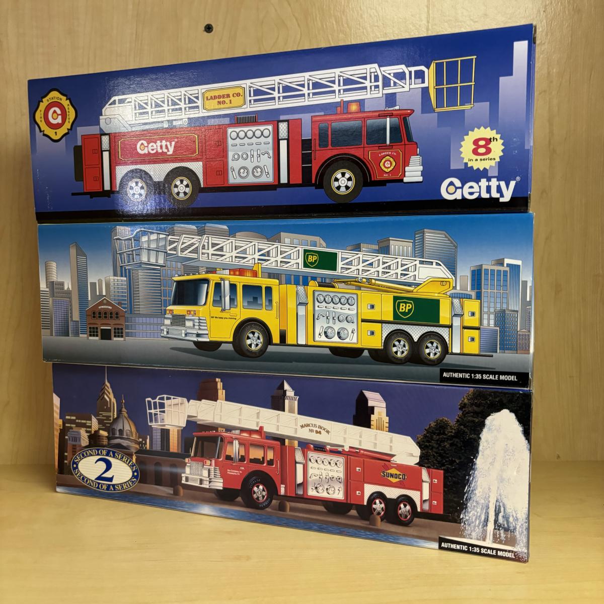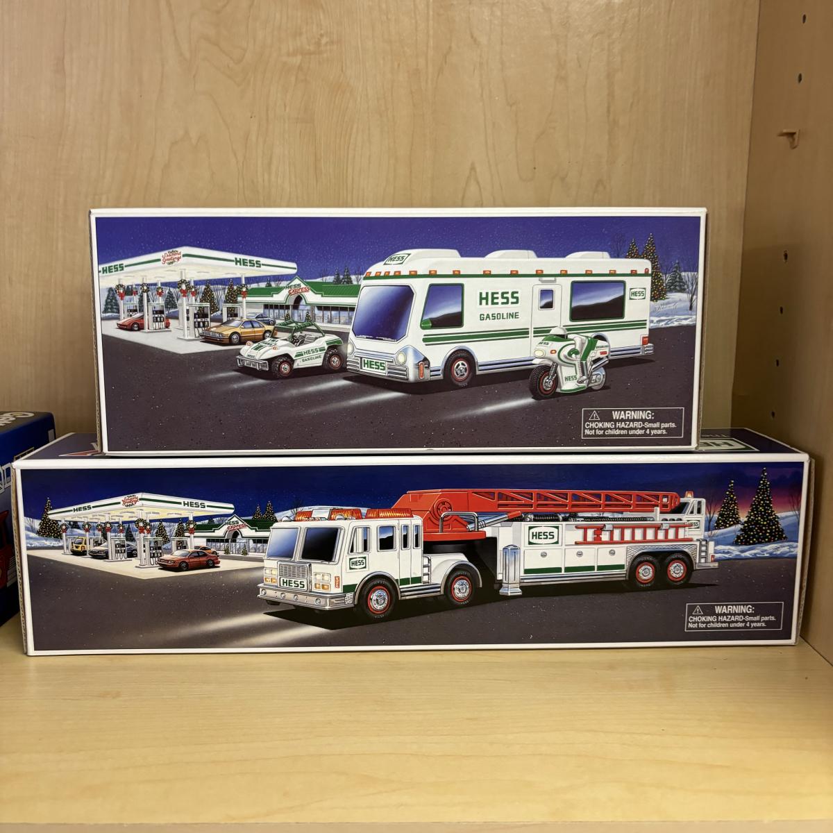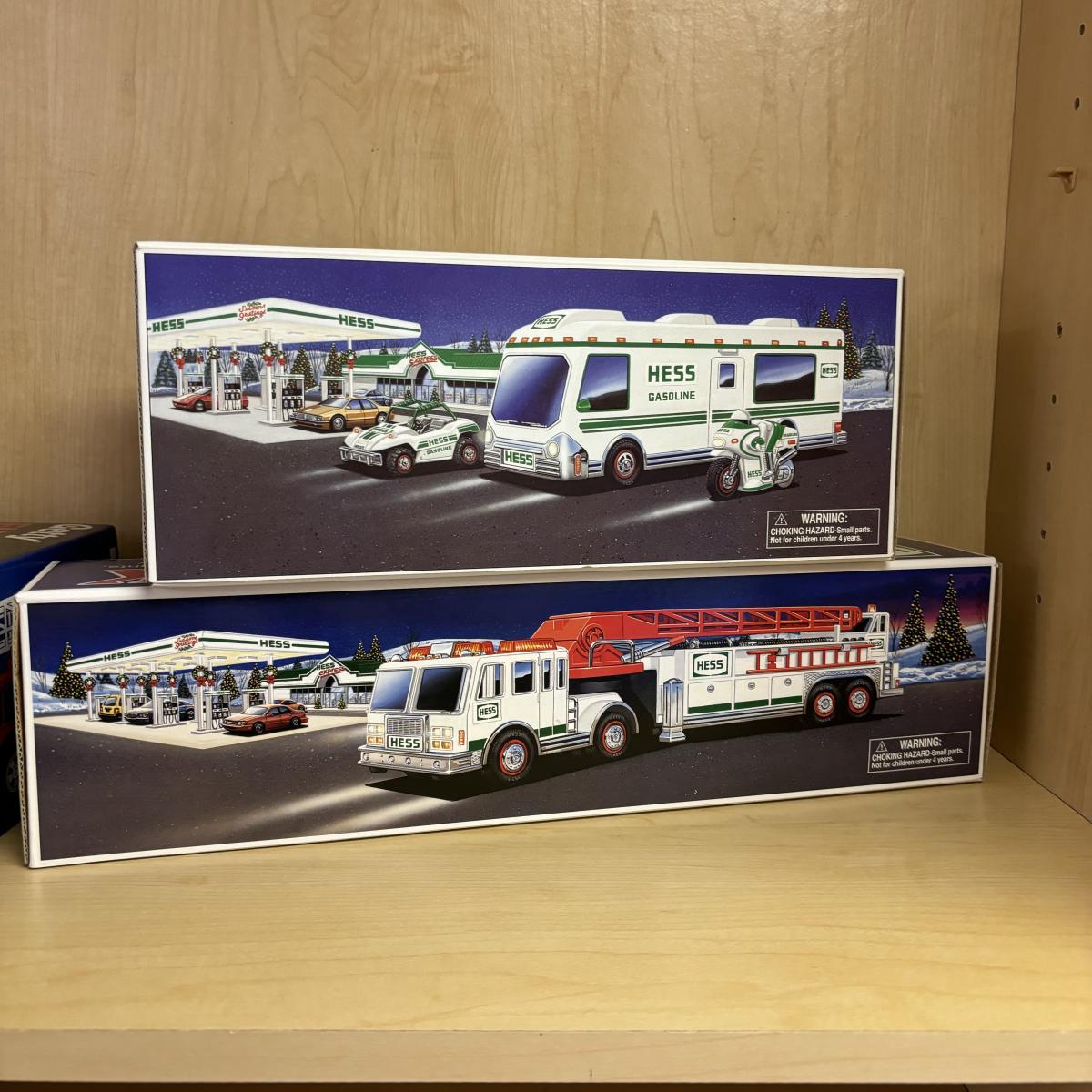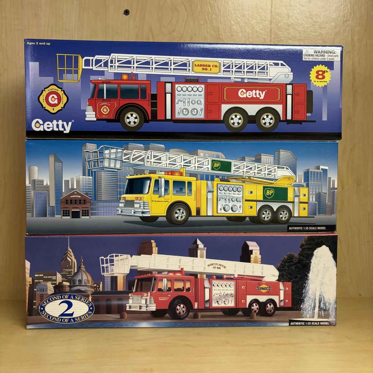 LOT 294: New/Old Stock Toys: Hess Trucks 2000 & 1998, Mobil Tow Truck, Getty, Sunoco & BP Fire Truck