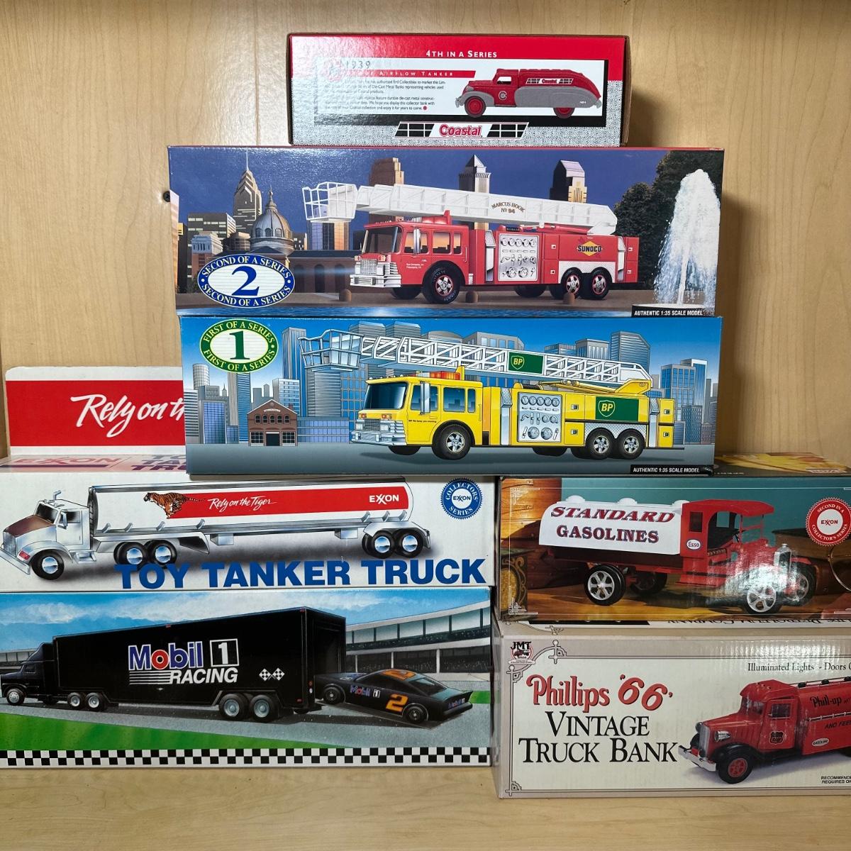 LOT 317: Exxon Toy Tanker Truck, Coastal Die Cast Double Airflow Tanker Bank, Sunoco Fire Truck & More Model Trucks