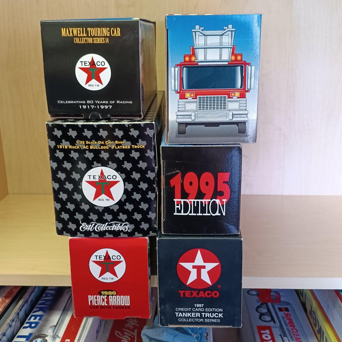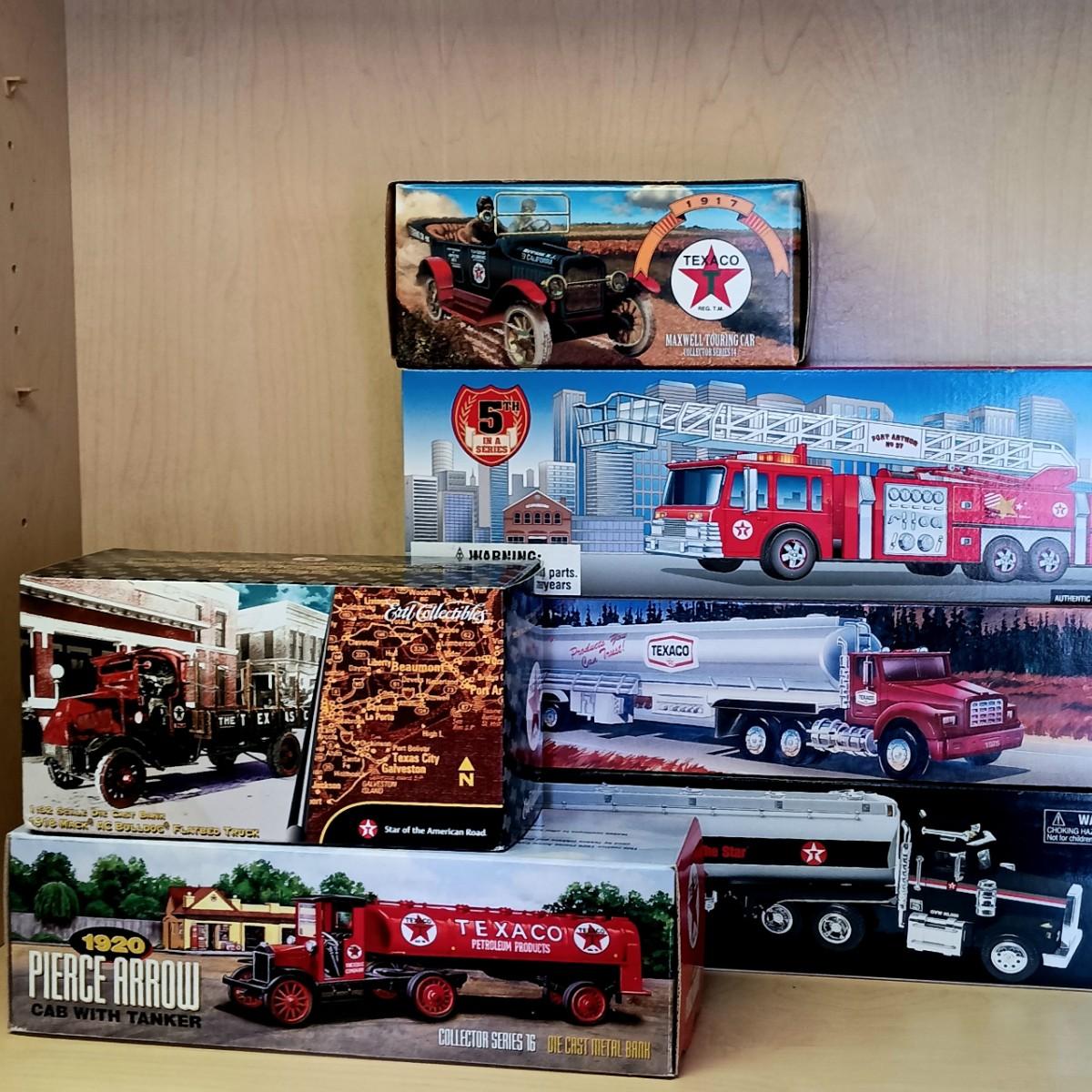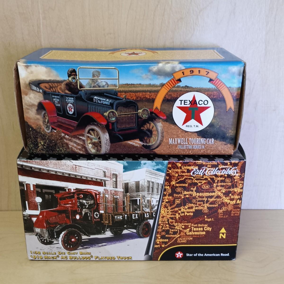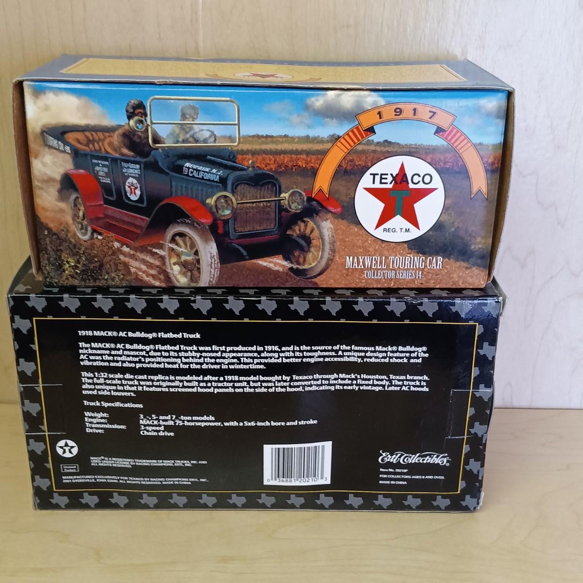 LOT 348: Texaco Toy Truck Collection: Collector Series 14 1997 Maxwell Touring Car, "1918" Mack "AC Bulldog" Flatbed Truck, & More