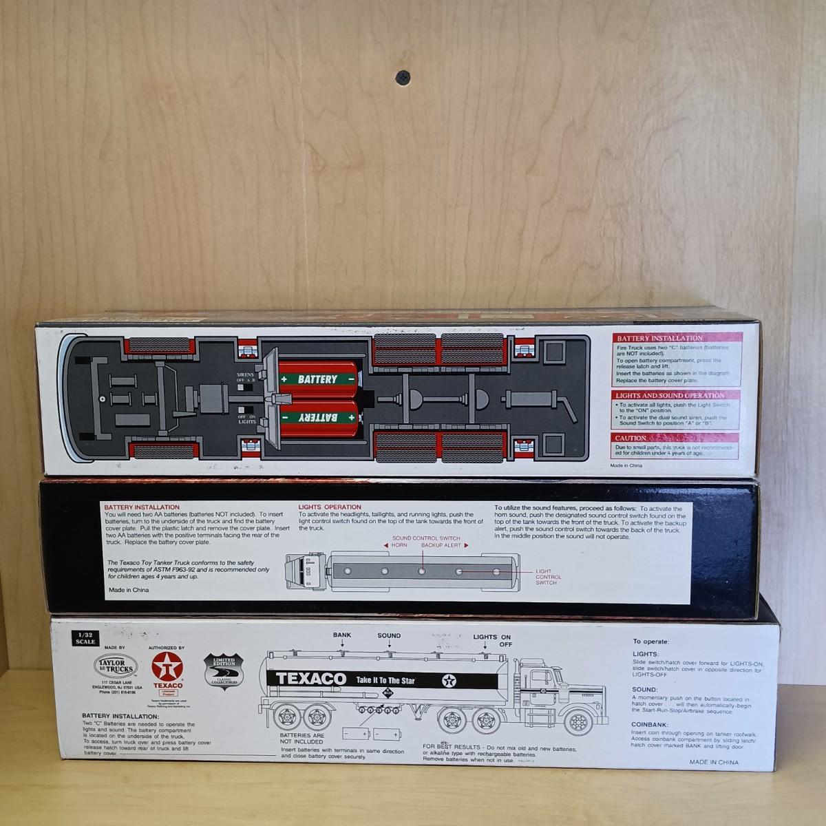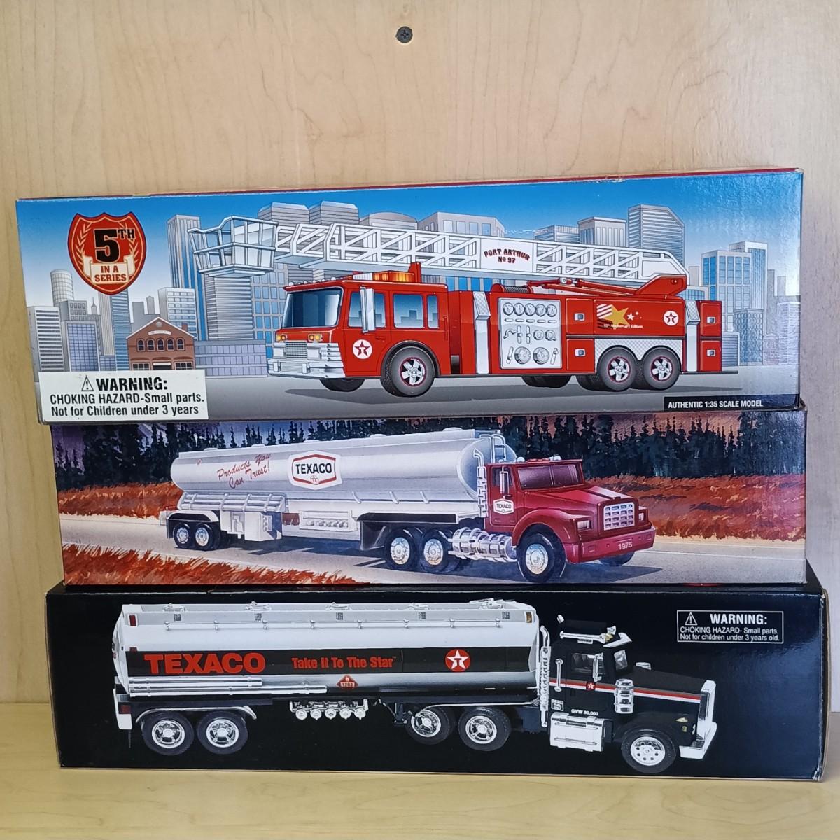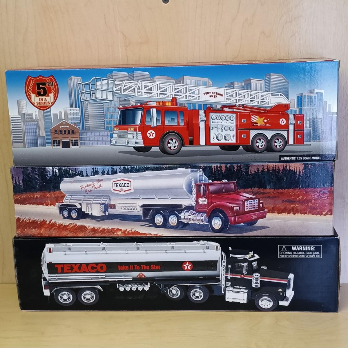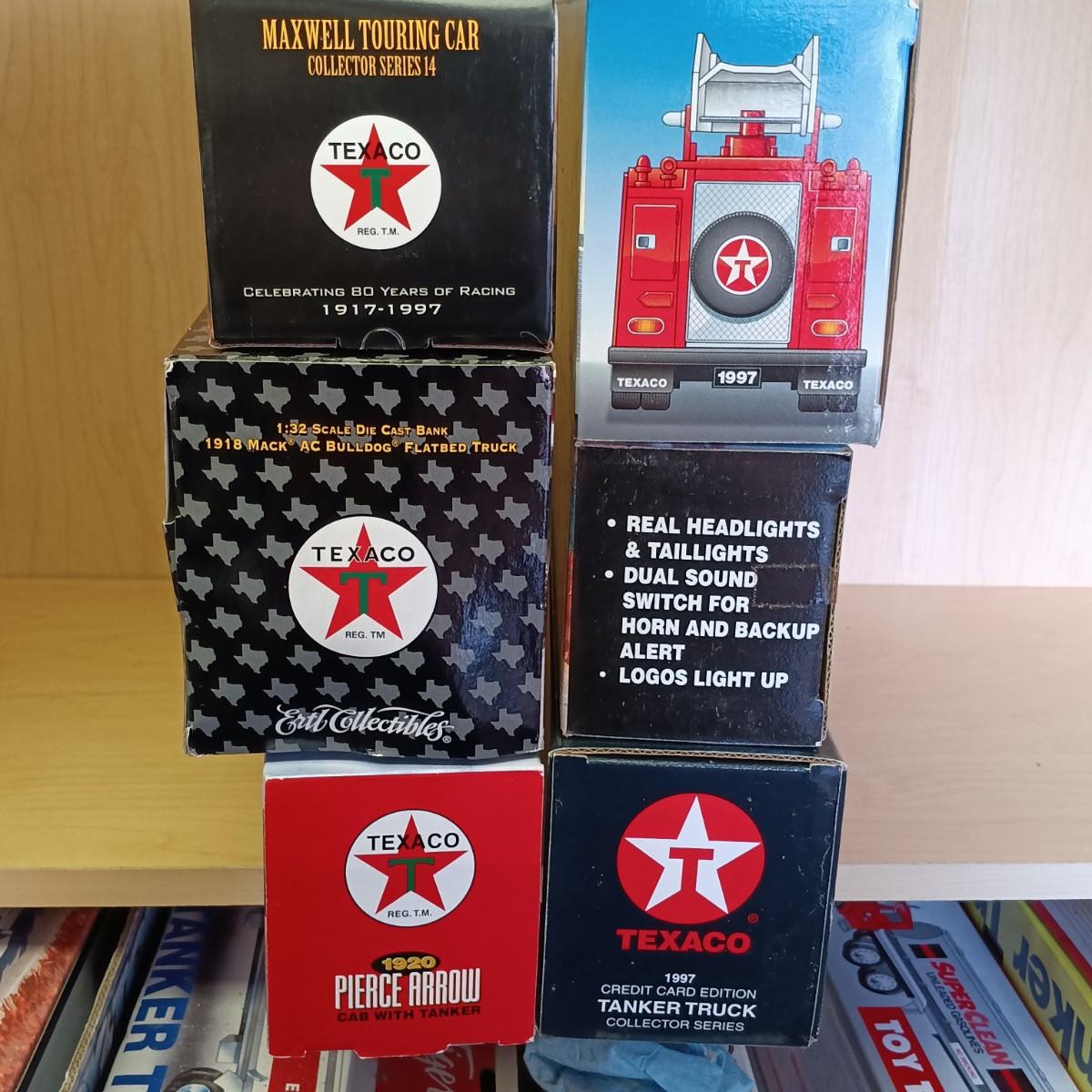 LOT 348: Texaco Toy Truck Collection: Collector Series 14 1997 Maxwell Touring Car, "1918" Mack "AC Bulldog" Flatbed Truck, & More