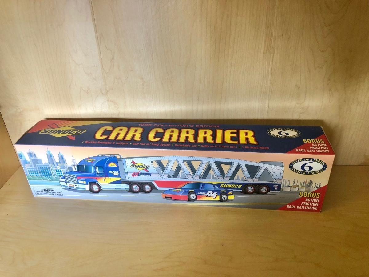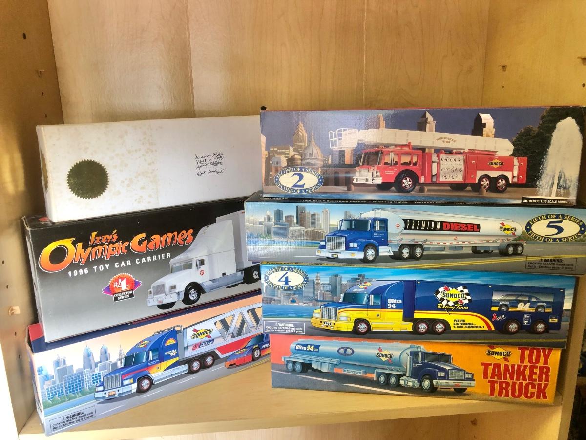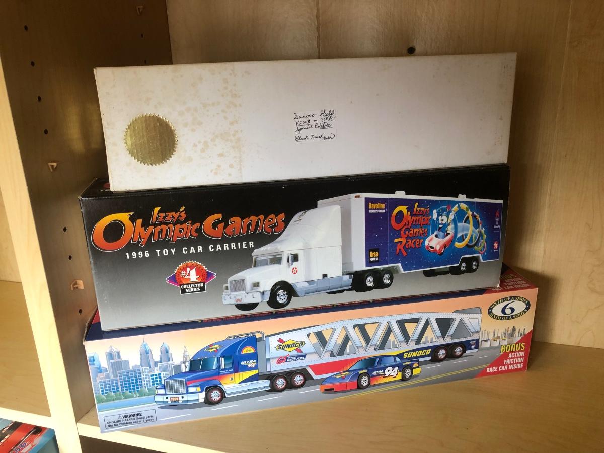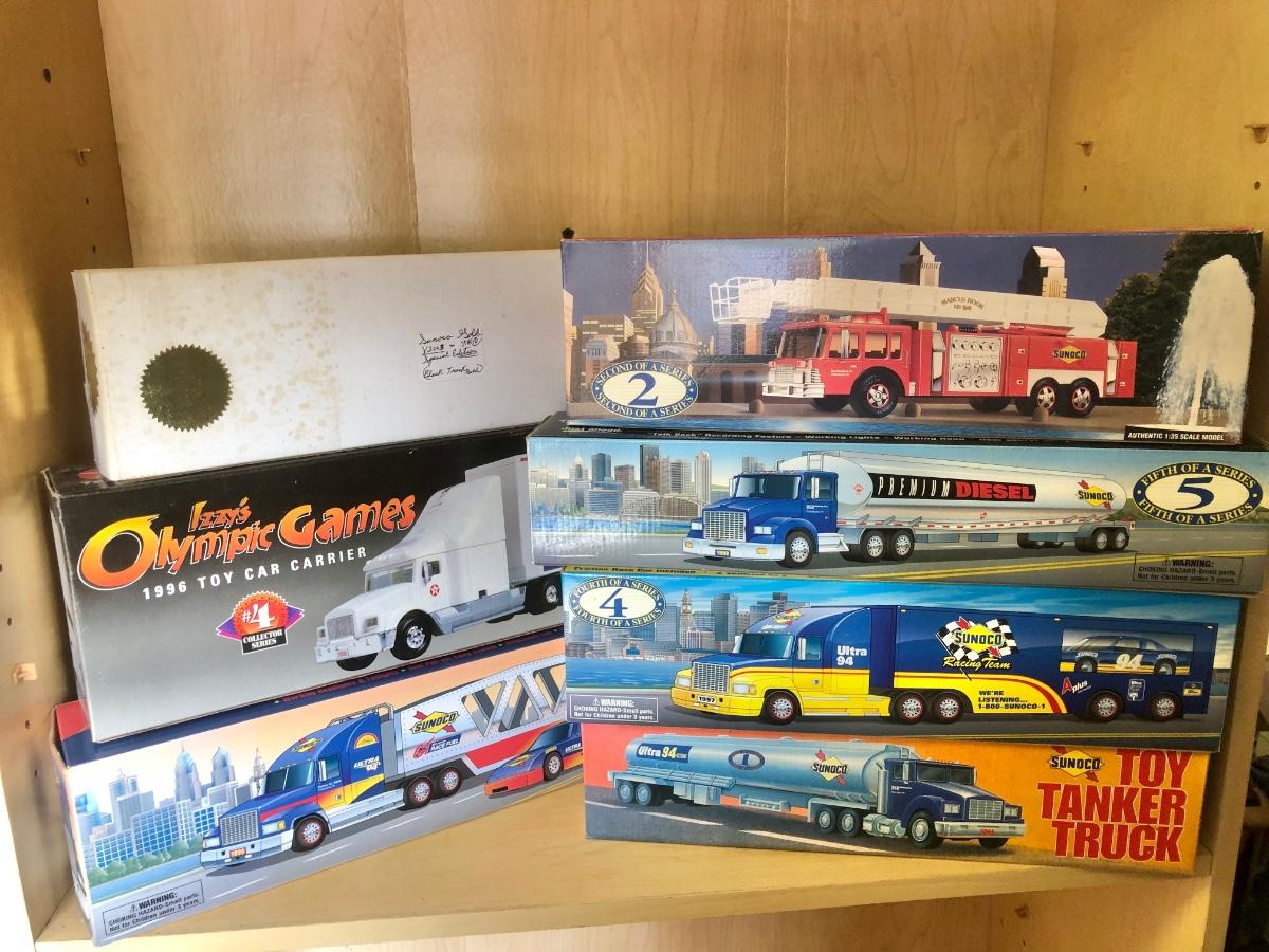 LOT 355: Sunoco 1999 Collector's Edition Car Carrier 6th in Series, Texaco 1996 Izzy's Olympic Games Toy Car Carrier, 10th Anniversary 2003 Serial Numbered Truck, Sunoco 1997 Racing Team Truck & More
