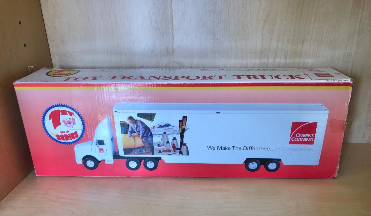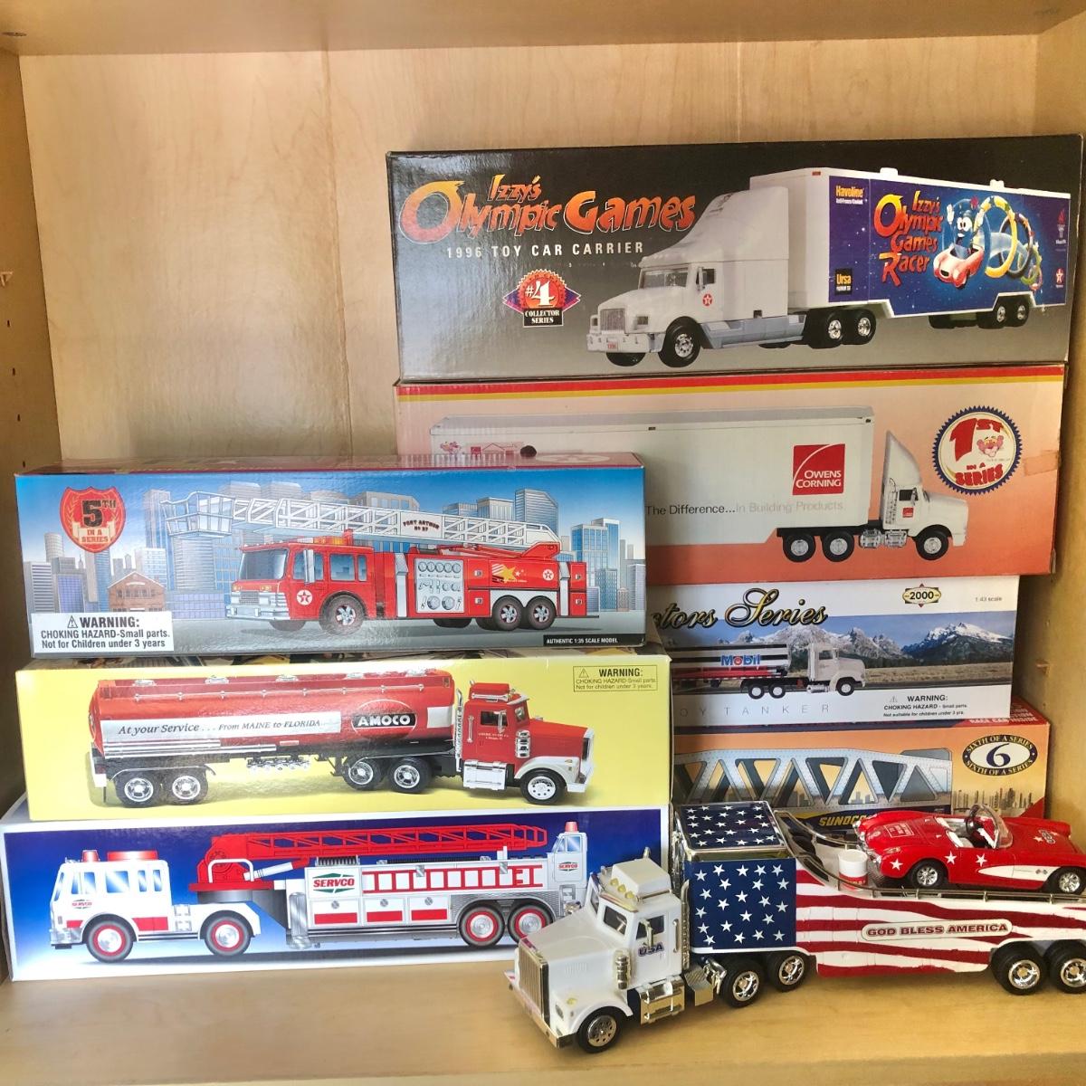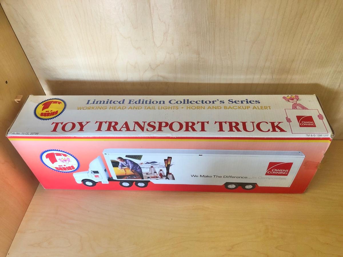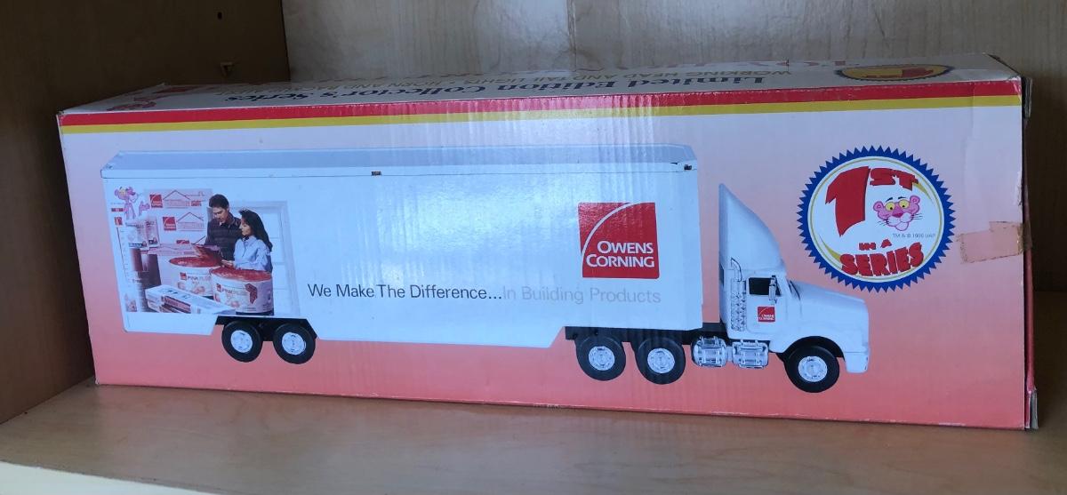 LOT 328: Collectible Toy Trucks - Pink Panther Owens Corning 1st in Series Transport Truck, Servco Fire Truck, Texaco Fire Truck, Sunoco Car Carrier & More