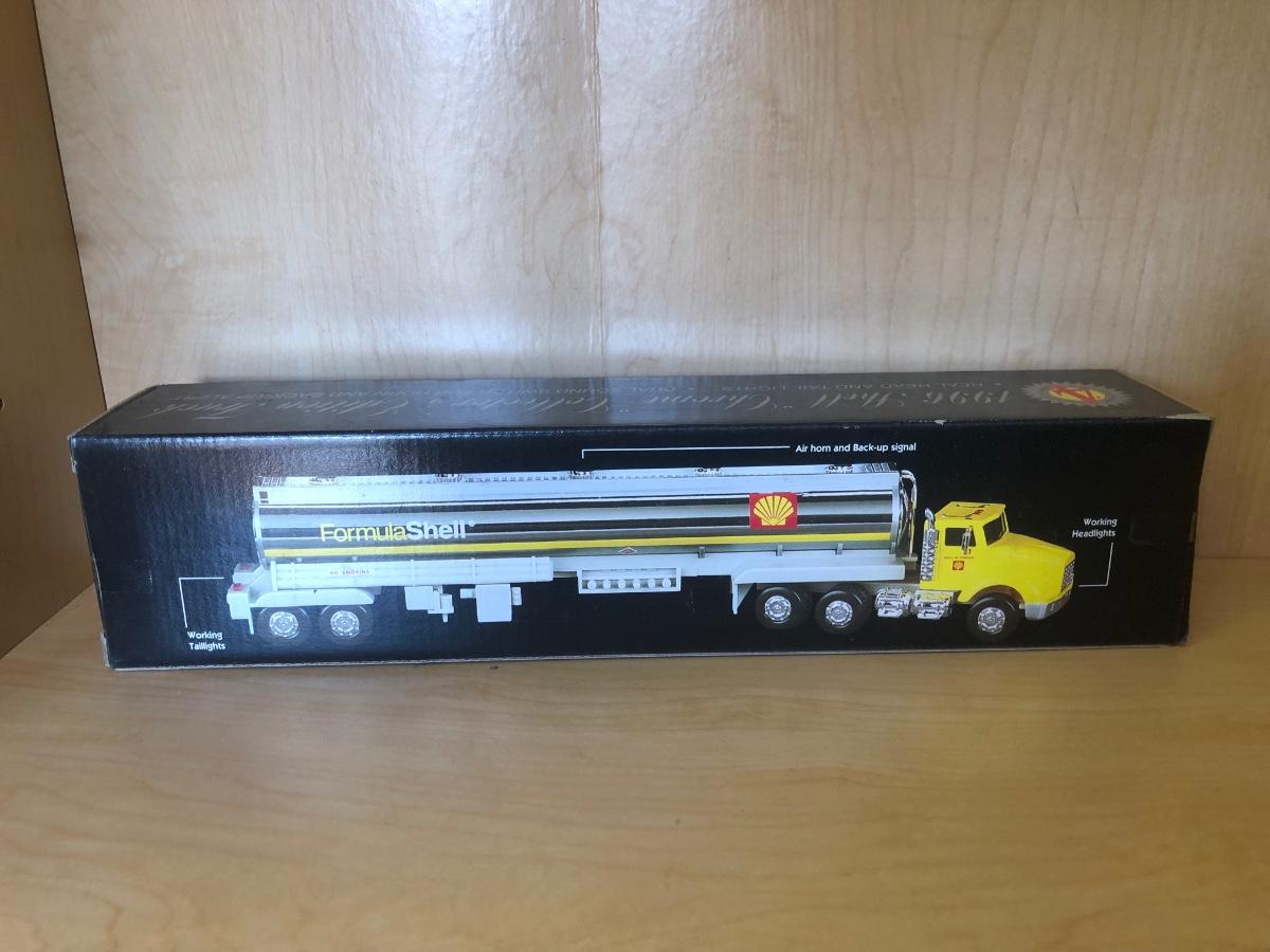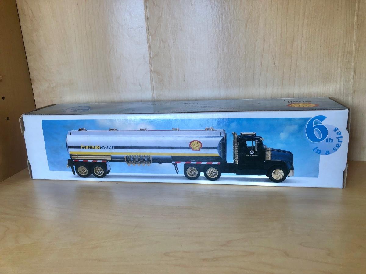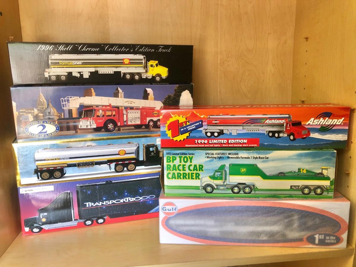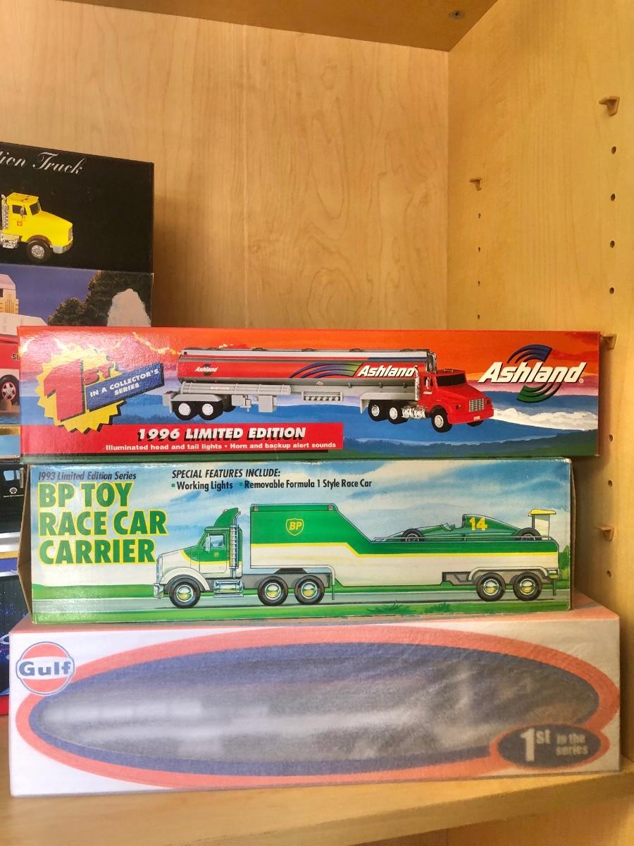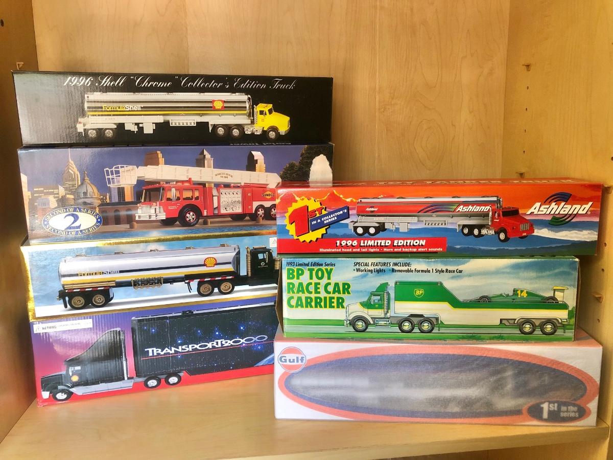 LOT 369: Collectible Trucks - Shell Transport 2000 Race Car Transporter, BP Race Car Carrier, Gulf Toy Tanker, 1996 Ashland Toy Tanker Truck & More