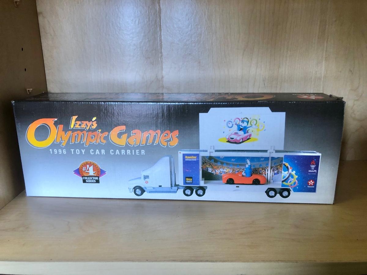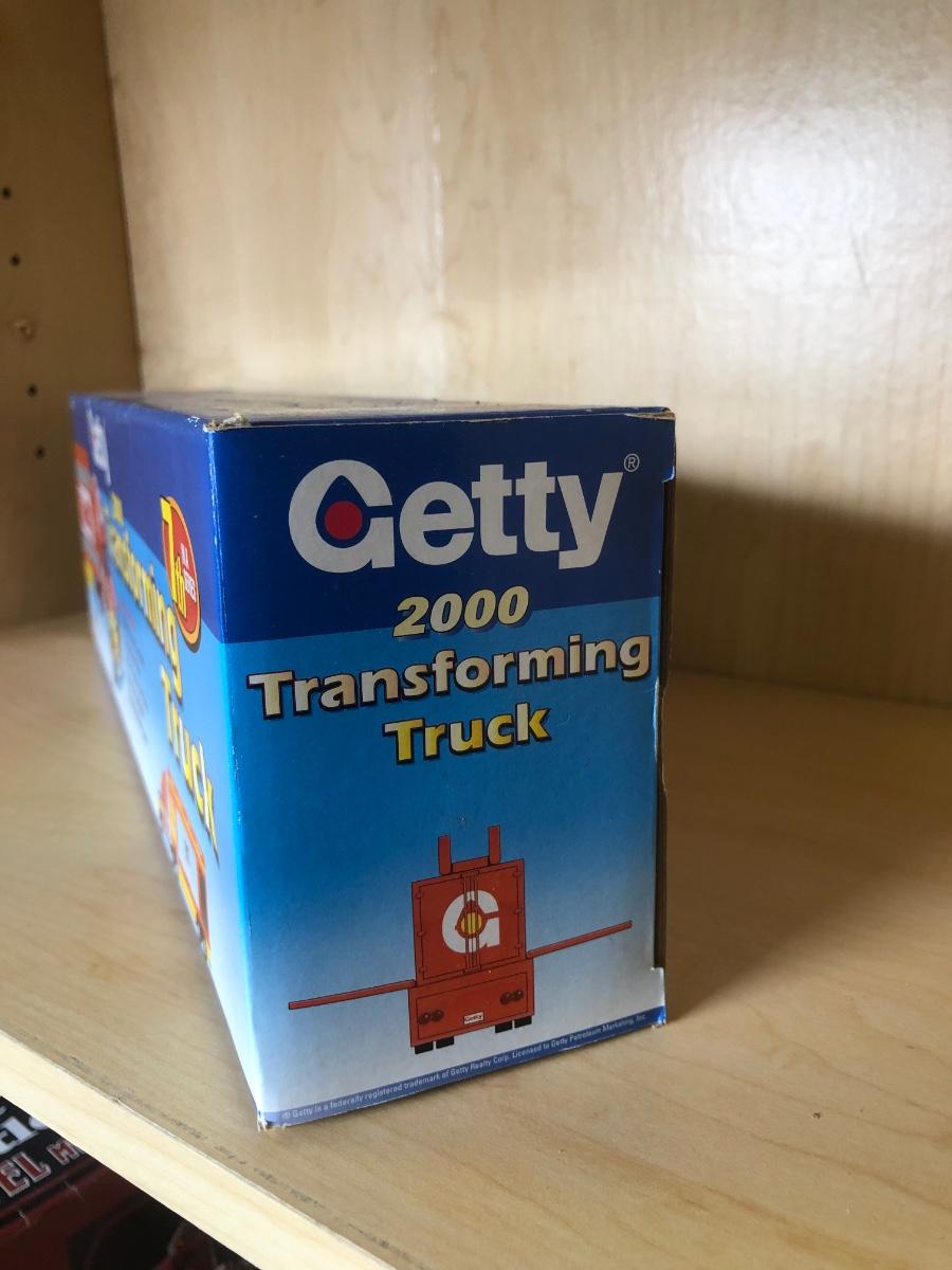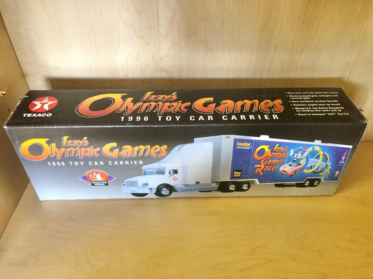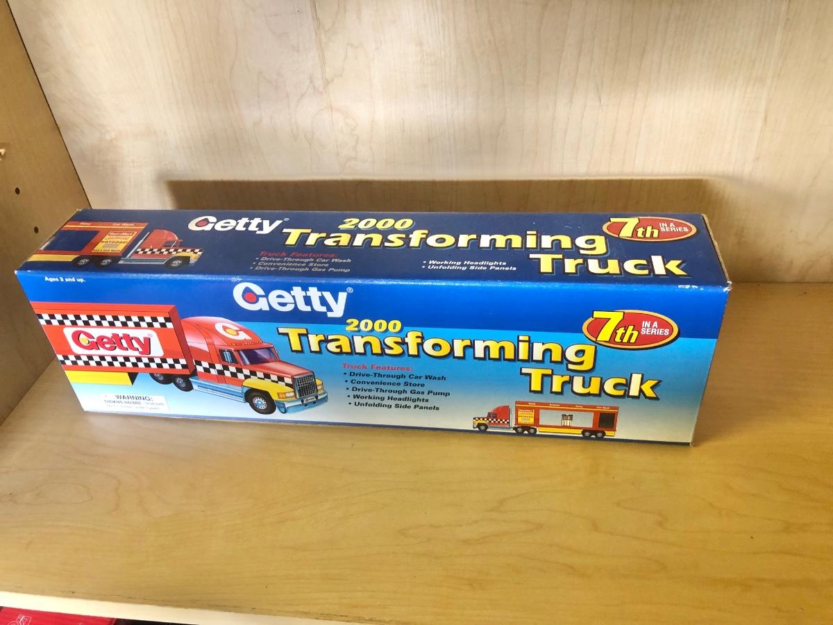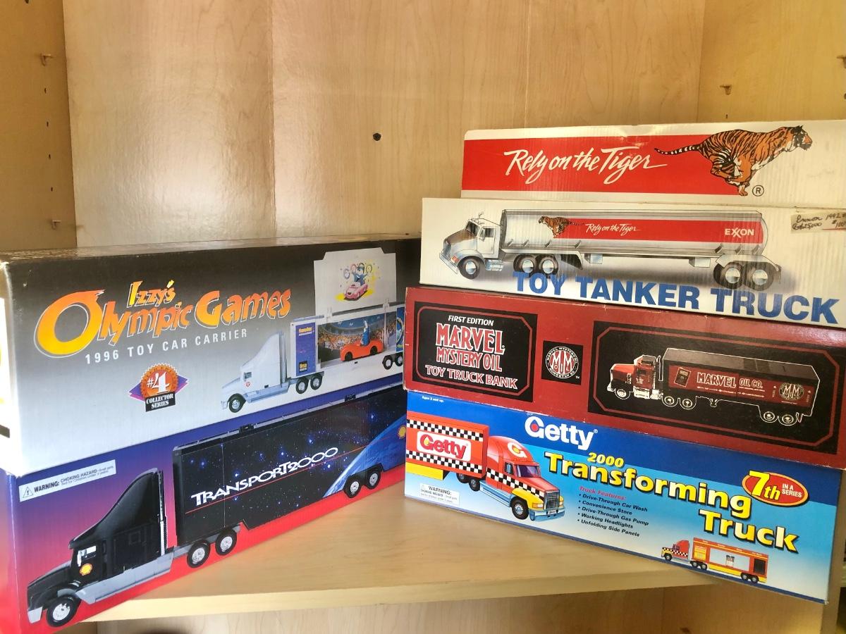 LOT 370: Collectible Trucks - 1st Edition Marvel Mystery Oil Truck Bank, Texaco Izzy’s Olympic Games 1996 Car Carrier, Shell Transport 2000 Race Car Transporter, 2000 Getty Transforming Truck & More