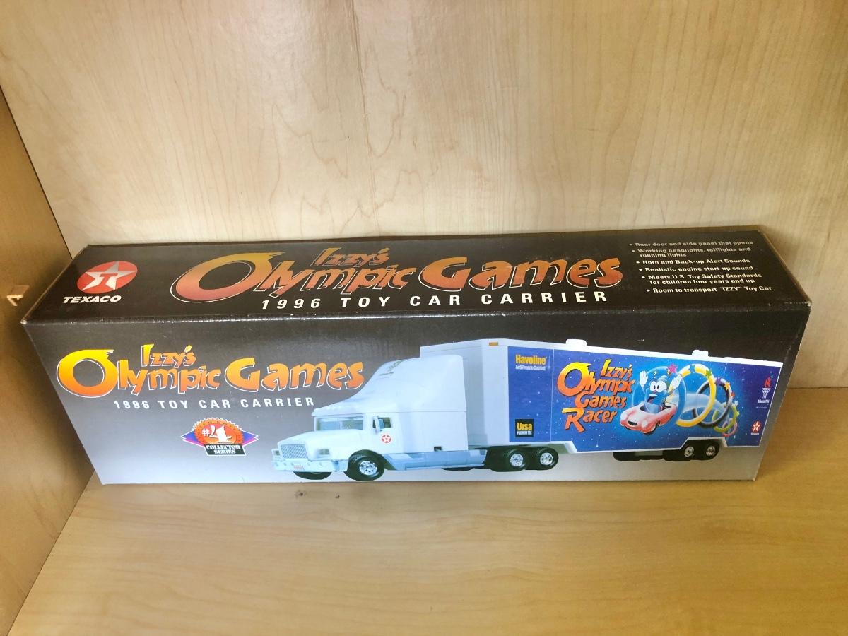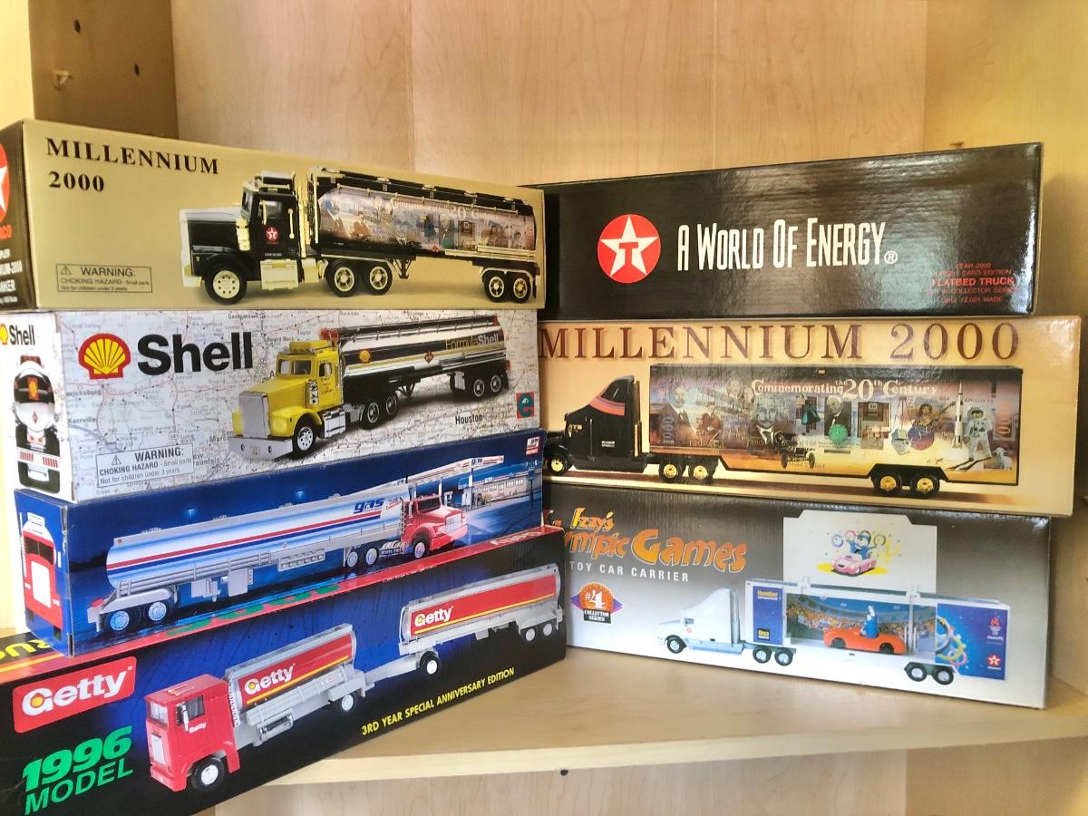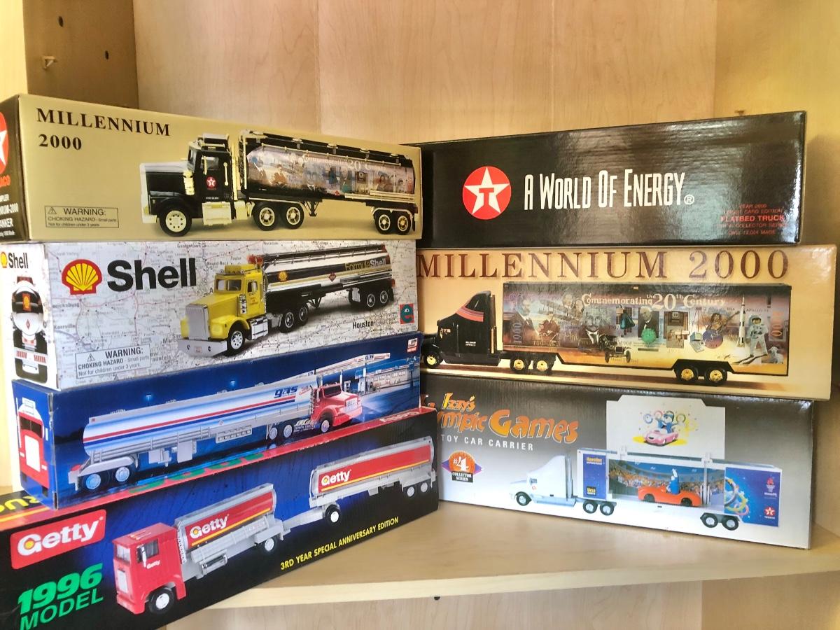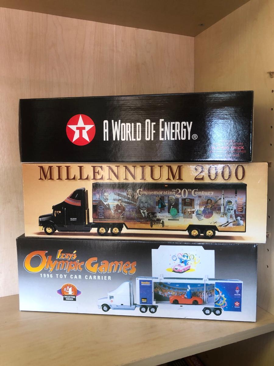 LOT 372: Collectible Trucks - Texaco Millennium Celebration Tanker, Texaco A World of Energy, Getty 1996 Model Tandem Tanker, Izzy’s Olympic Games 1996 Toy Car Carrier, Shell Tanker & More