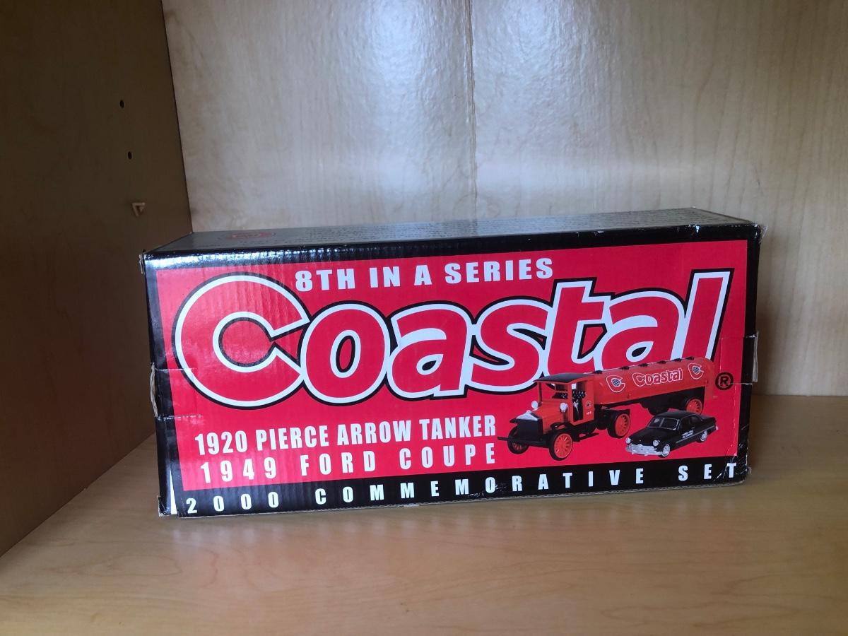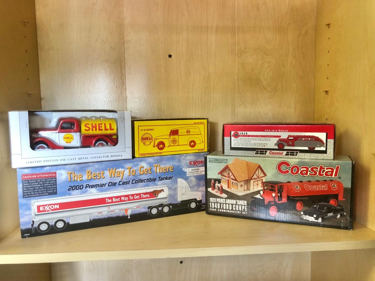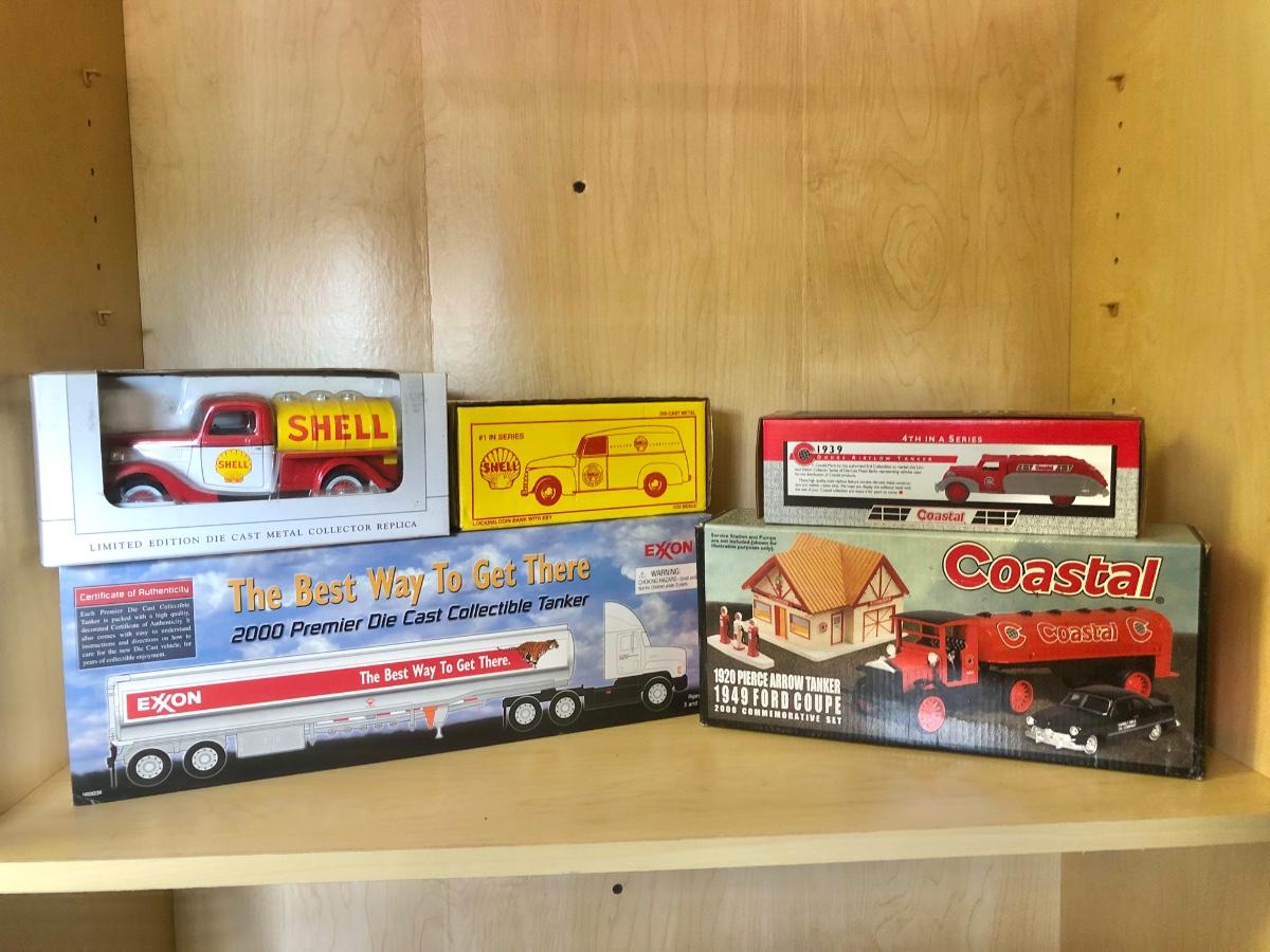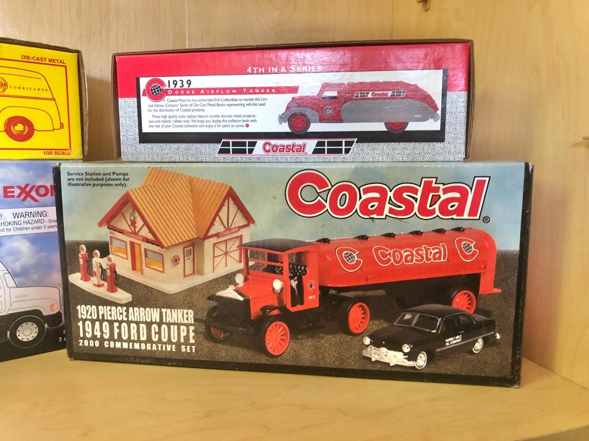 LOT 374: Die Cast Collectible Vehicles - Ertl Coastal 1939 Dodge Airflow Tanker, Shell Replicas, Coastal 1920 Pierce Arrow Tanker & 1949 Ford Coupe & Exxon 2000 Die Cast Tanker
