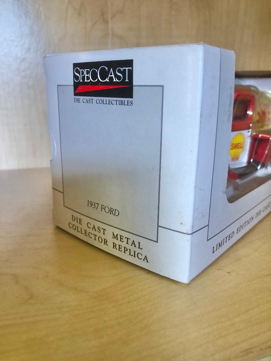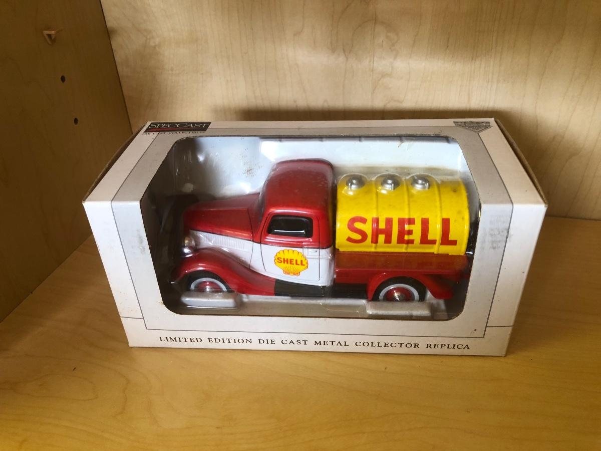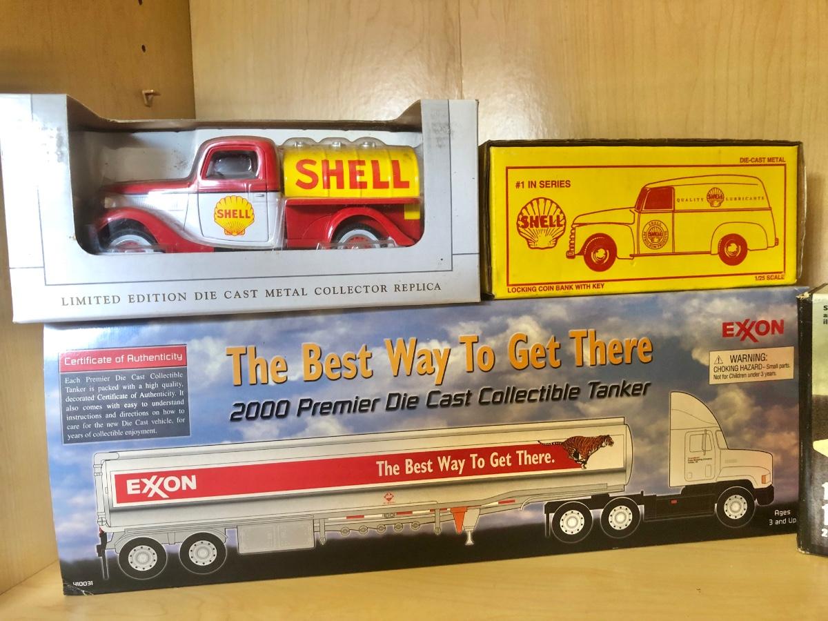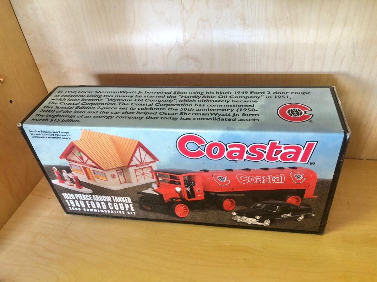 LOT 374: Die Cast Collectible Vehicles - Ertl Coastal 1939 Dodge Airflow Tanker, Shell Replicas, Coastal 1920 Pierce Arrow Tanker & 1949 Ford Coupe & Exxon 2000 Die Cast Tanker