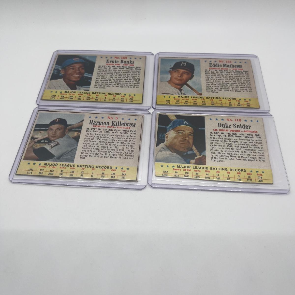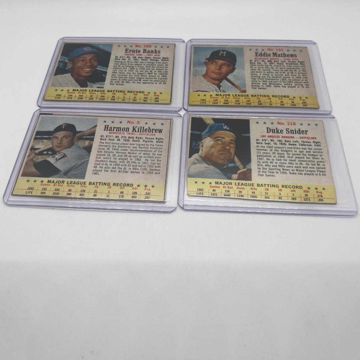 LOT 100: 4 1963 Post Cereal Ernie Banks, Eddie Matthews, Harmon Killebrew, Duke Snider cards