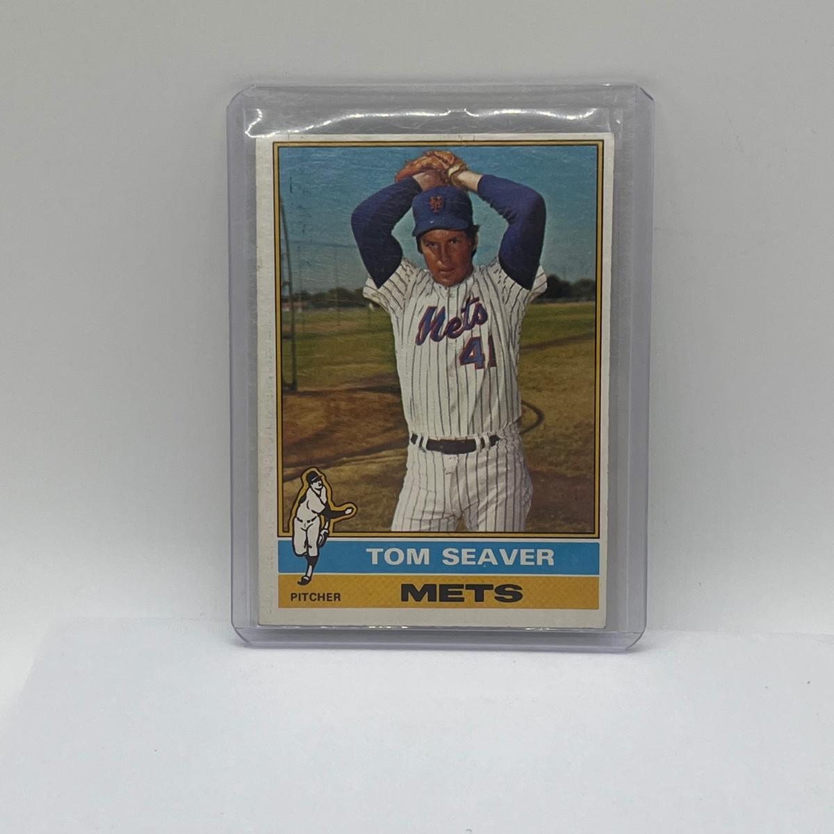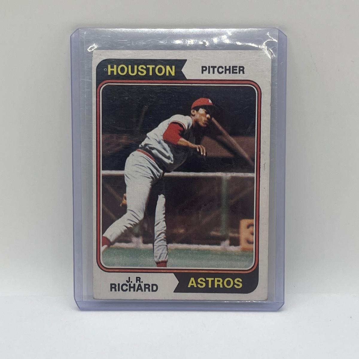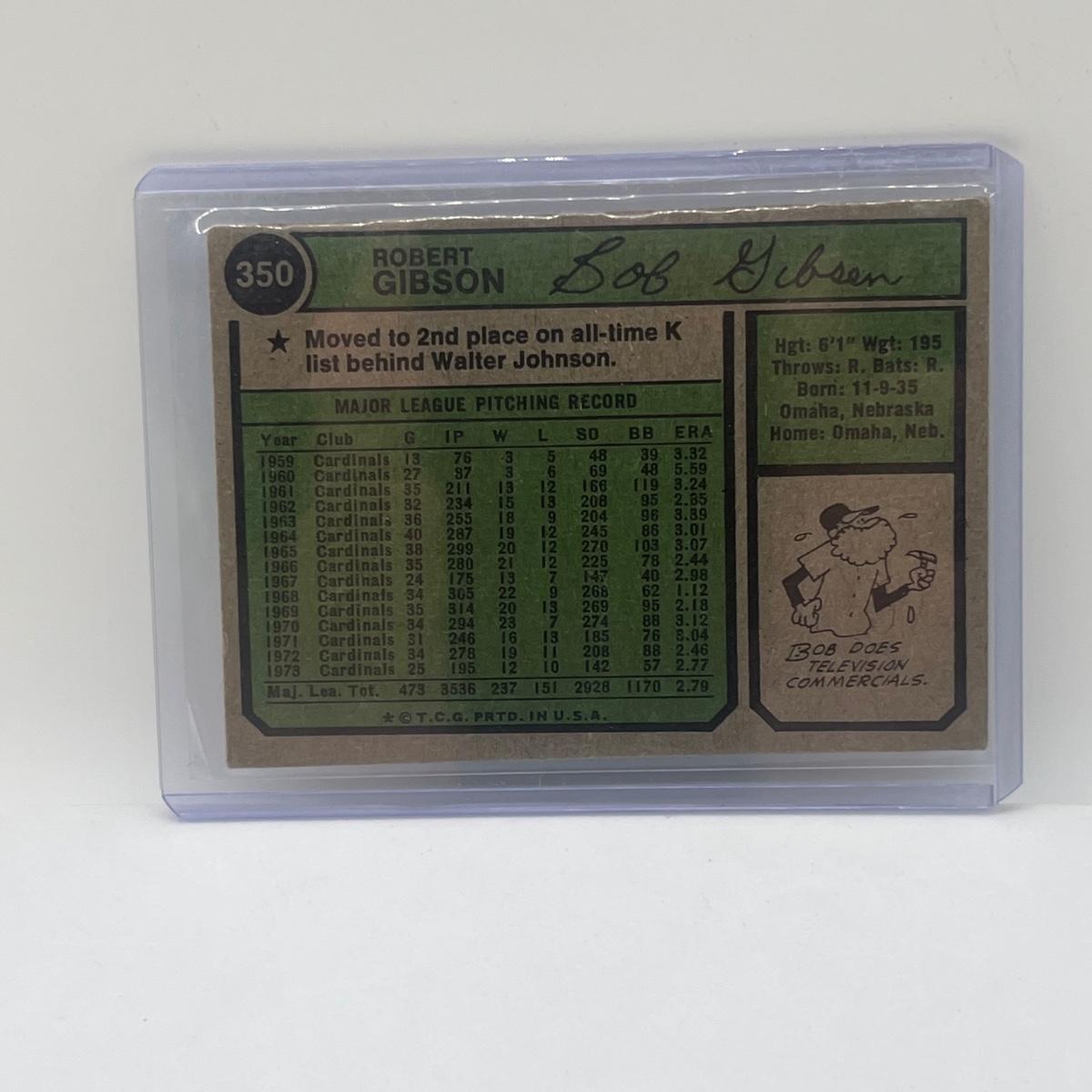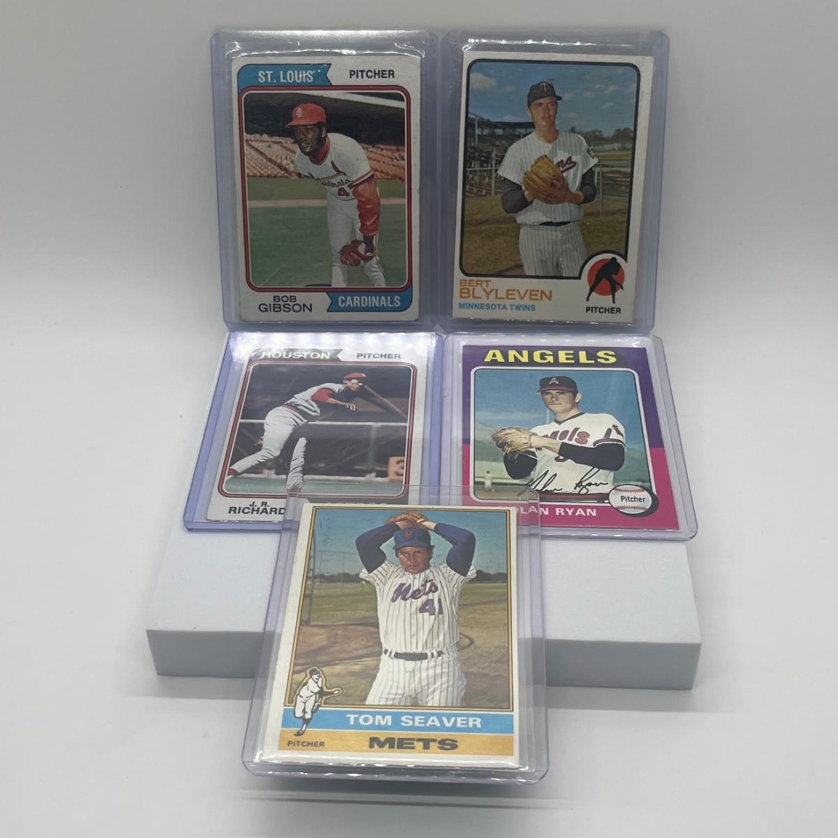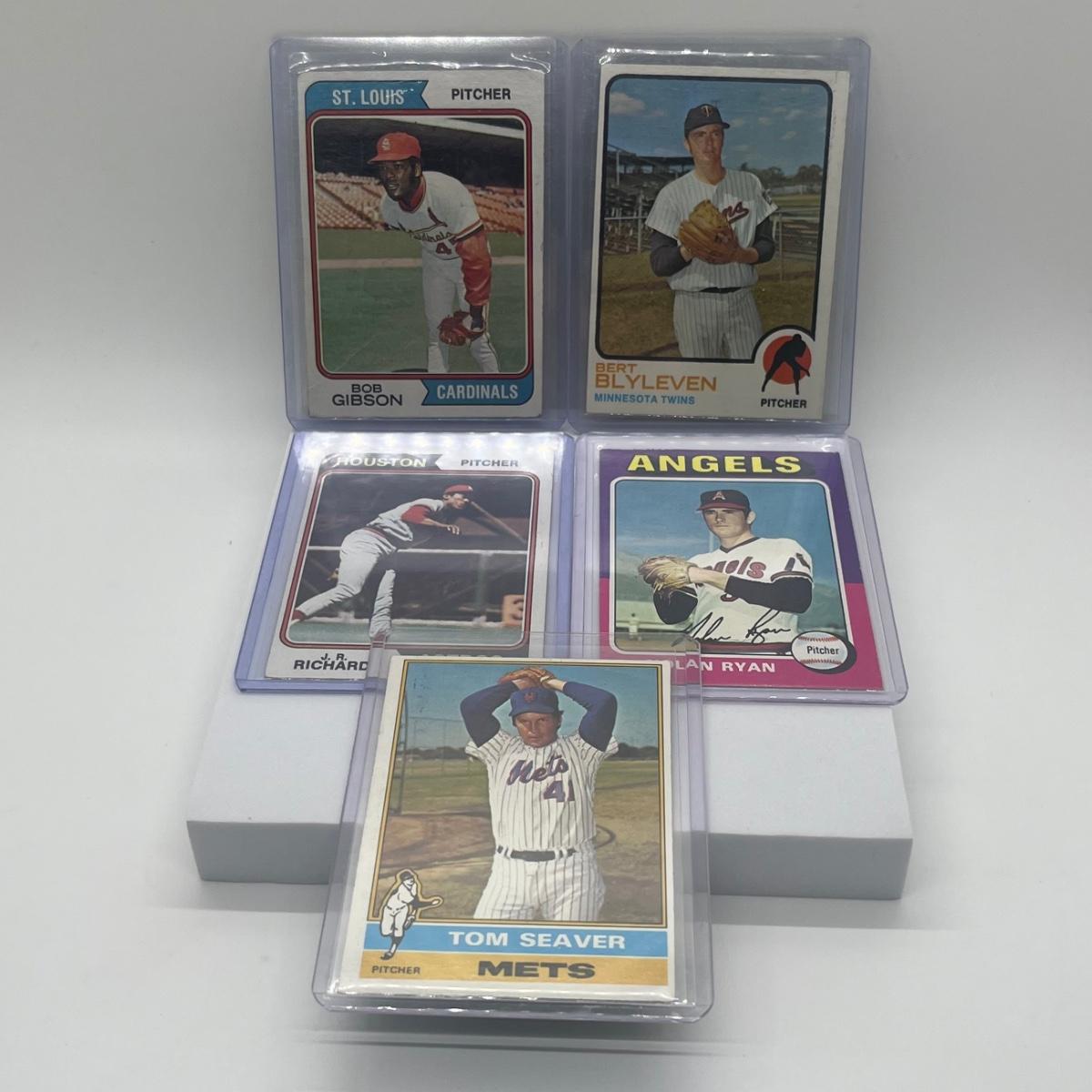 LOT 103: 1974 Topps Bob Gibson, 1975 Topps Nolan Ryan, 1974 Topps J.R. Richards. 1973 Topps Bert Blyleven, 1976 Topps Tom Seaver