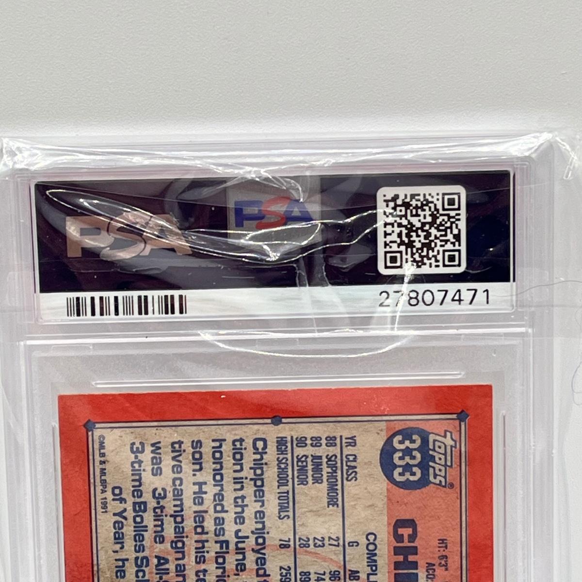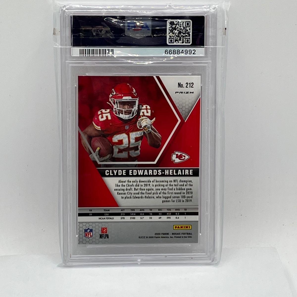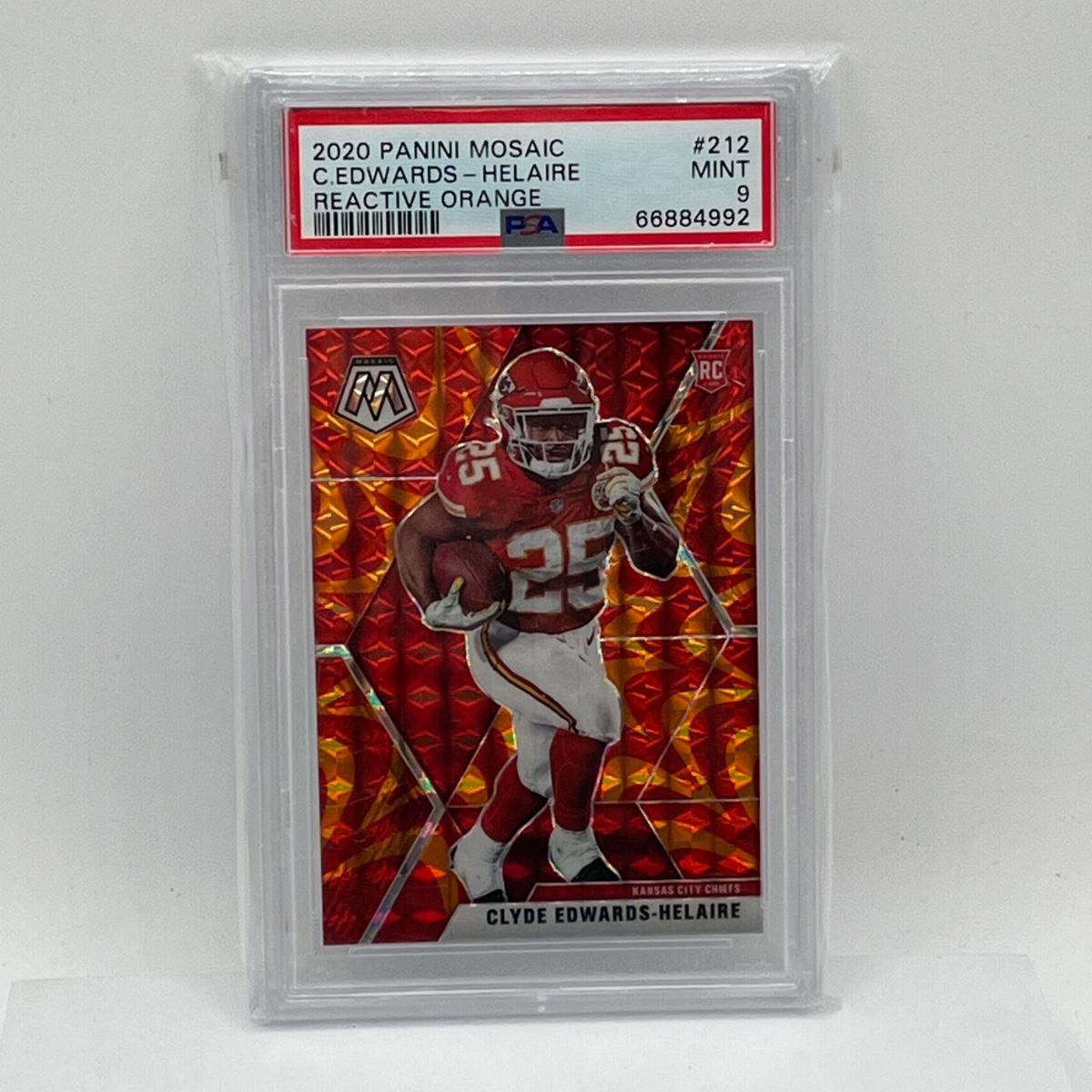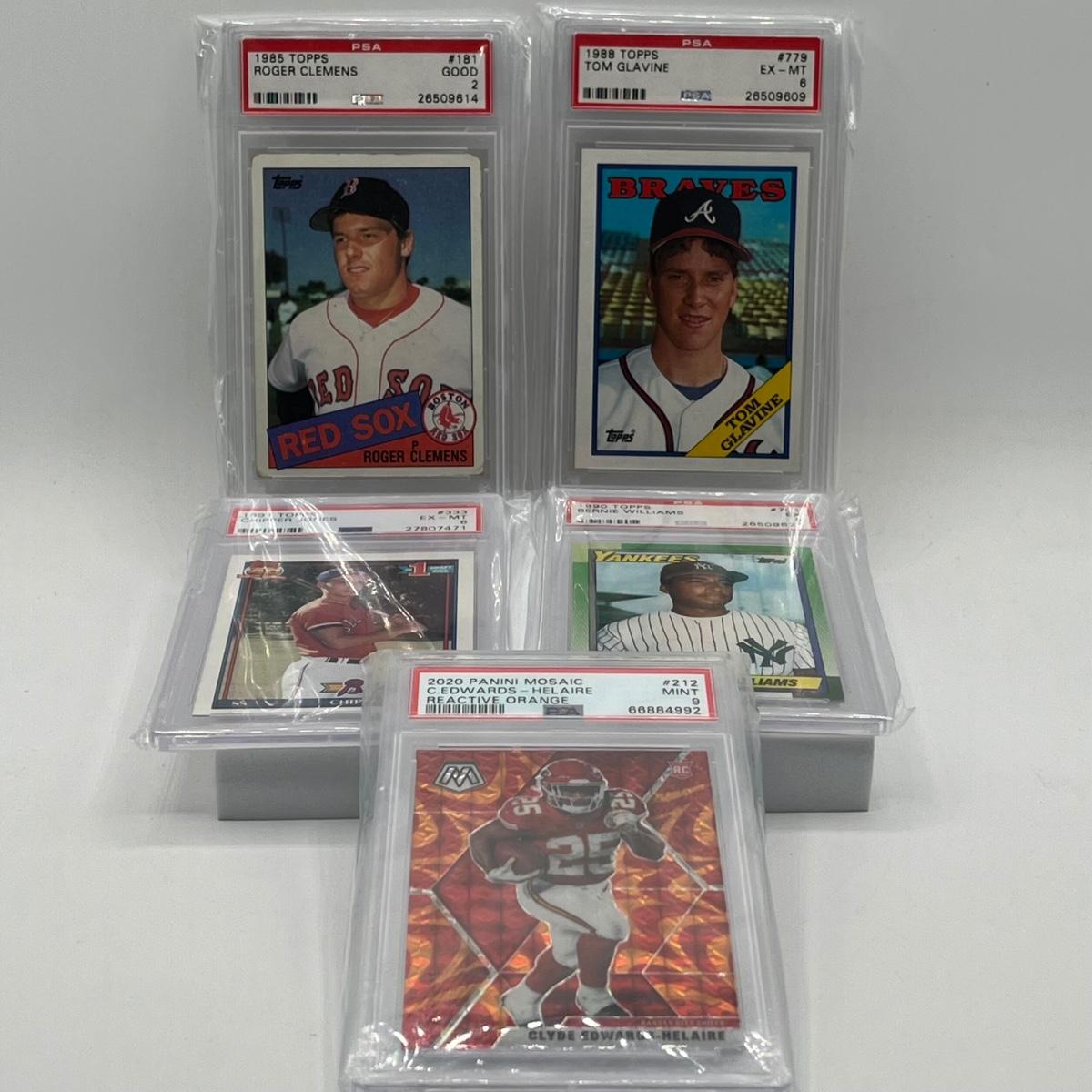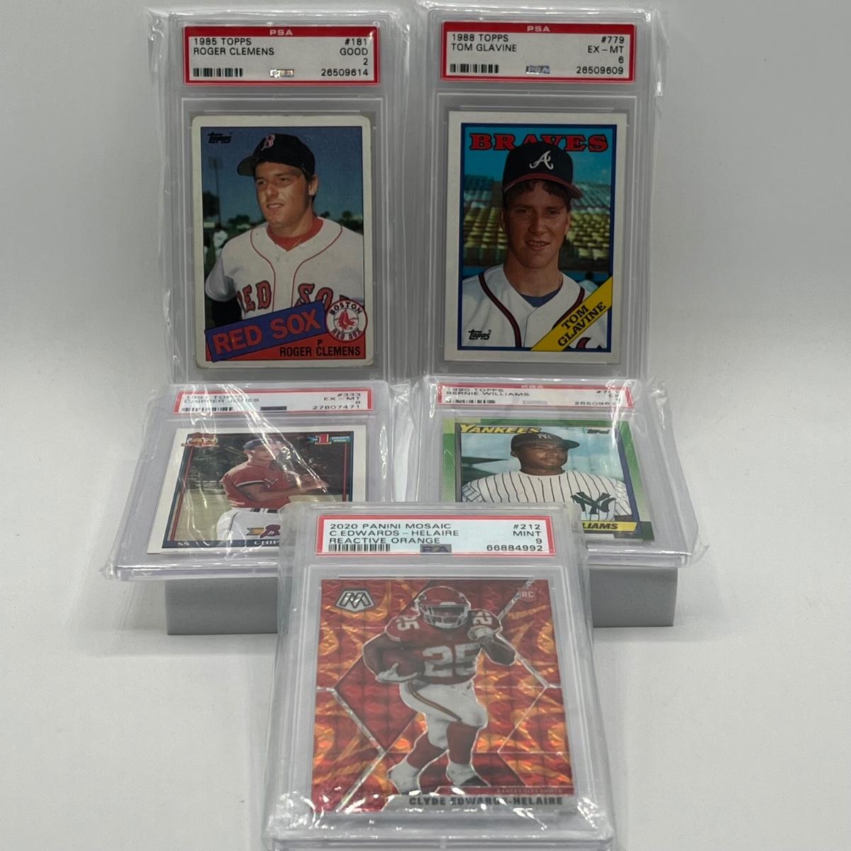 LOT 123: Four PSA Graded Topps Rookie Baseball Cards - Roger Clemens, Tom Glavine, Bernie Williams, Chipper Jones - Plus Clyde Edwards-Helaire 2020 Panini Mosaic Football Card - Mint 9
