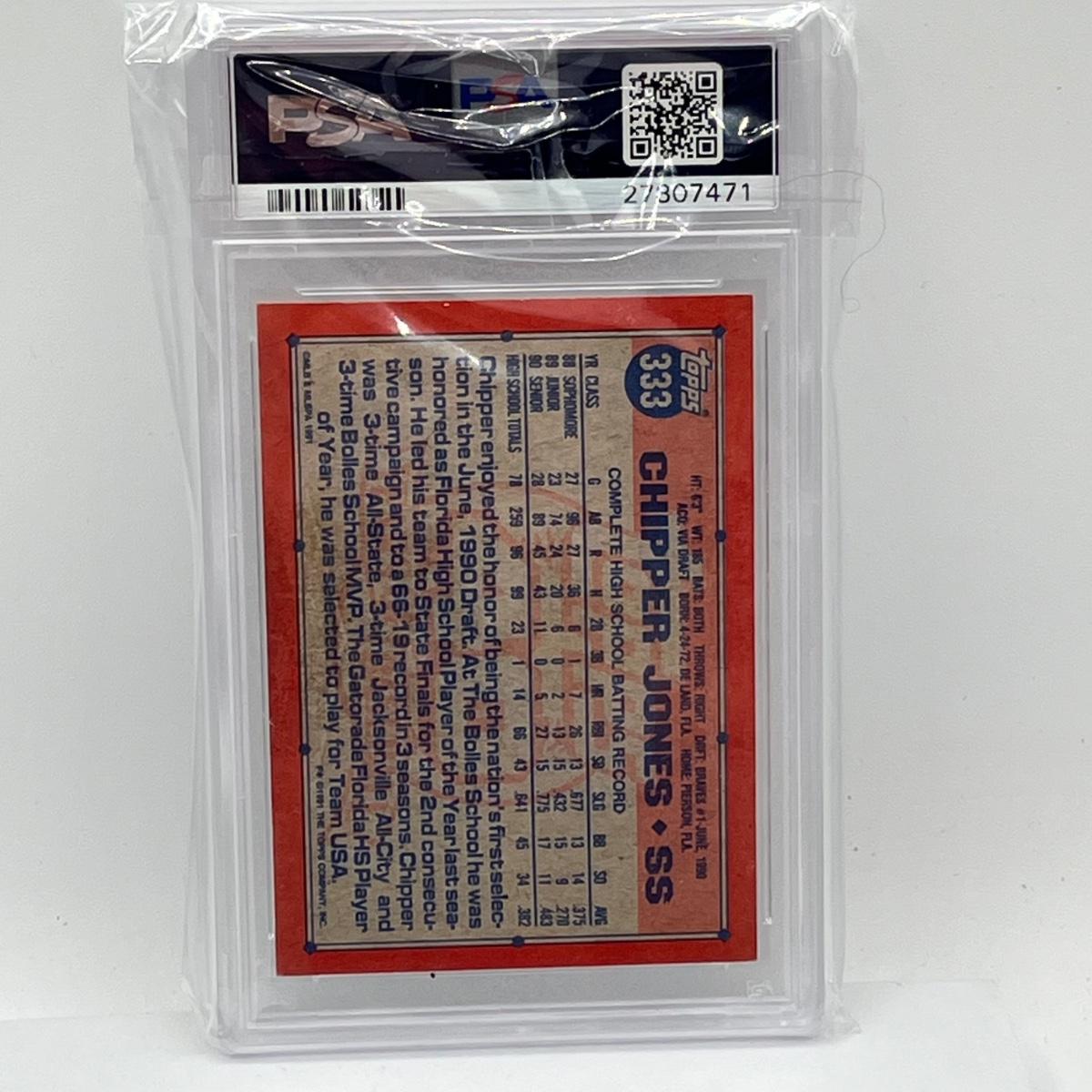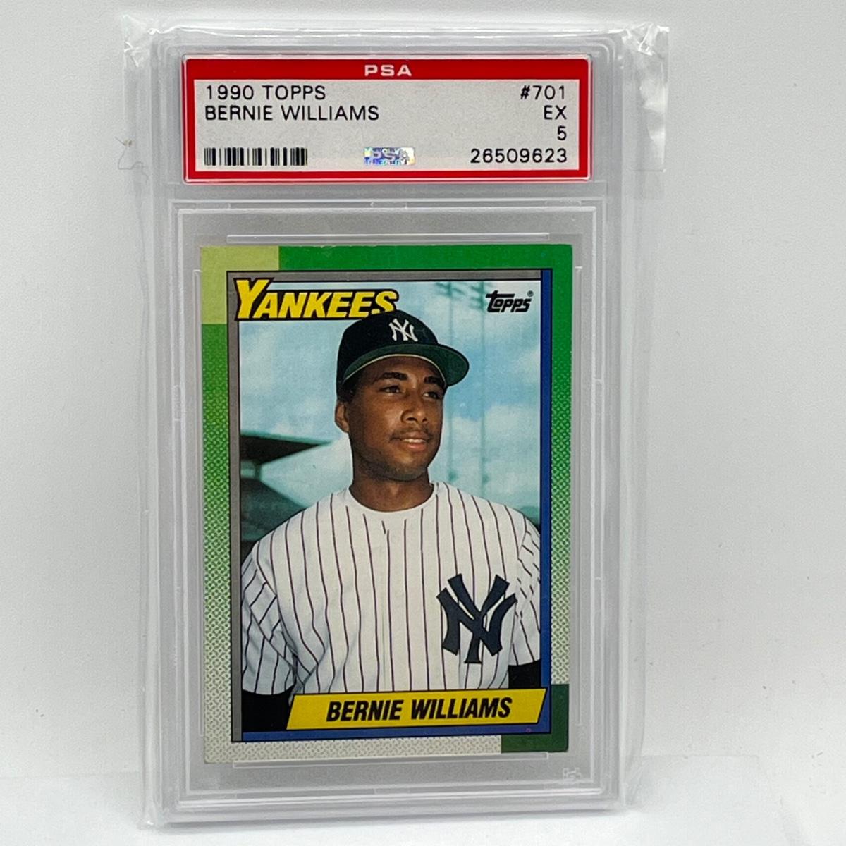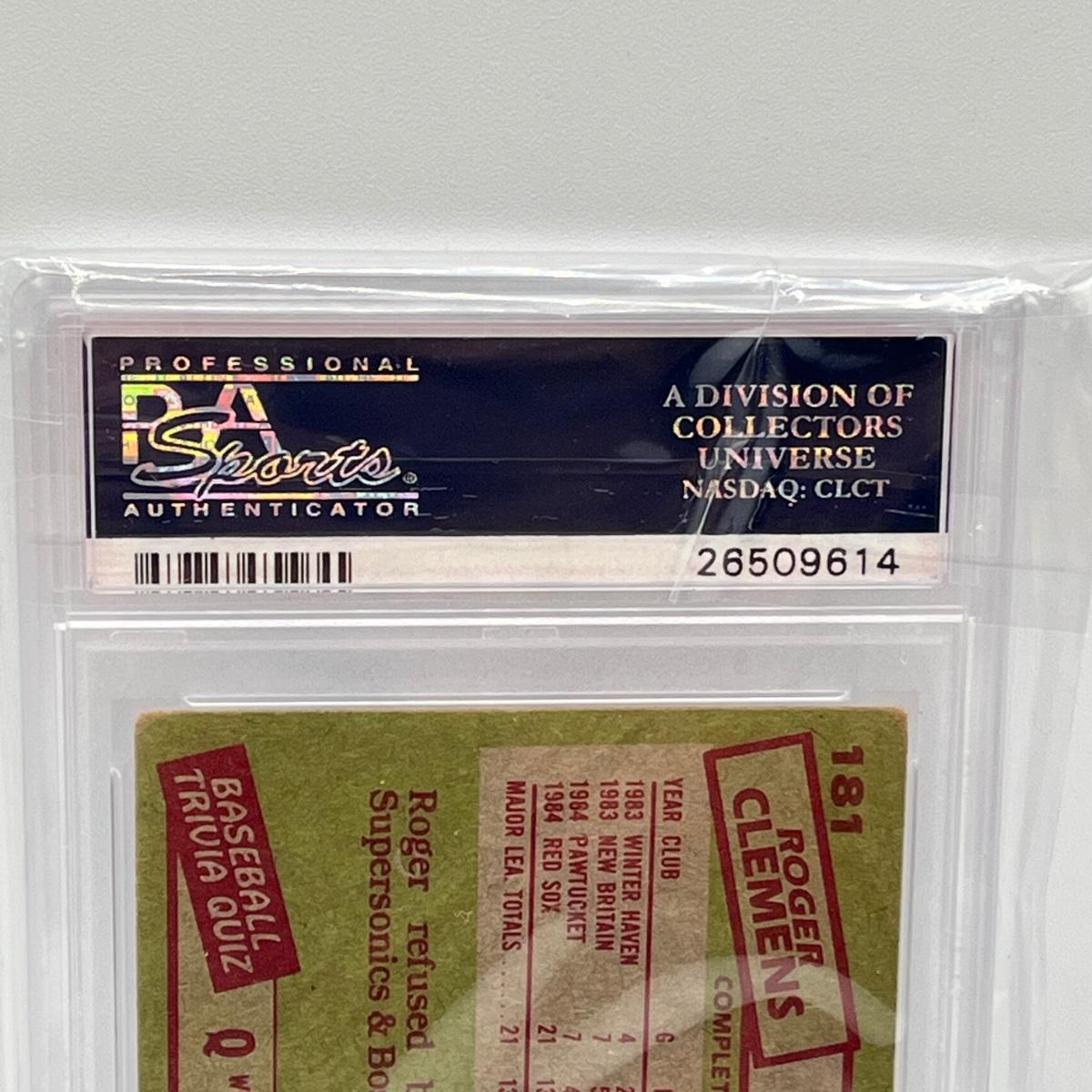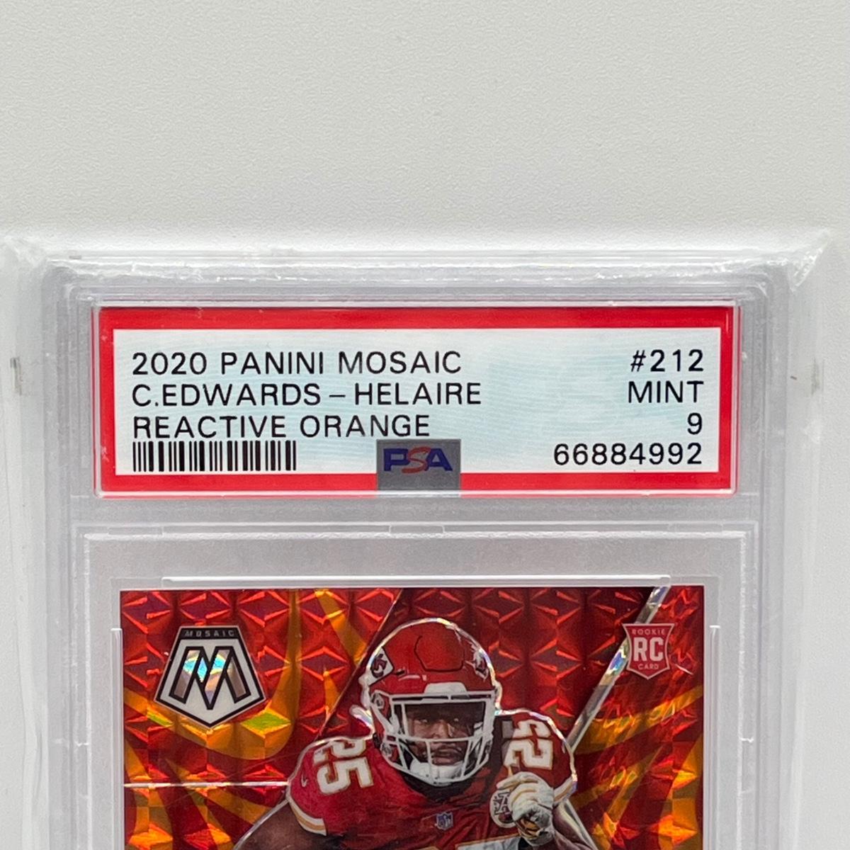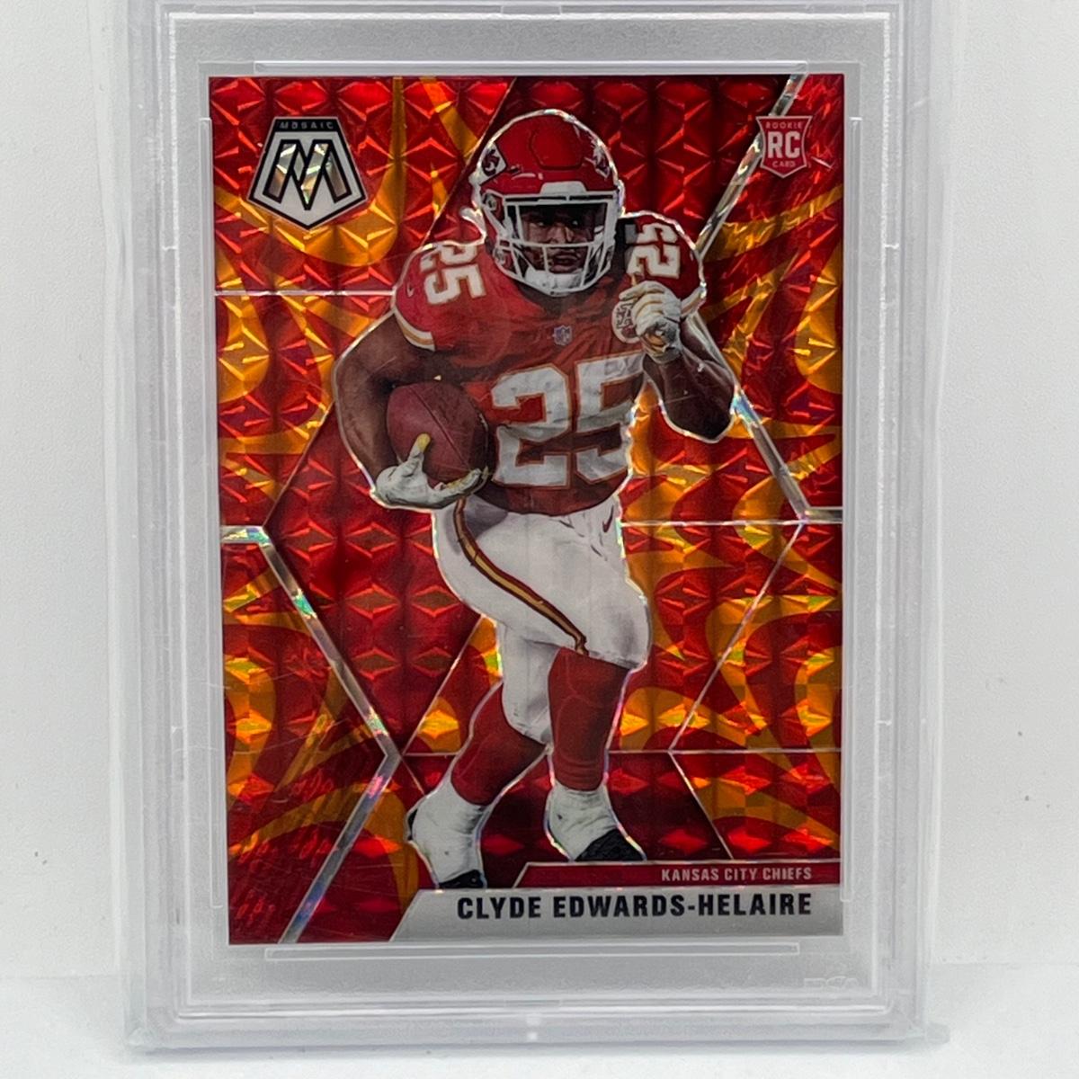 LOT 123: Four PSA Graded Topps Rookie Baseball Cards - Roger Clemens, Tom Glavine, Bernie Williams, Chipper Jones - Plus Clyde Edwards-Helaire 2020 Panini Mosaic Football Card - Mint 9