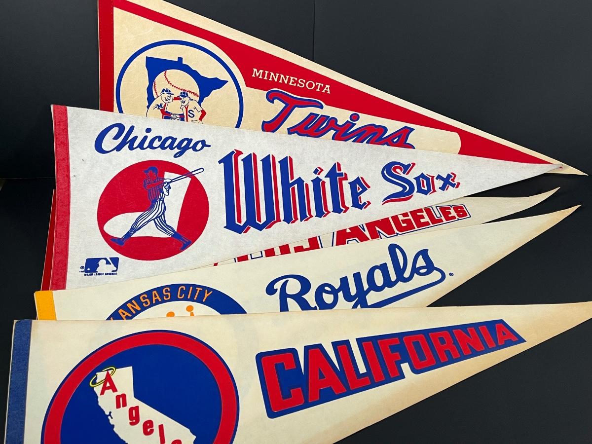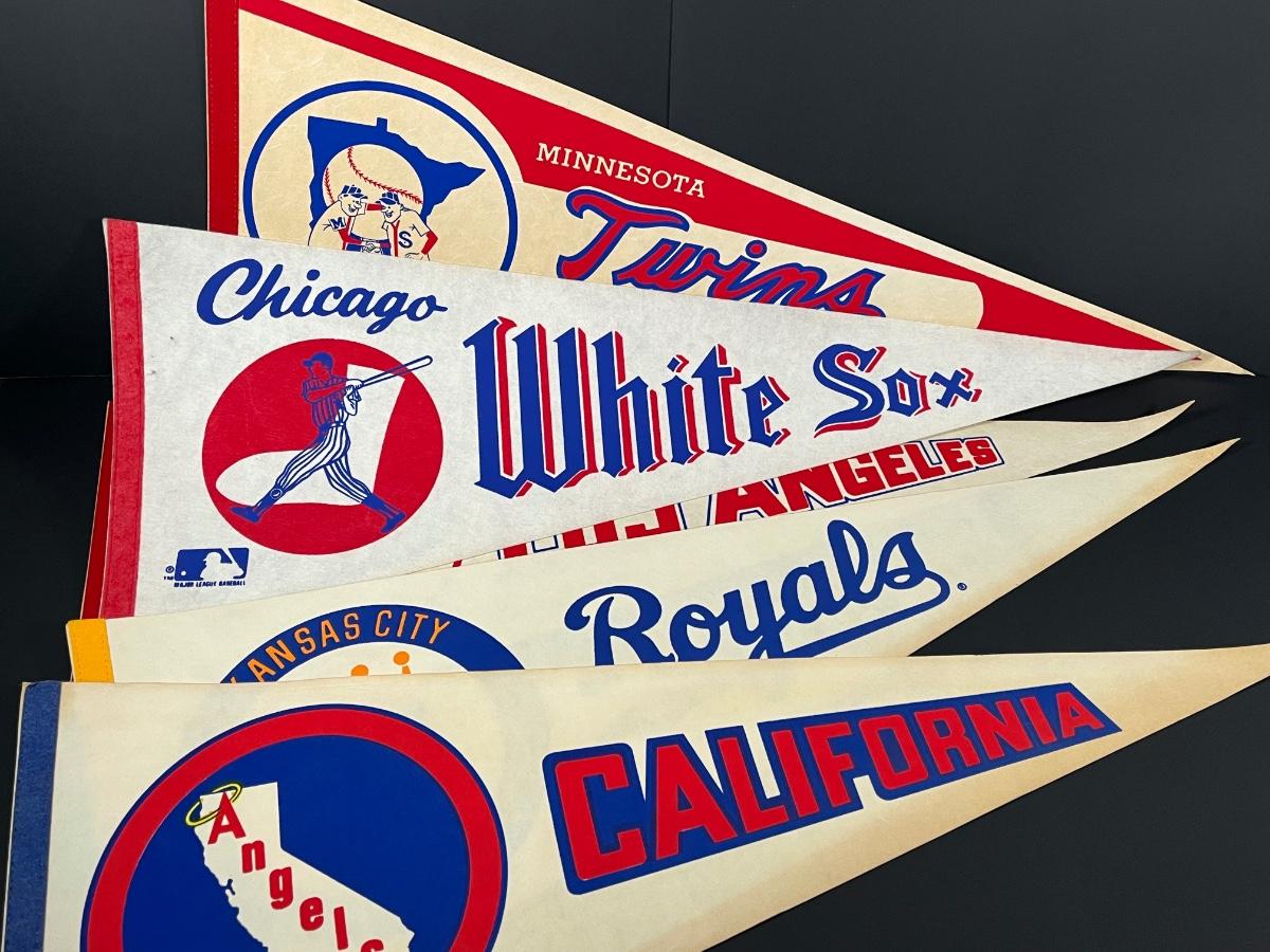 LOT 302: Vintage Baseball Pennants - Dodgers, Royals, White Sox, Angels, Twins