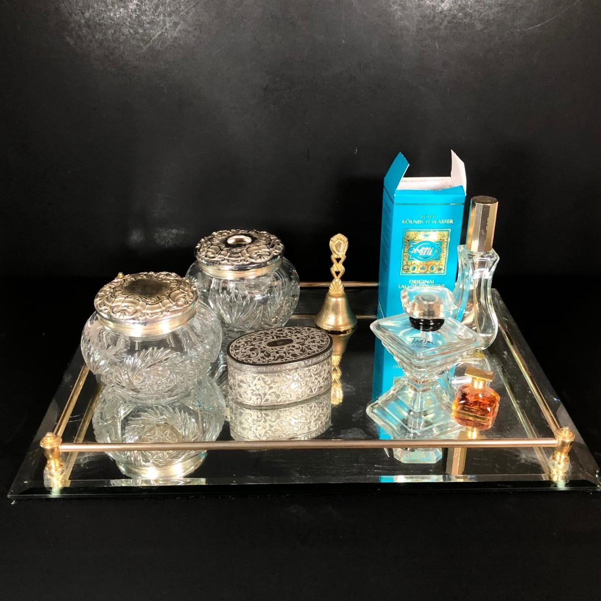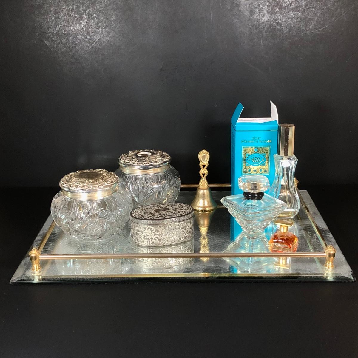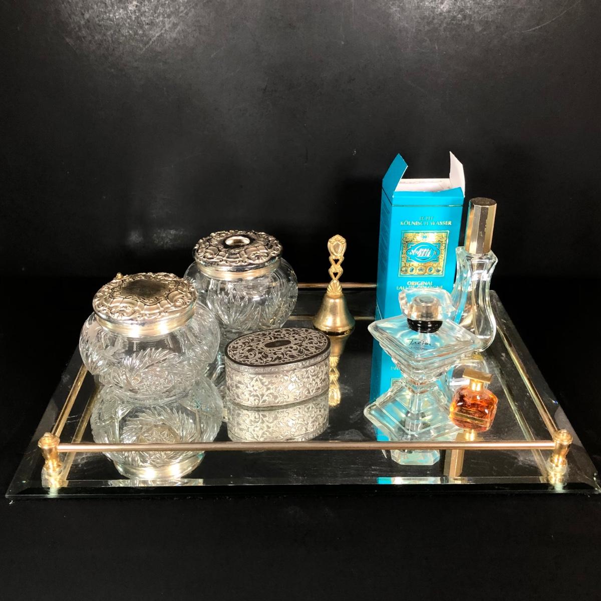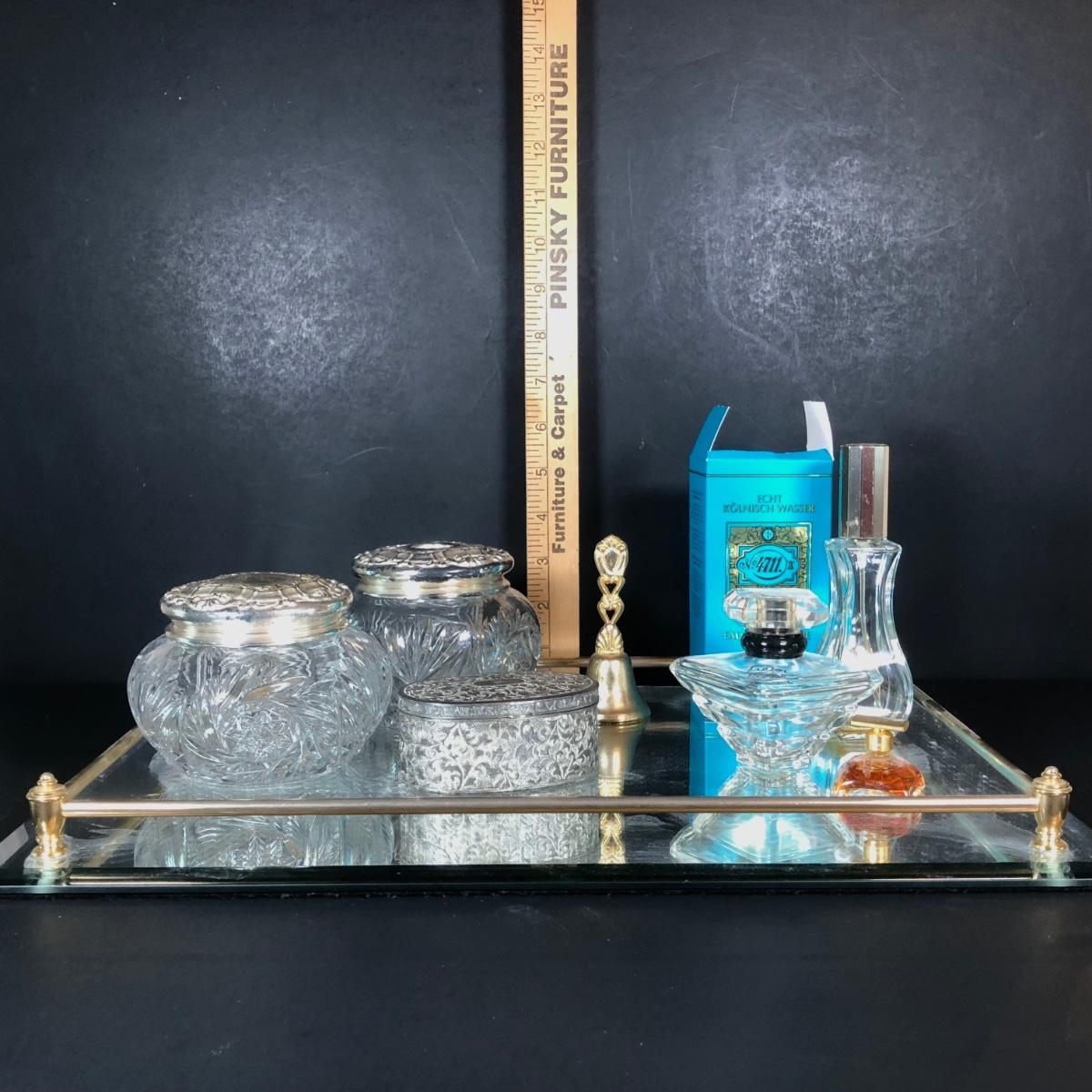 LOT 14L: Vintage Vanity Collection w/ Mirrored Tray, Perfume Bottles & More