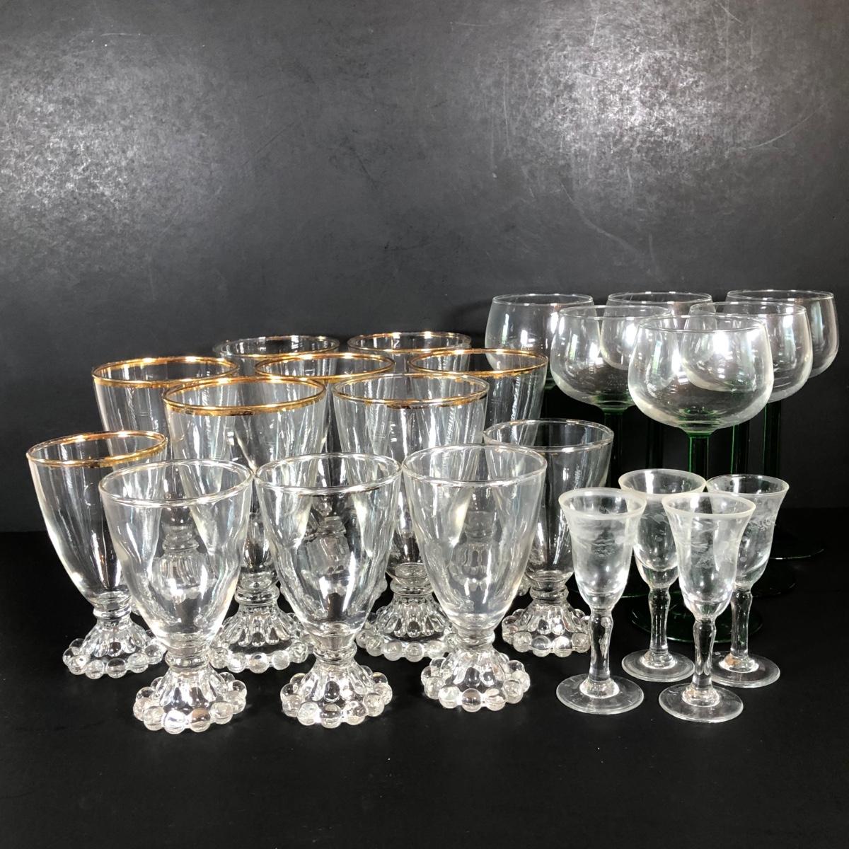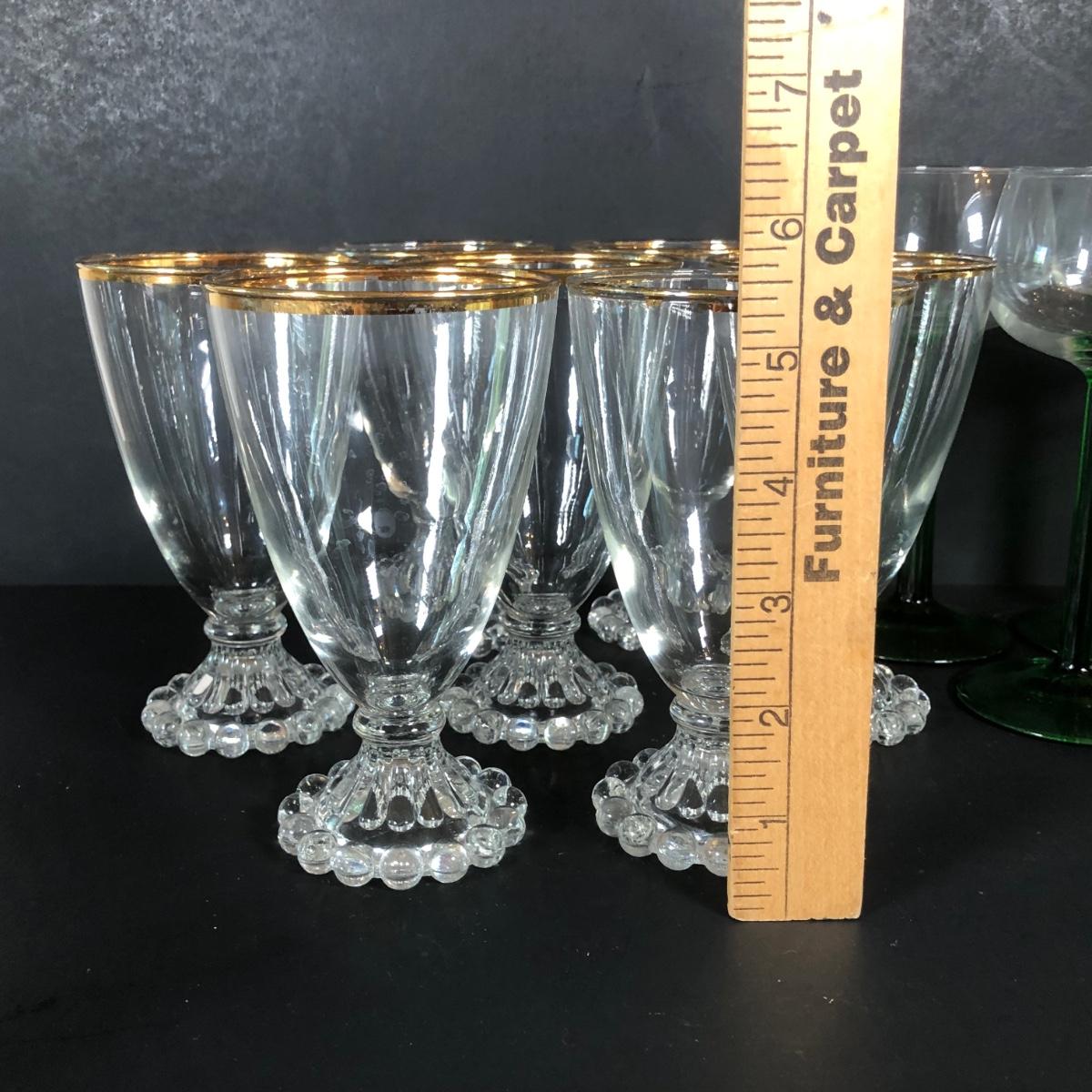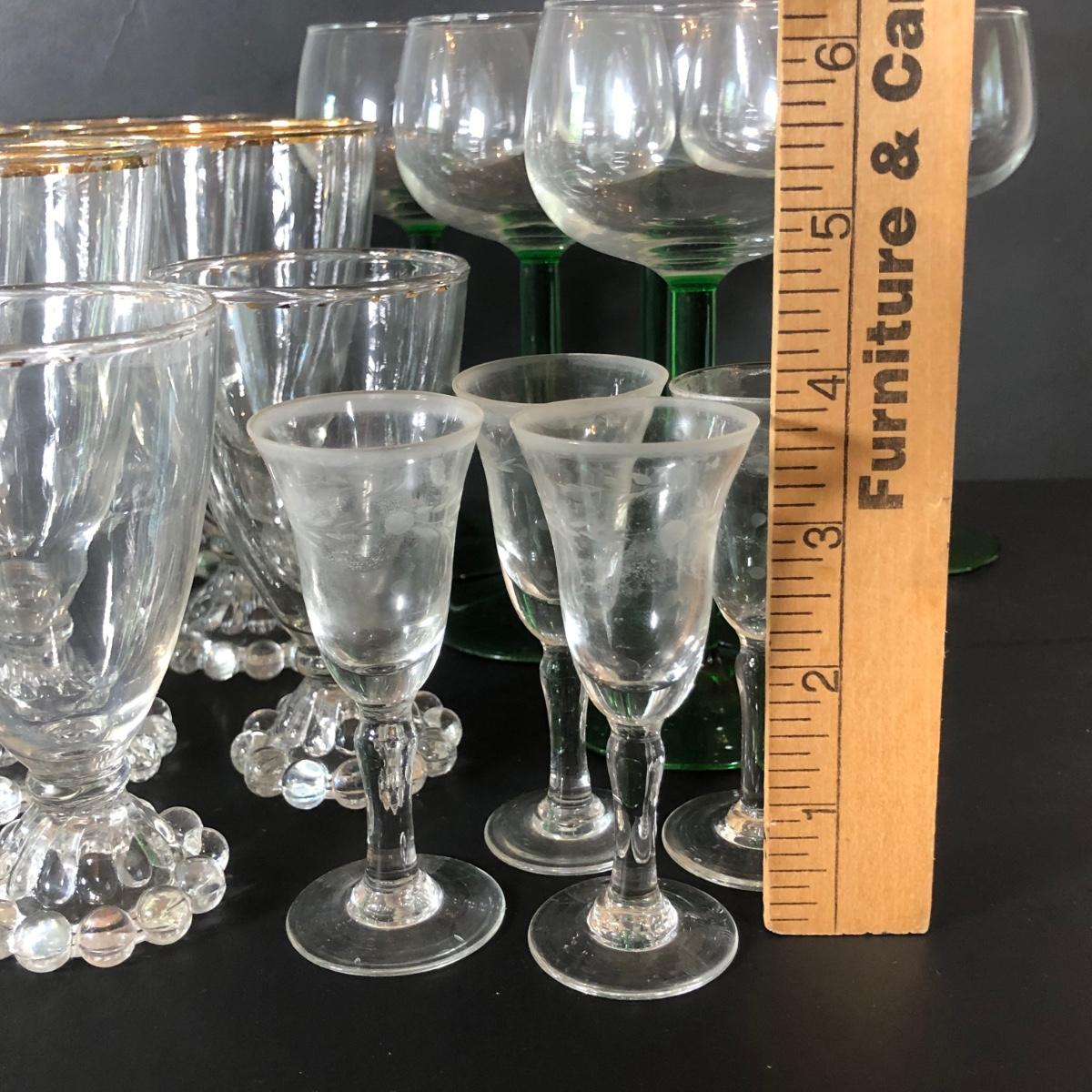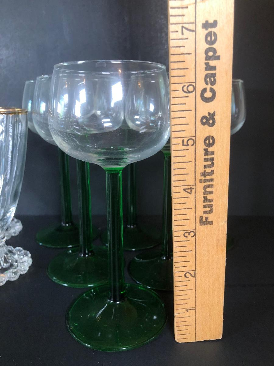 LOT 18L: Unique Barware Collection - Green Stemmed Glasses & 2 Sizes of Bubble Pedestal Glasses
