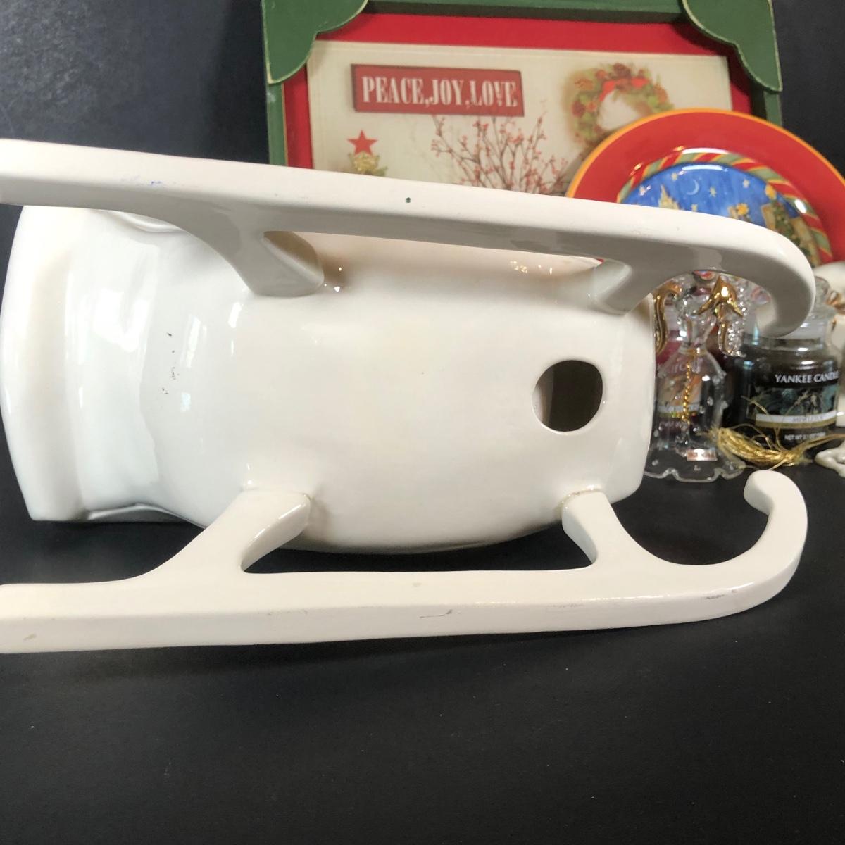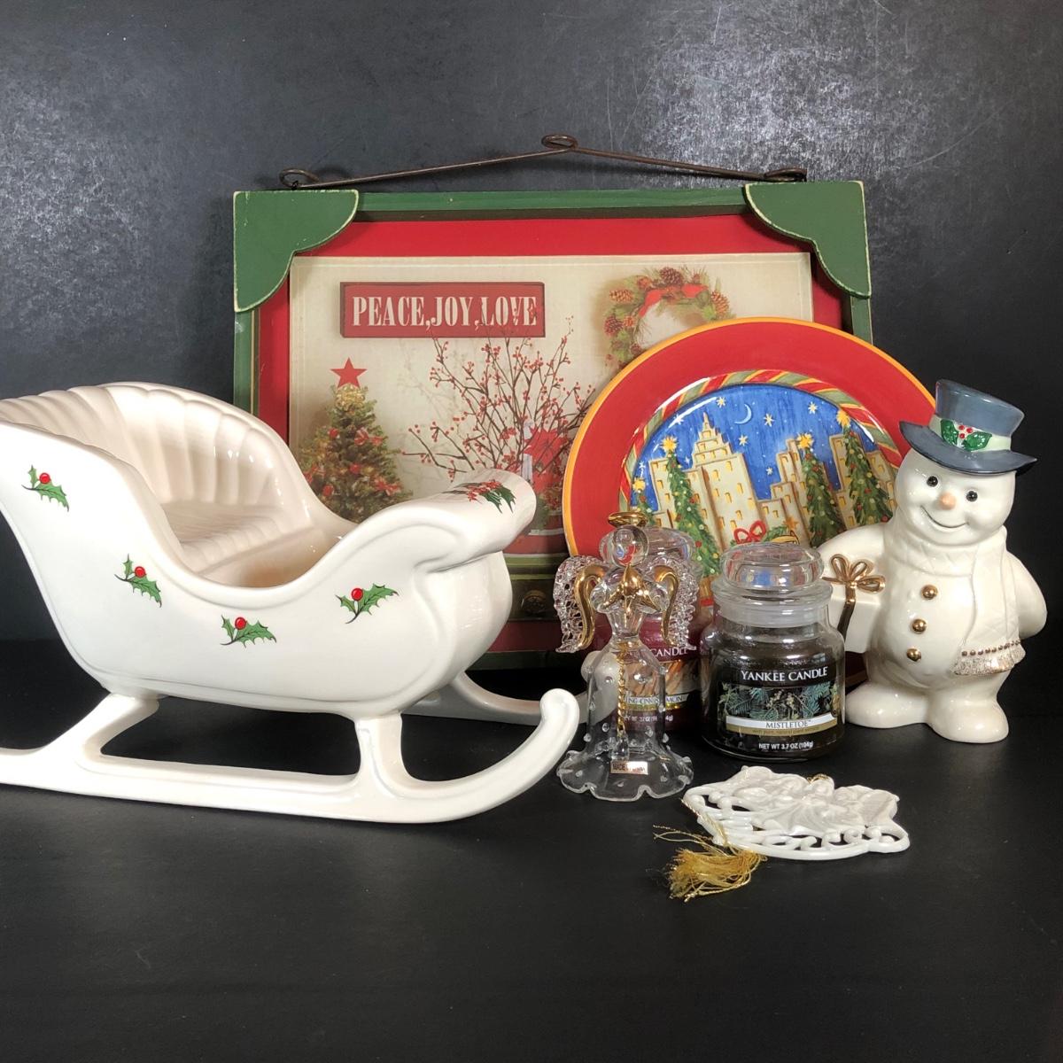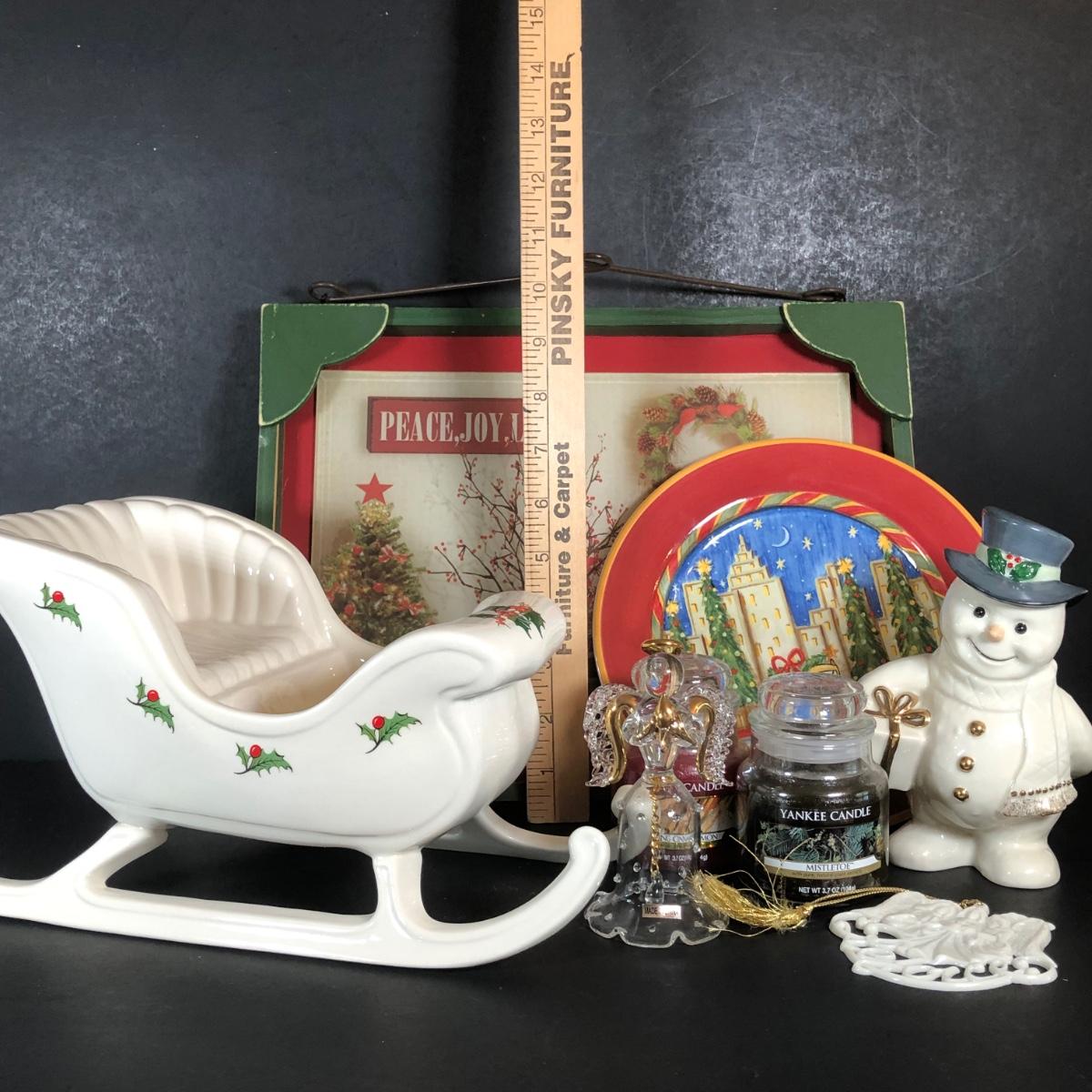 LOT 20L: Christmas Collection - Lenox Snowman & Ornament, Ceramic Sleigh, Glass Angel, Yankee Candles & More