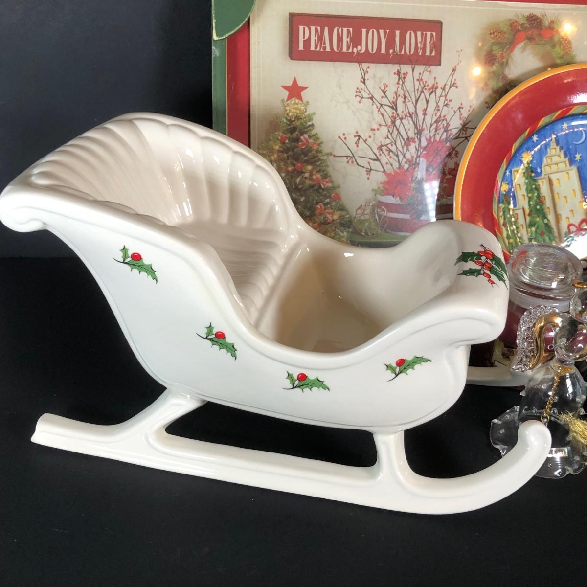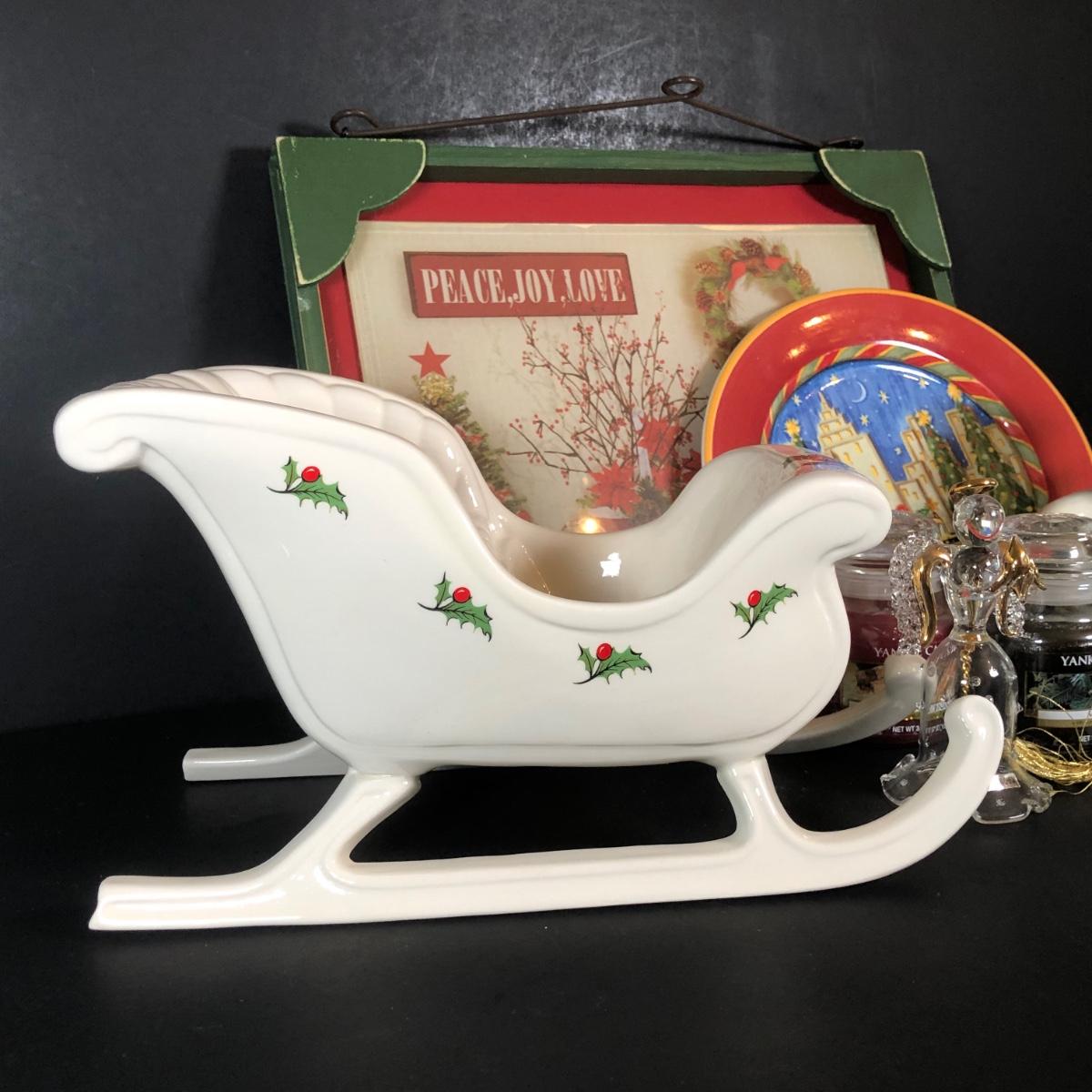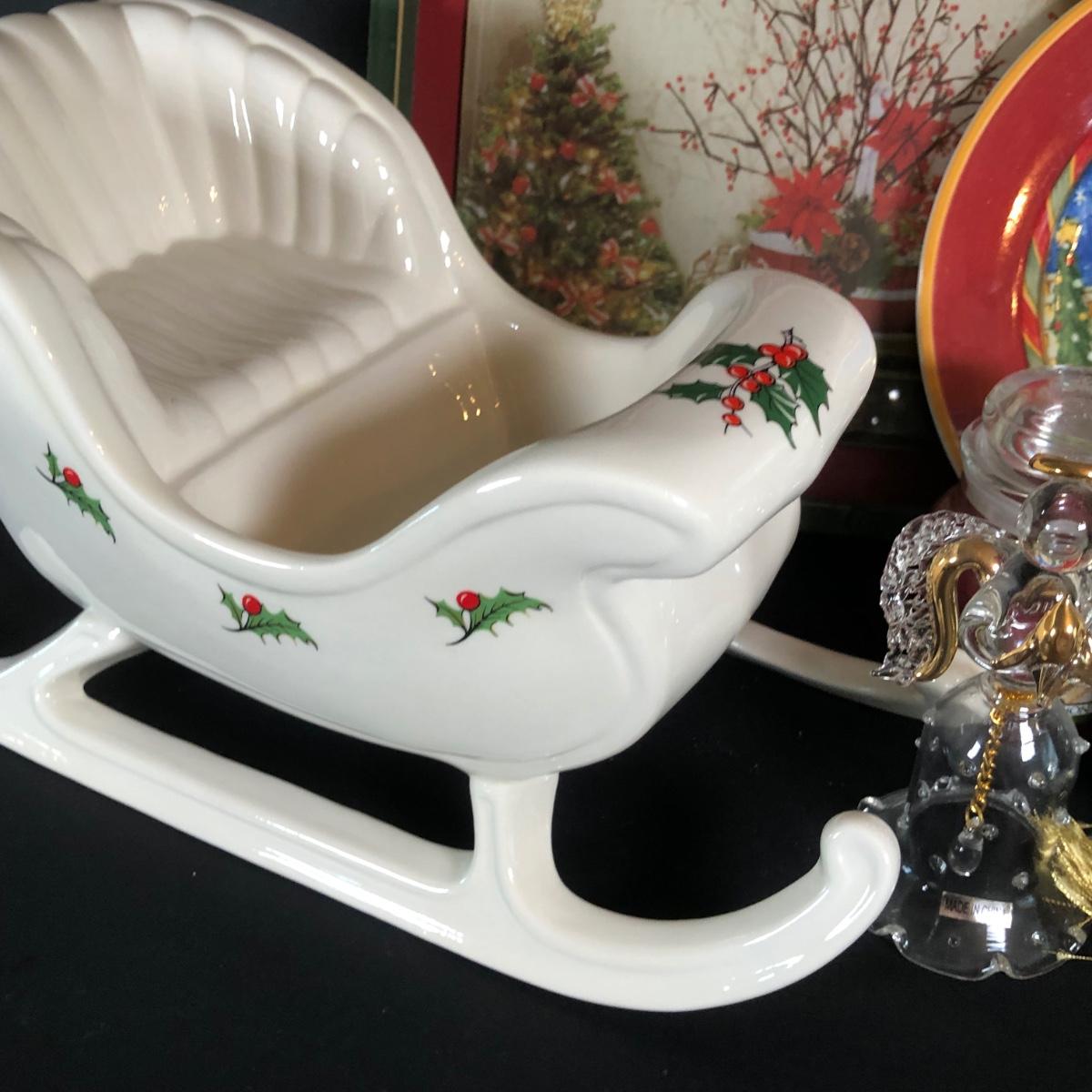 LOT 20L: Christmas Collection - Lenox Snowman & Ornament, Ceramic Sleigh, Glass Angel, Yankee Candles & More