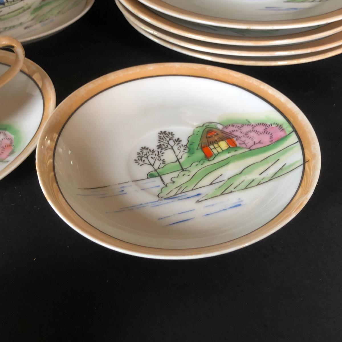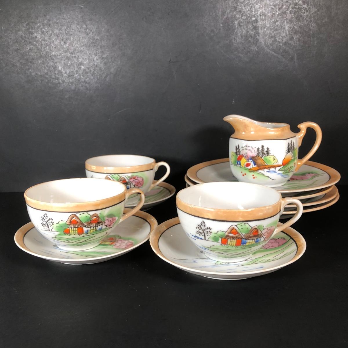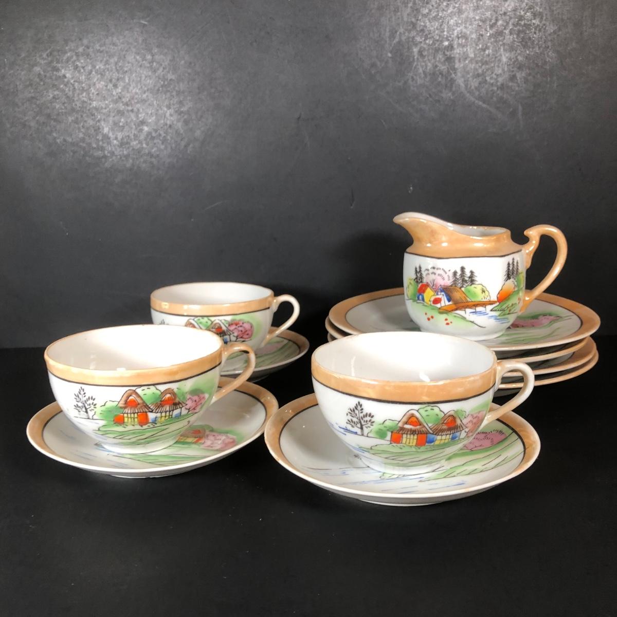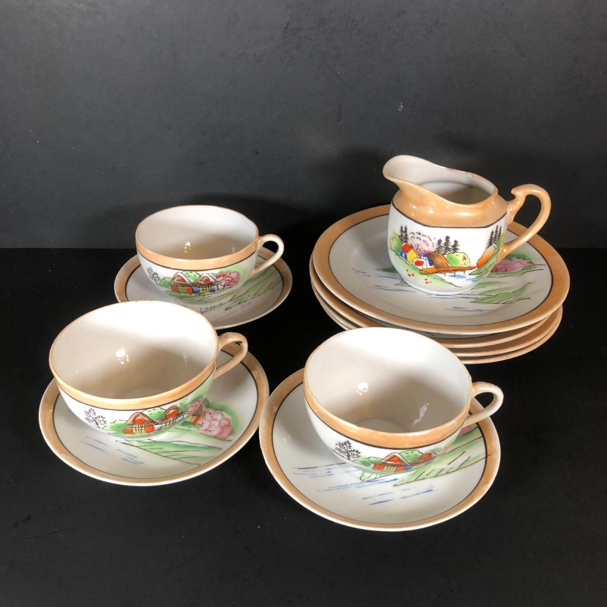 LOT 26L: Vintage Japanese Tea Cups, Saucers, Creamer & Dessert Plates