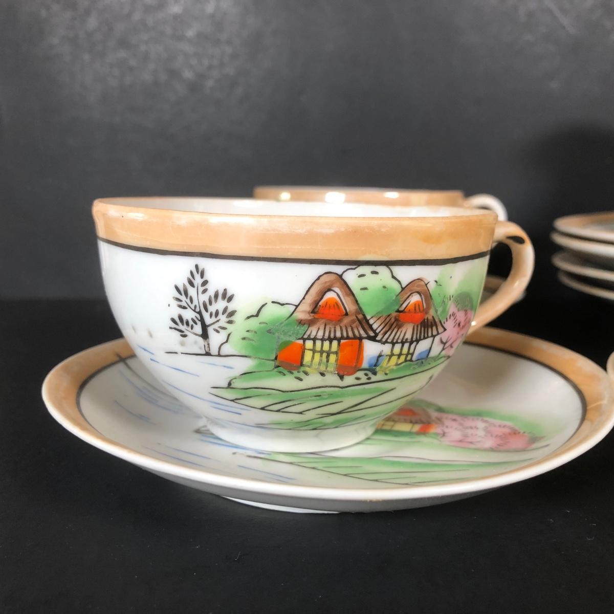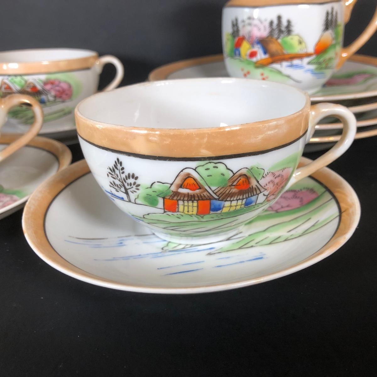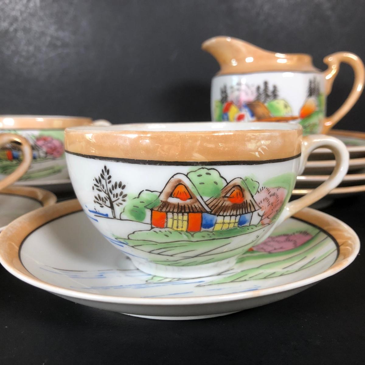 LOT 26L: Vintage Japanese Tea Cups, Saucers, Creamer & Dessert Plates