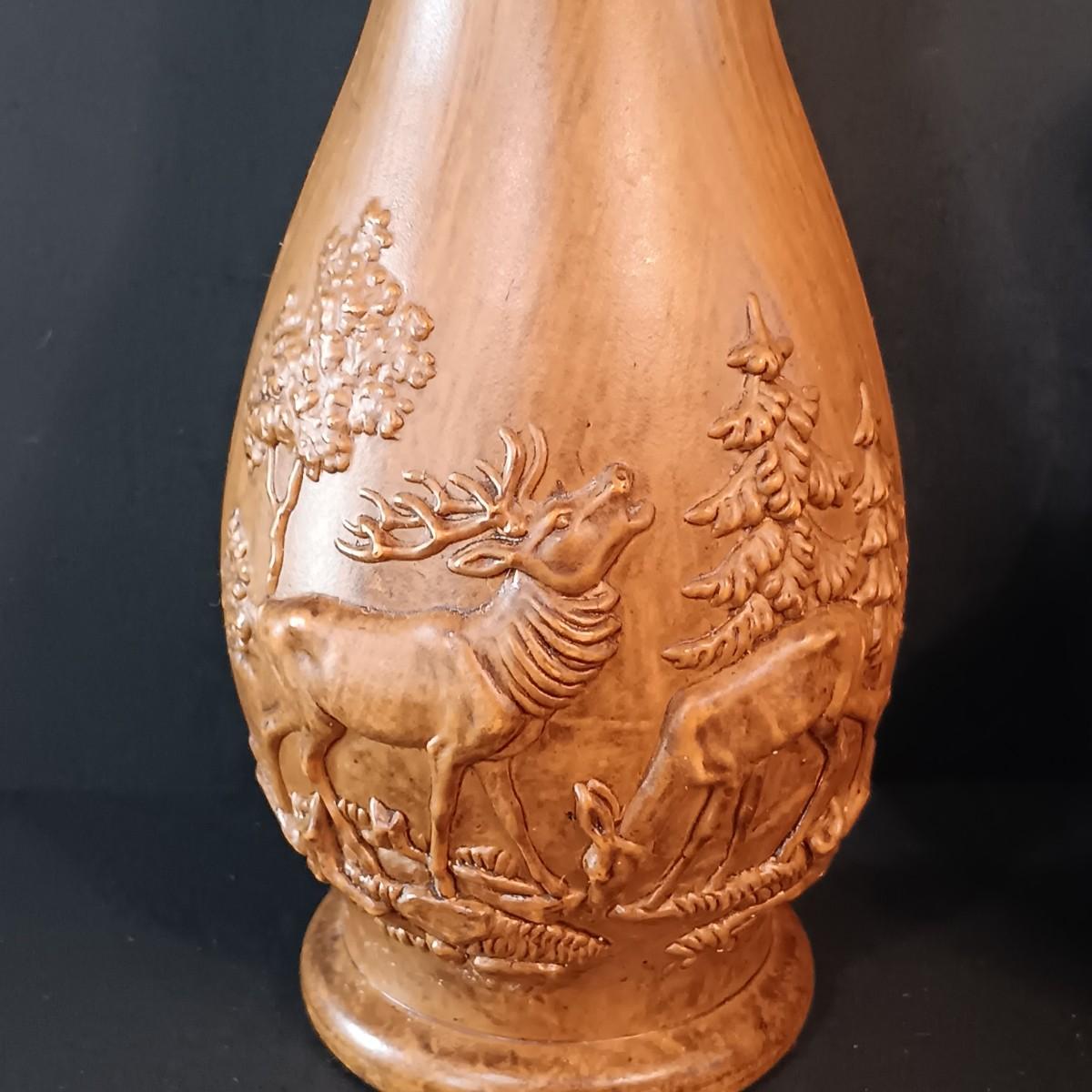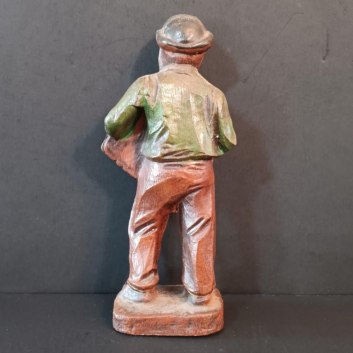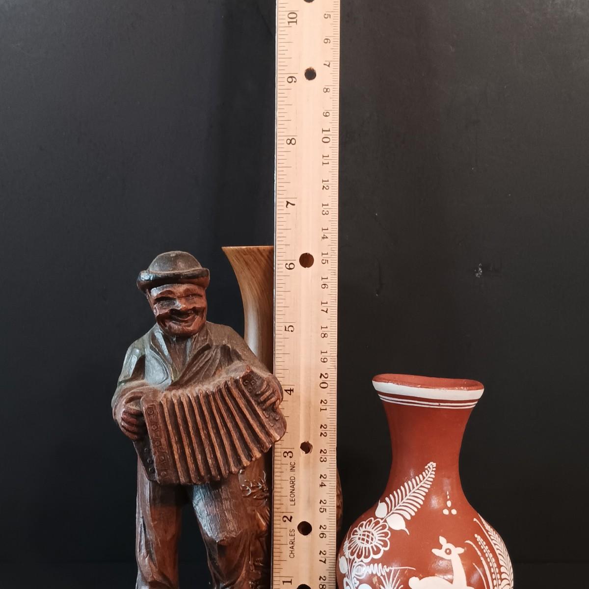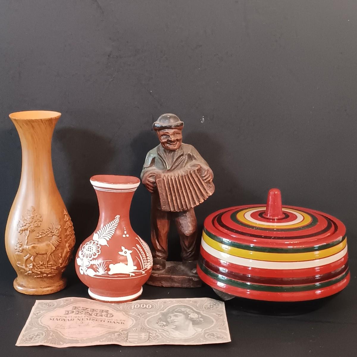 LOT 45: Vintage Faux Wood Stag & Deer Vase, Syroco Accordion Player, Hungary 1000 Pengo Note & Vintage Lacquerware Round Striped Container