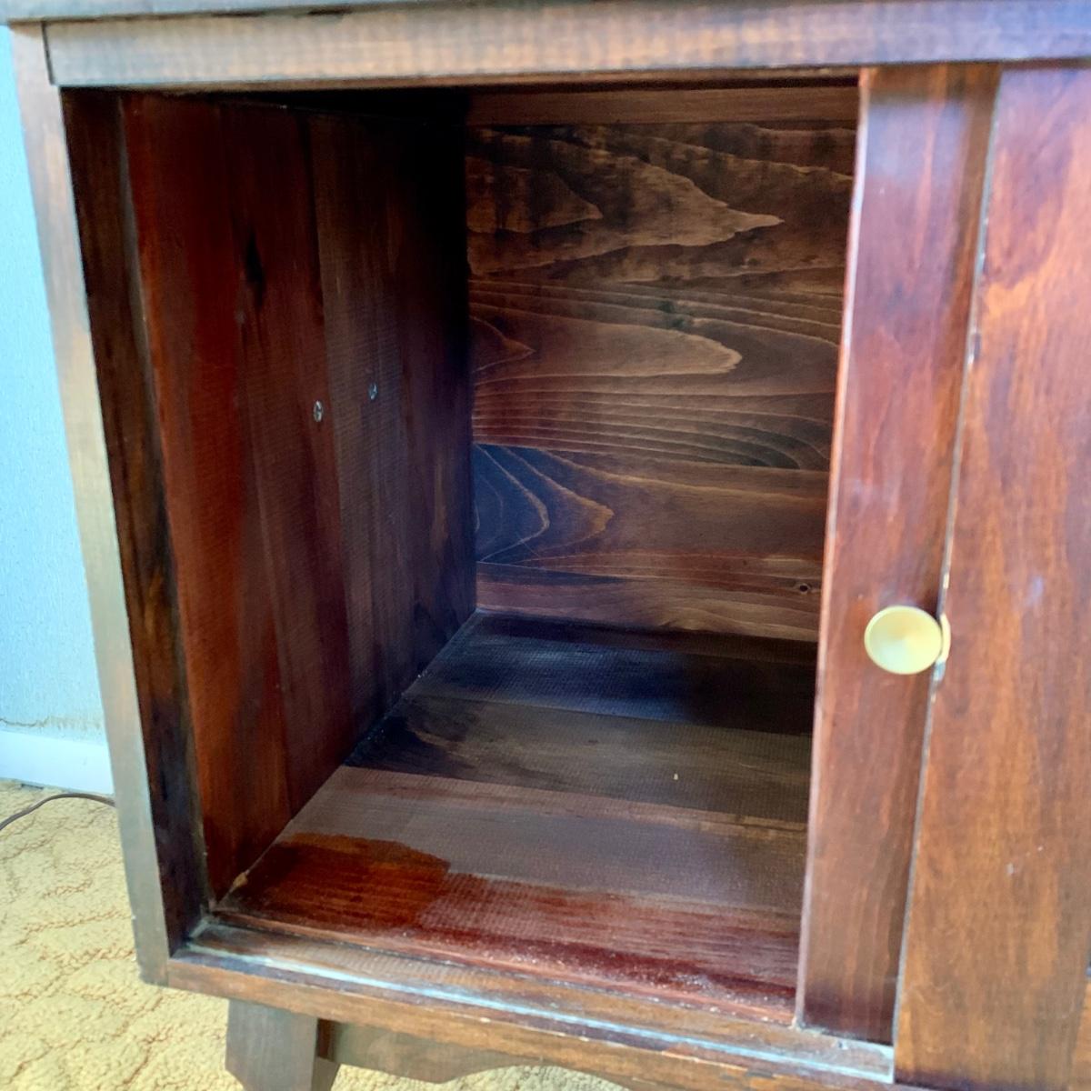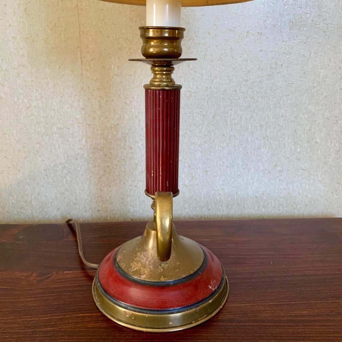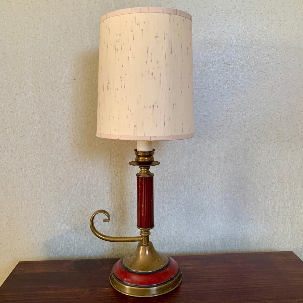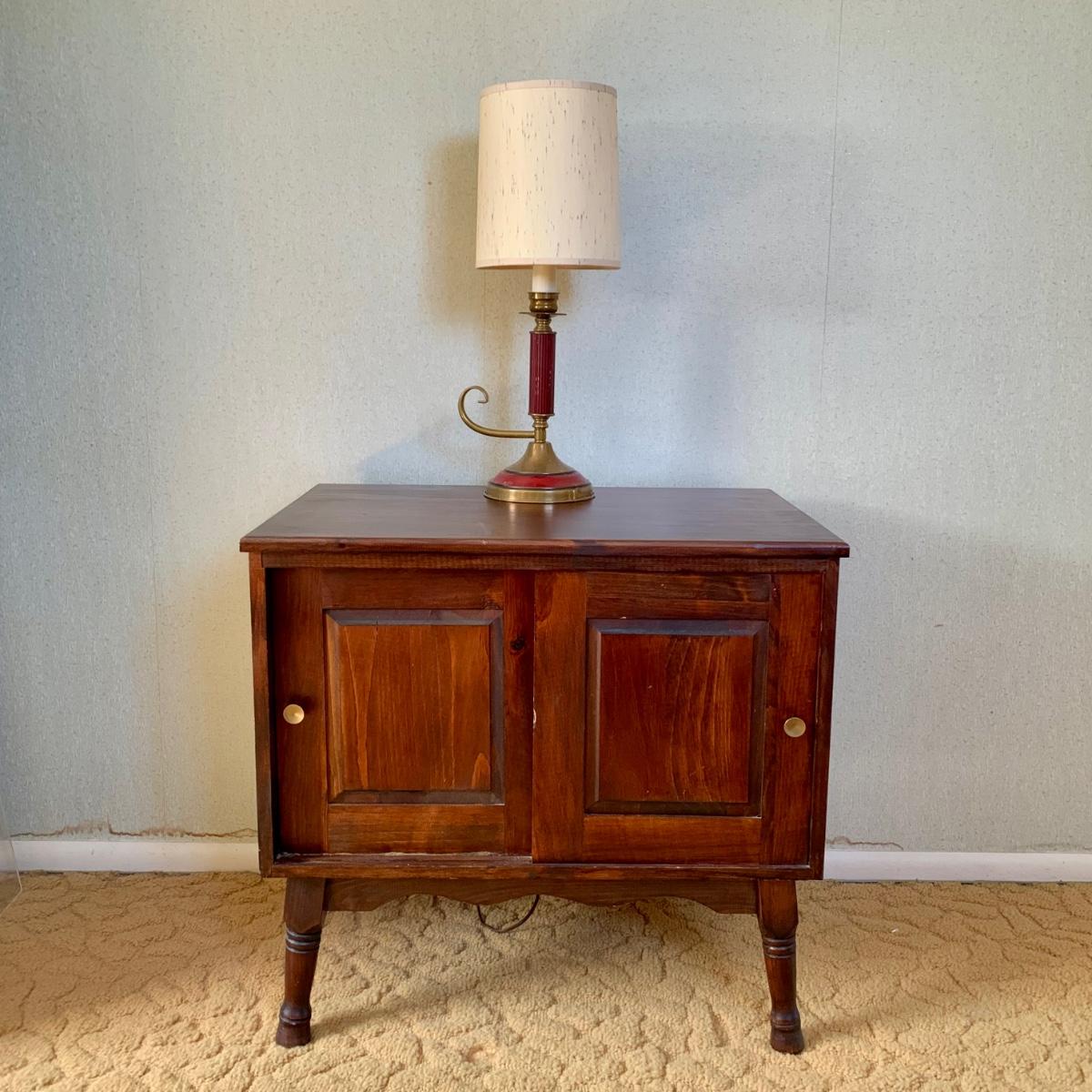 LOT 55: Vintage Sliding Door End Table/ Side Table & Red & Bronzed Candlestick Table Lamp