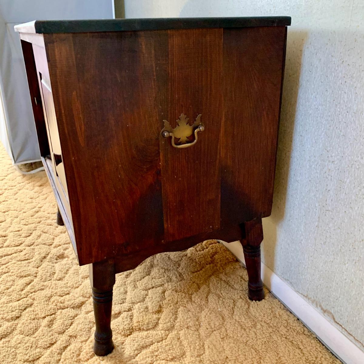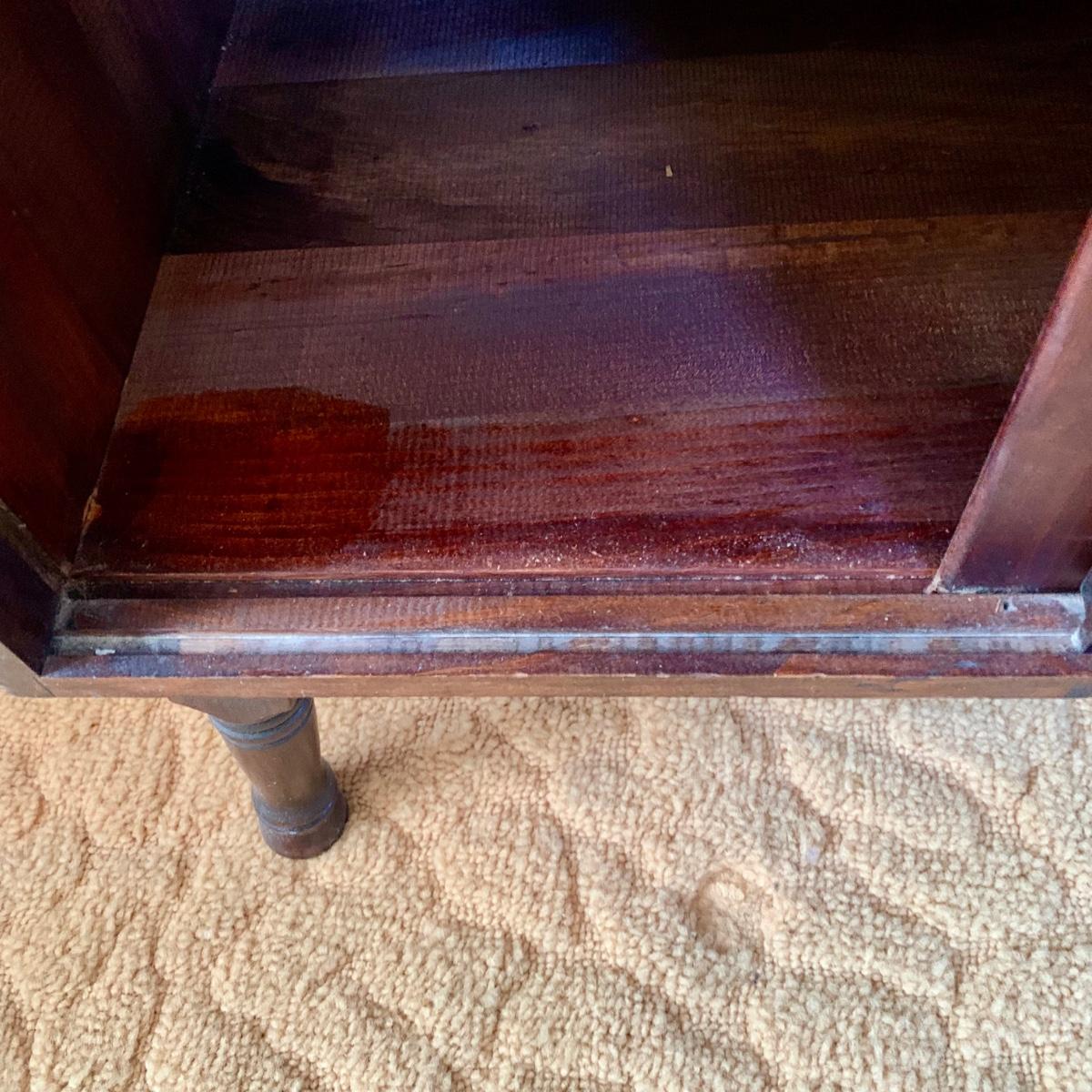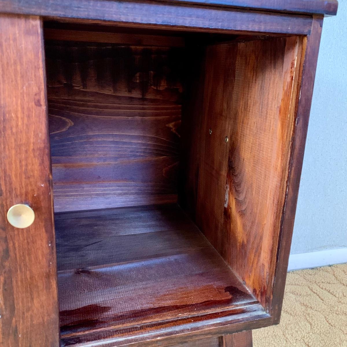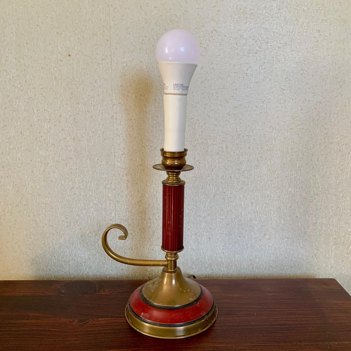 LOT 55: Vintage Sliding Door End Table/ Side Table & Red & Bronzed Candlestick Table Lamp