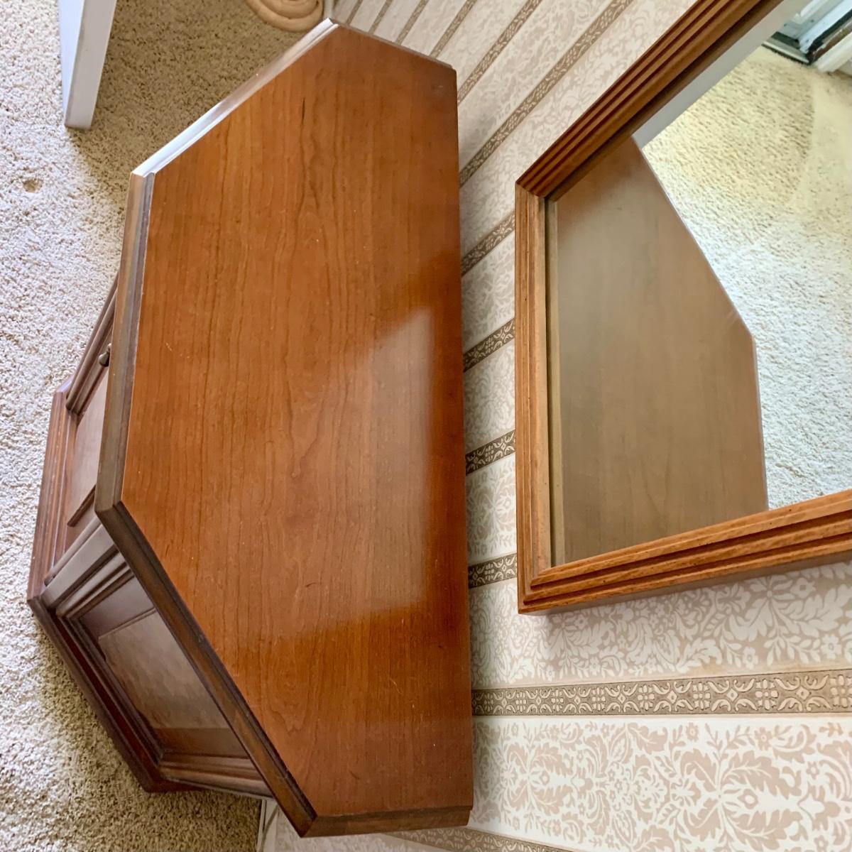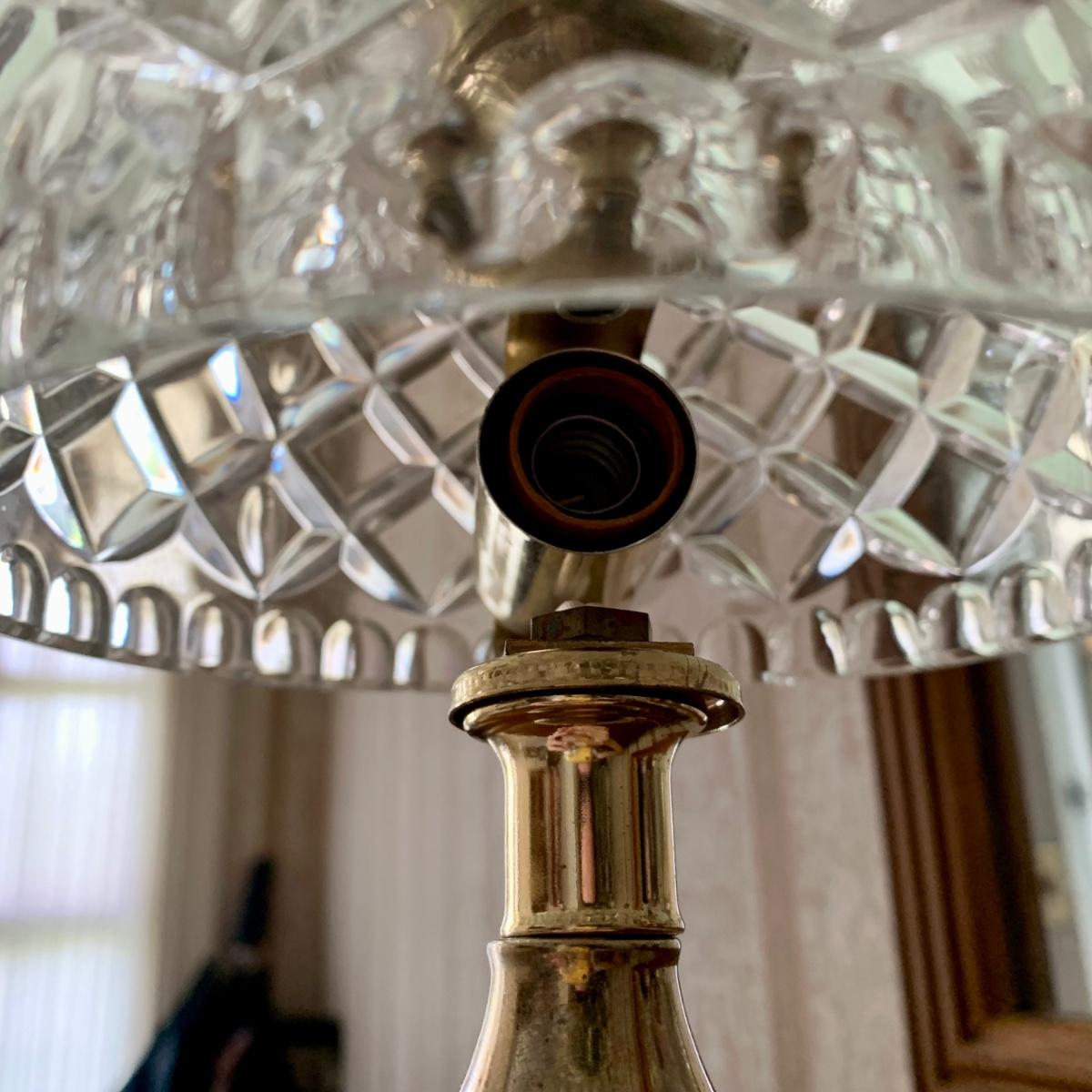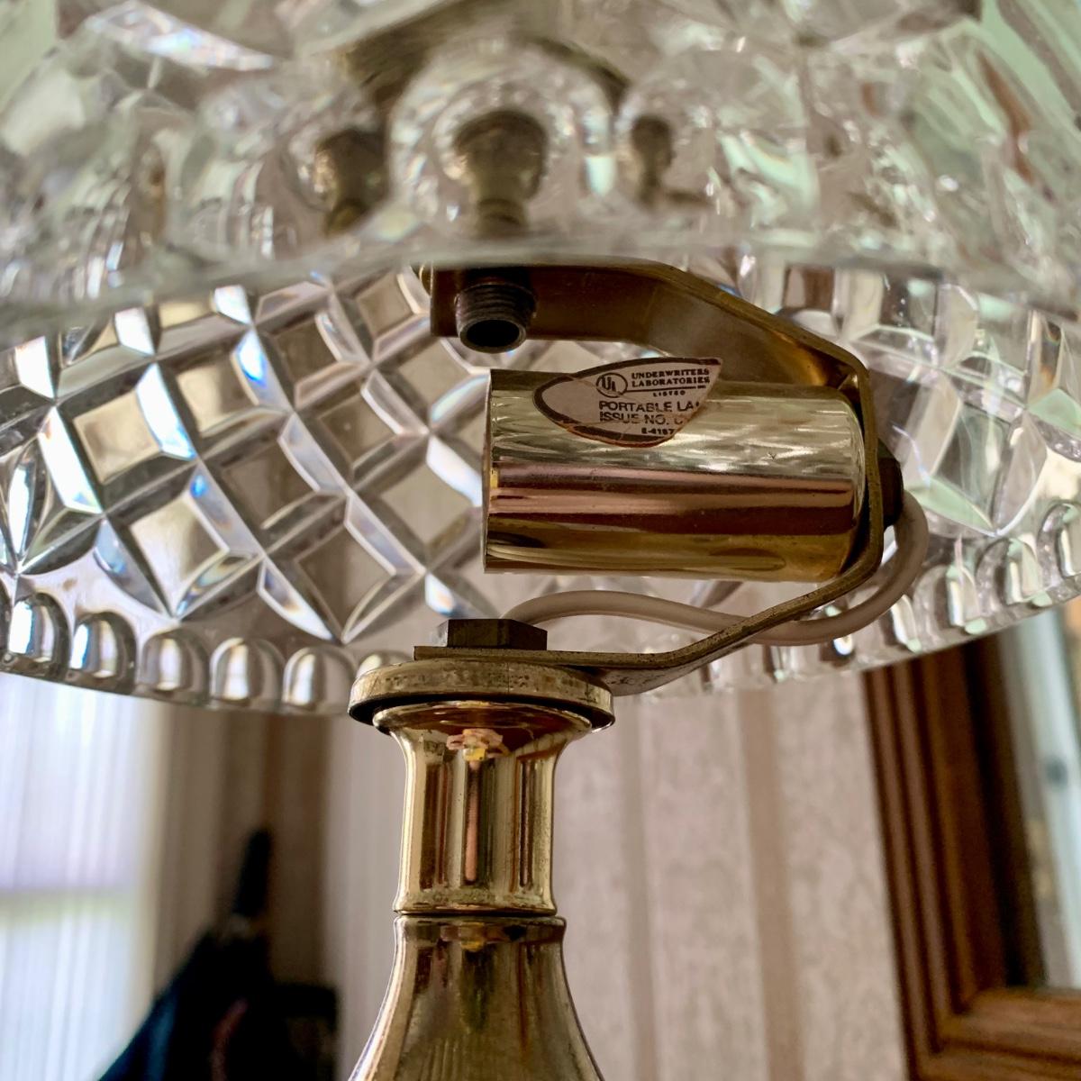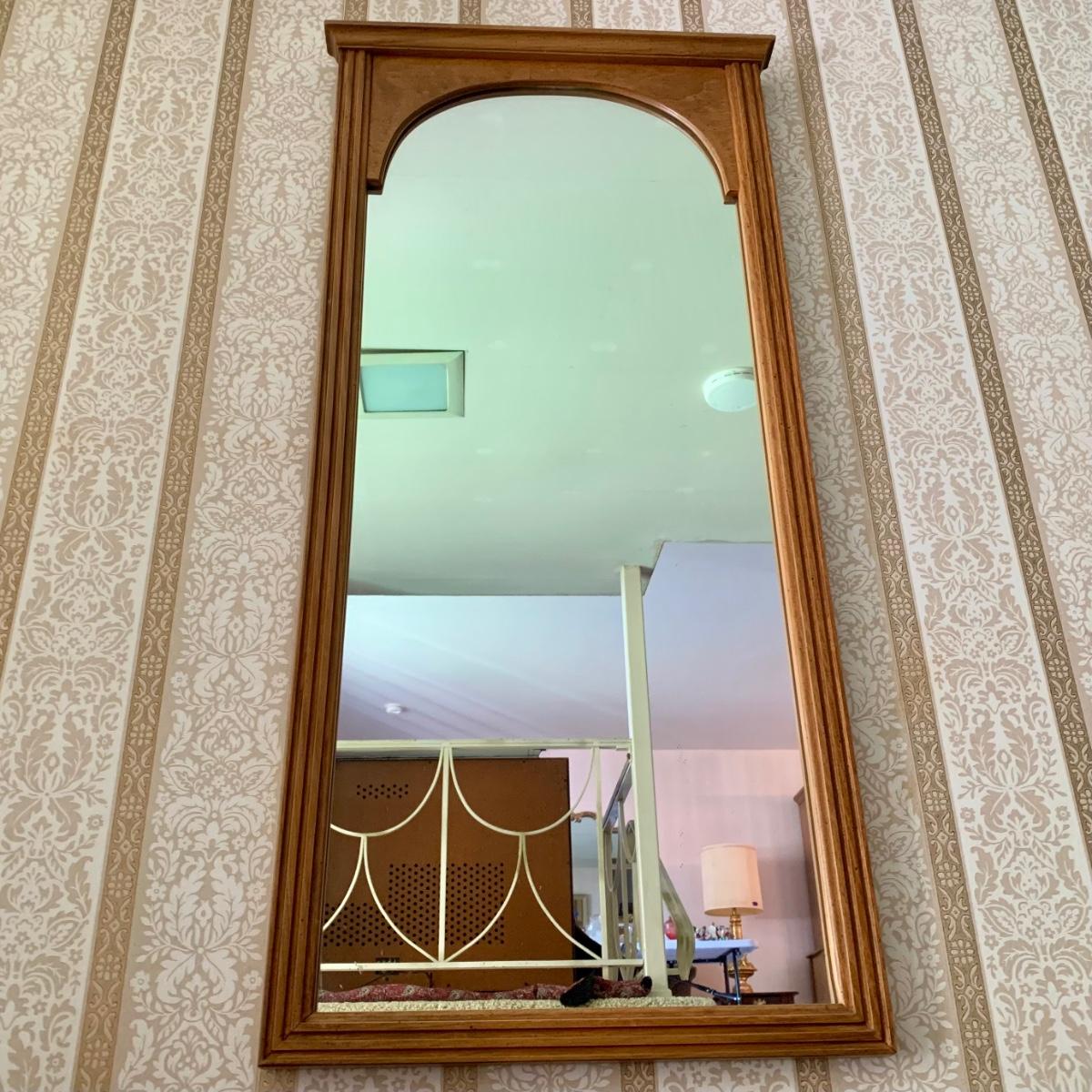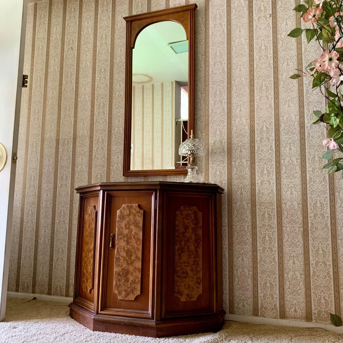 LOT 64: Vintage Single Door Cherry Wood Accent Hall Cabinet, Cut Crystal Table Lamp w/ Crystal Shade, & Long Rectangular Wall Mirror