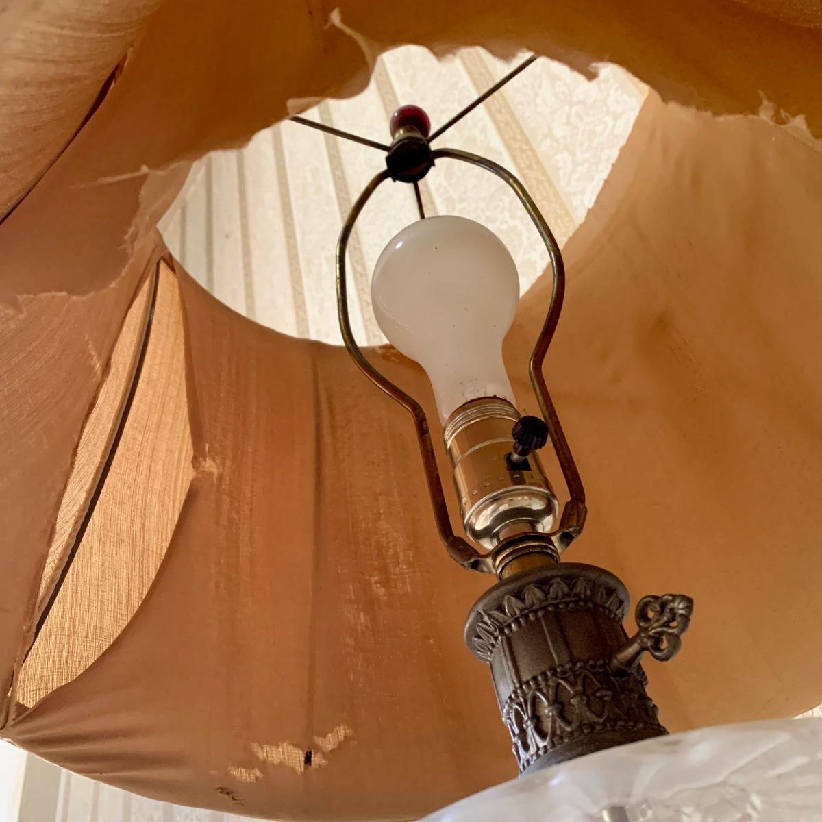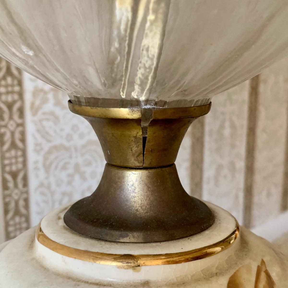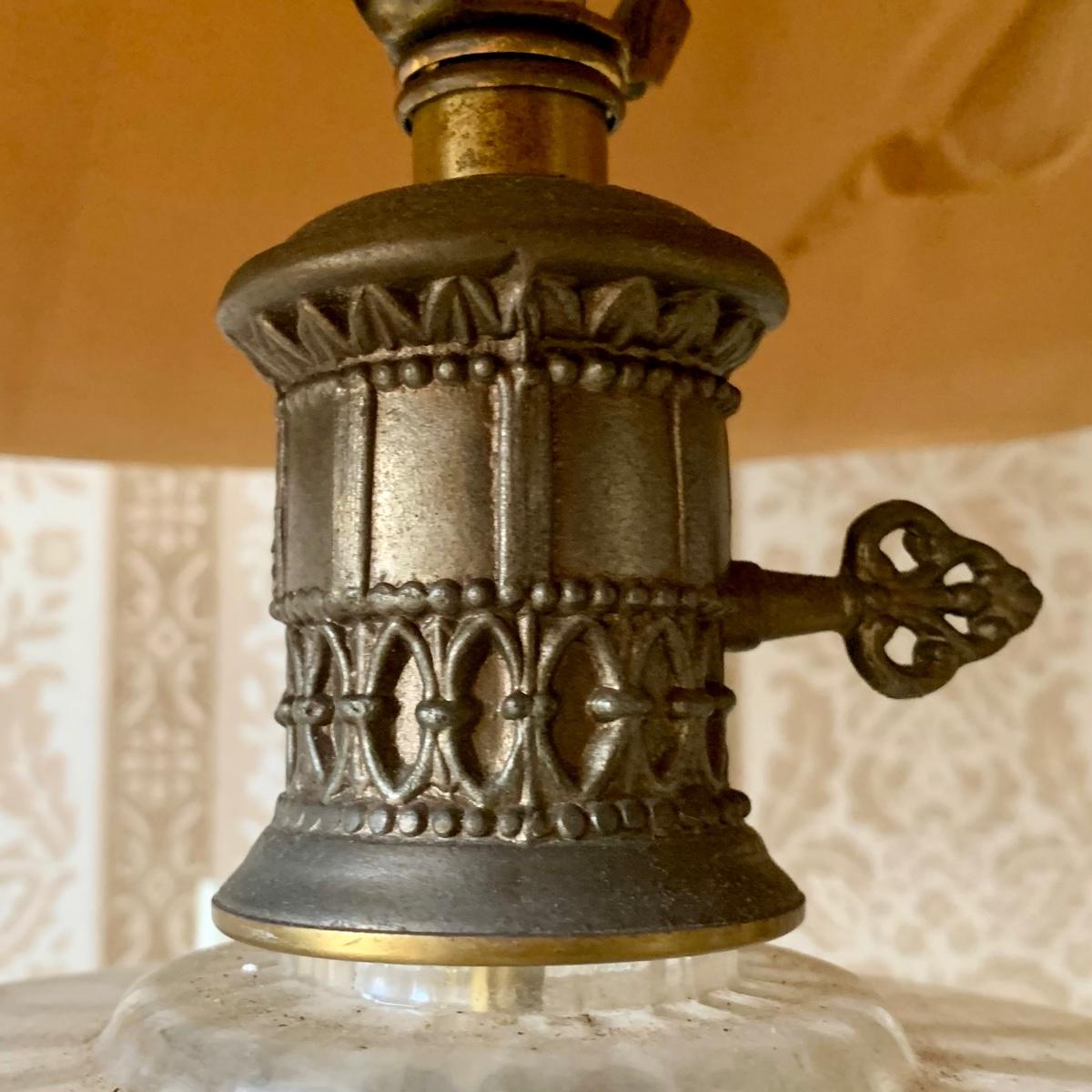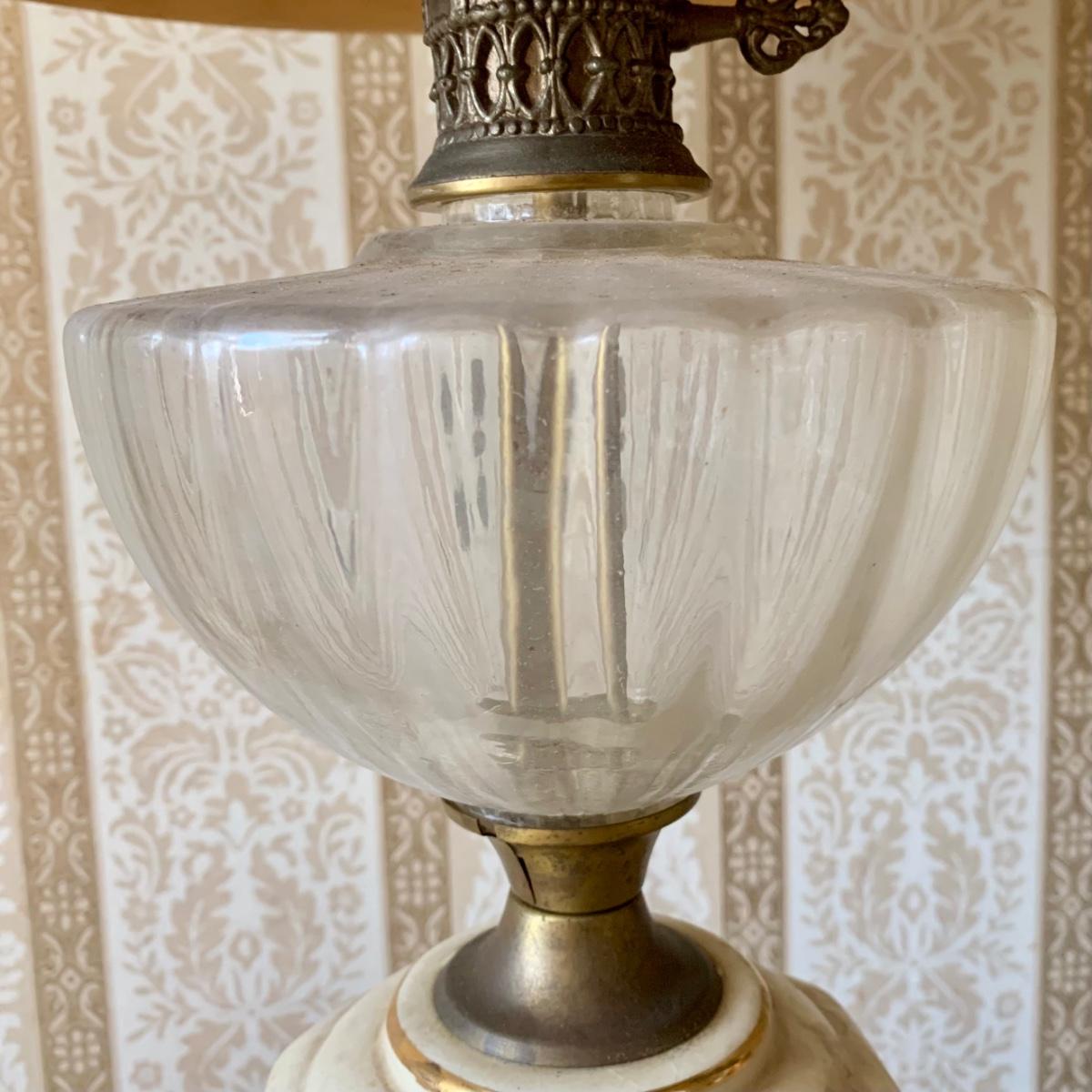 *Condition Issues: "Oil" Lamp Shade is damaged, Crack in Middle Brass Piece, & Shade Knob is Bent (See Photos)*