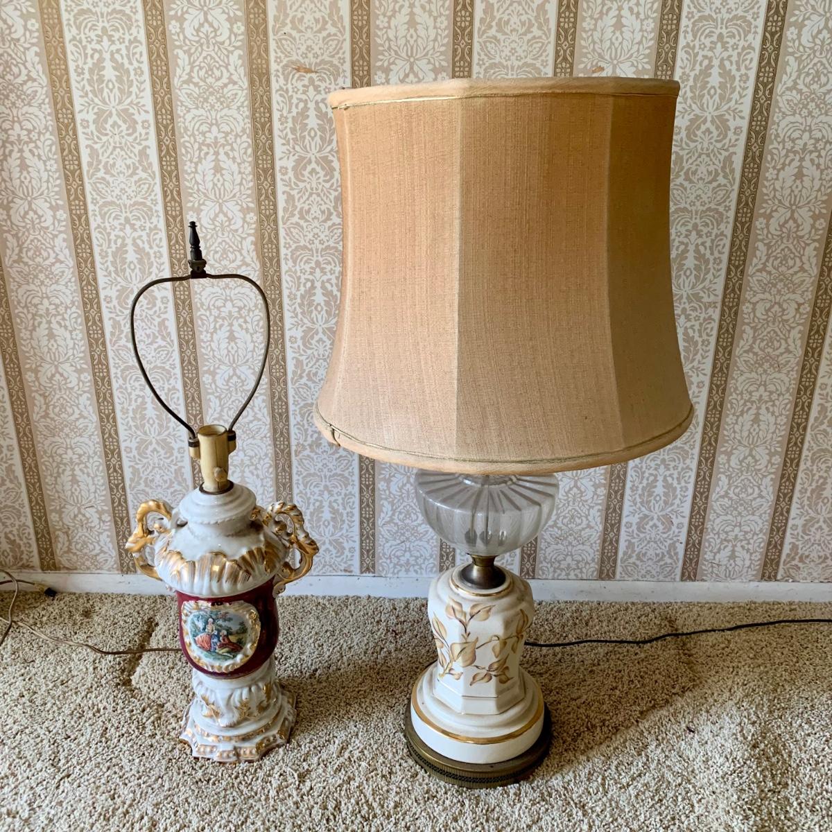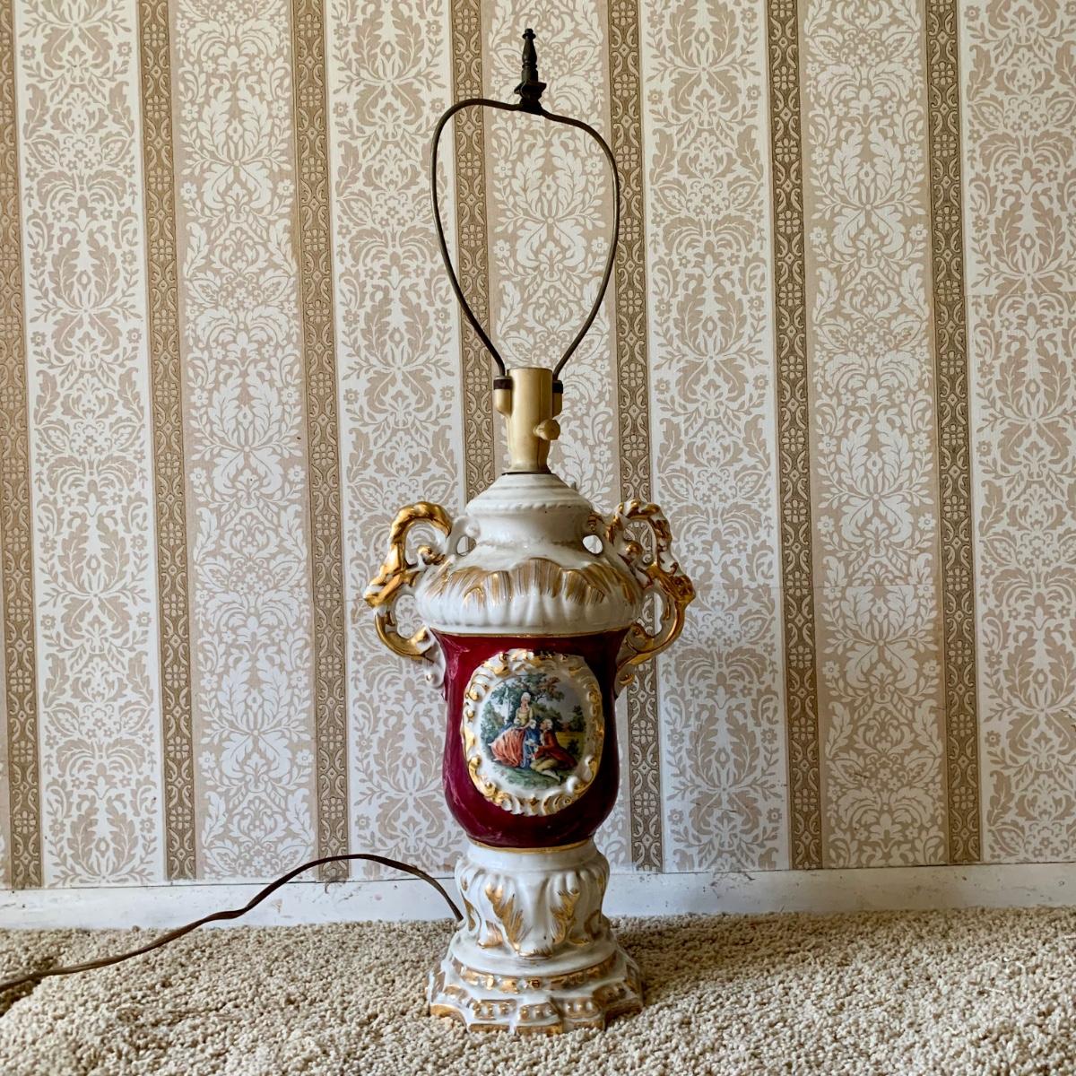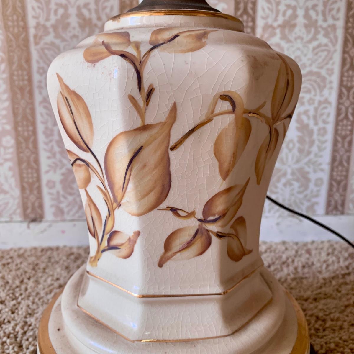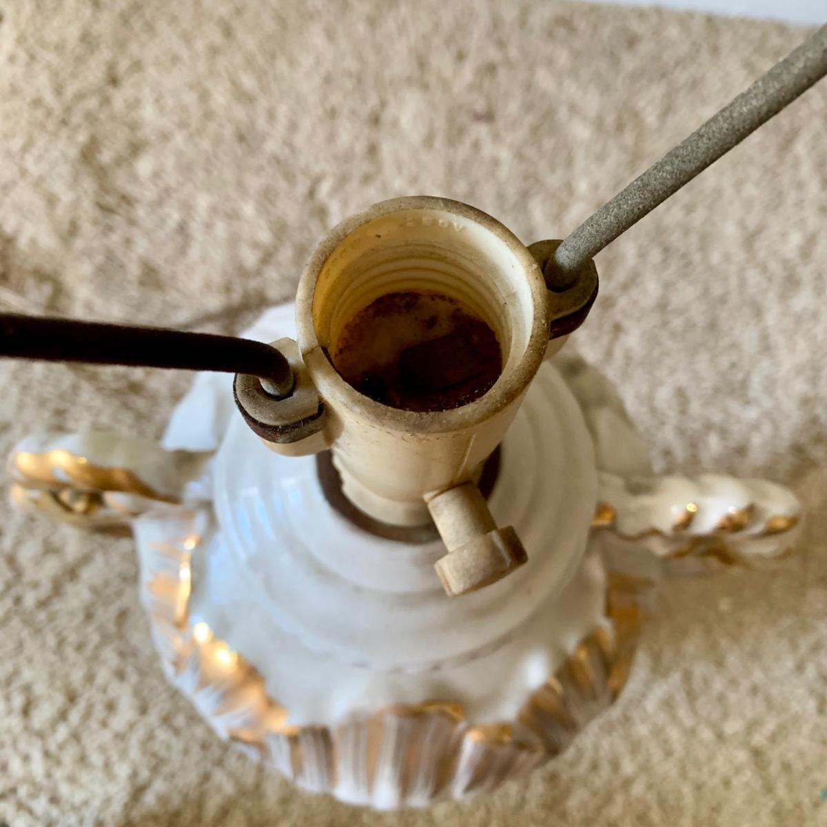 LOT 68: Vintage 1950's Hollywood Regency Urn Style Omsco Deveraux Philadelphia Table Lamp & Ceramic w/ Brass Accents Faux Oil Lamp w/ Shade