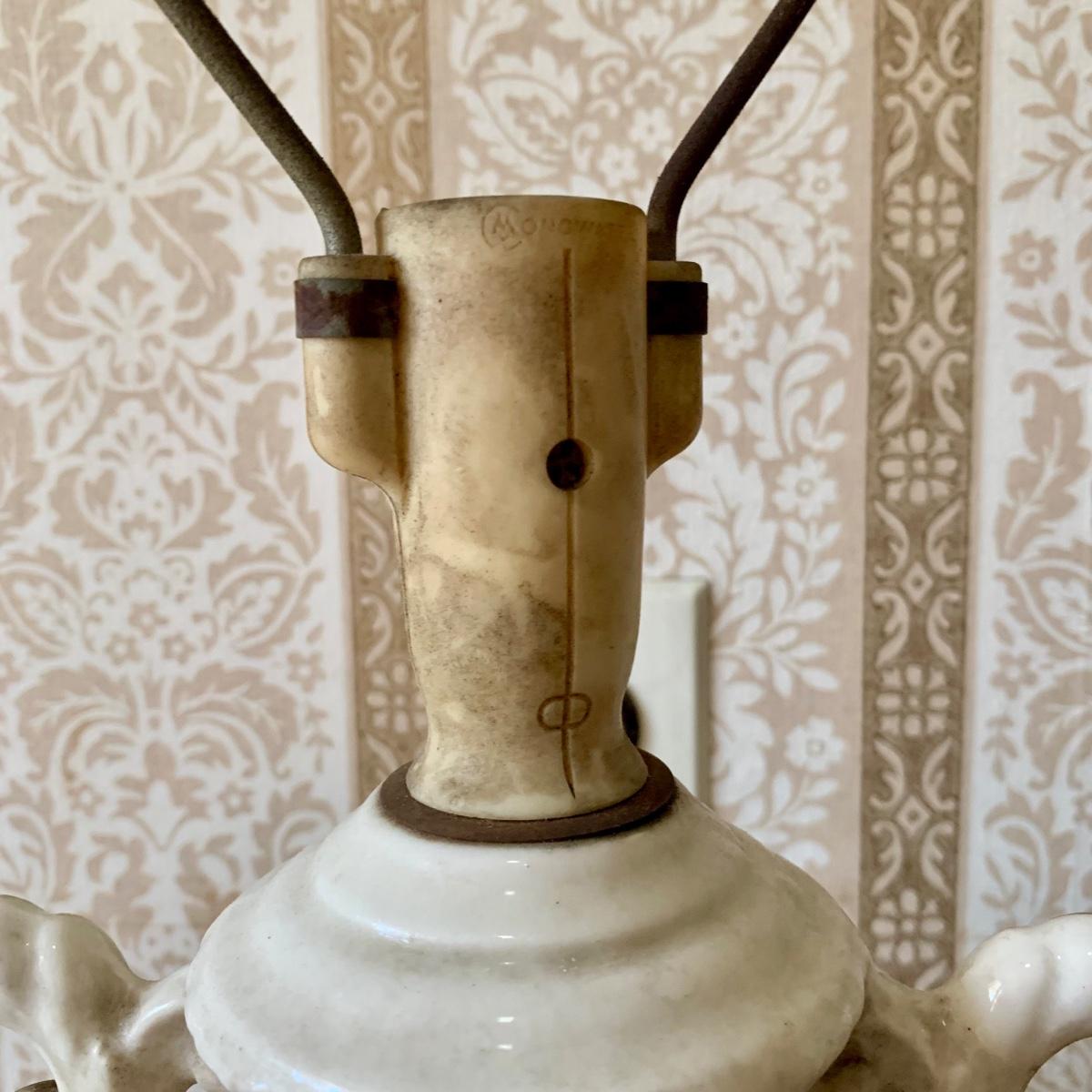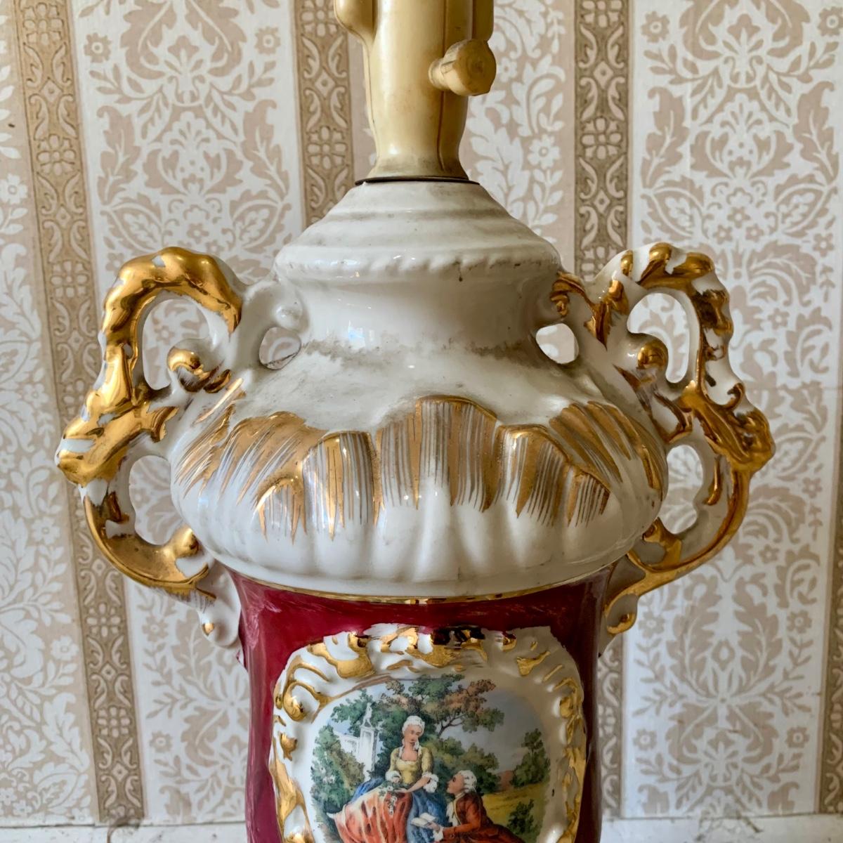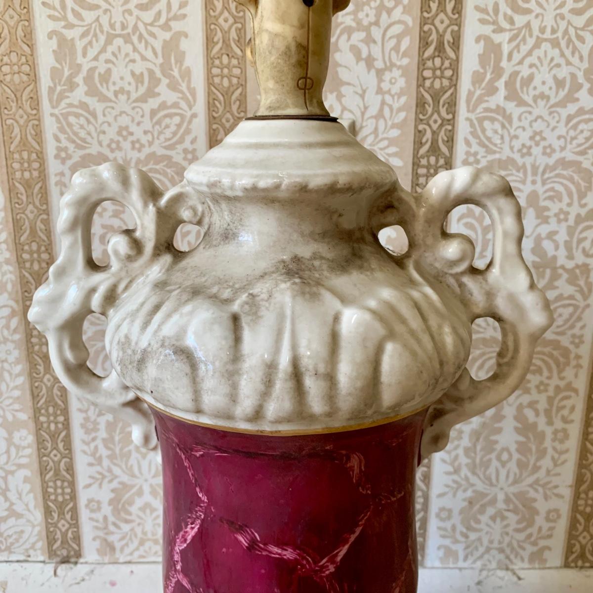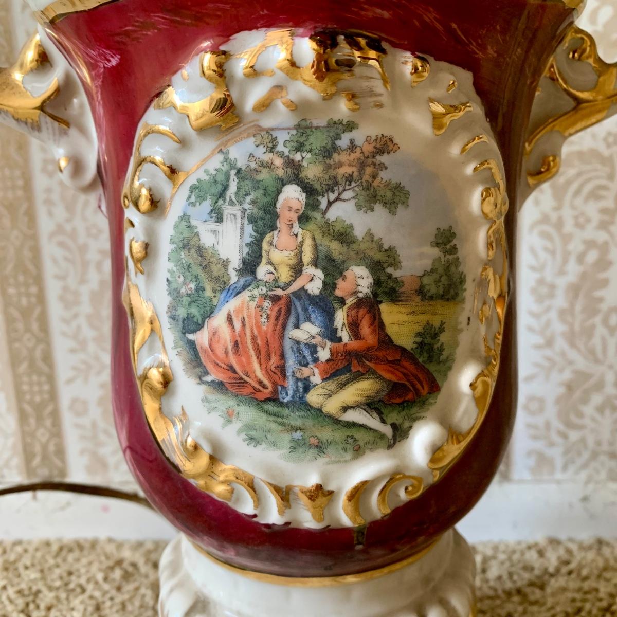 LOT 68: Vintage 1950's Hollywood Regency Urn Style Omsco Deveraux Philadelphia Table Lamp & Ceramic w/ Brass Accents Faux Oil Lamp w/ Shade