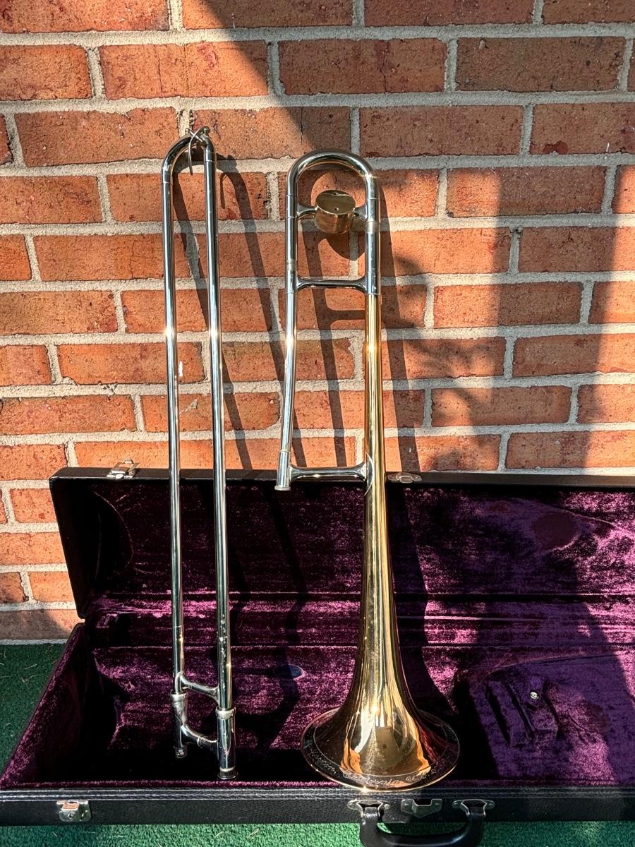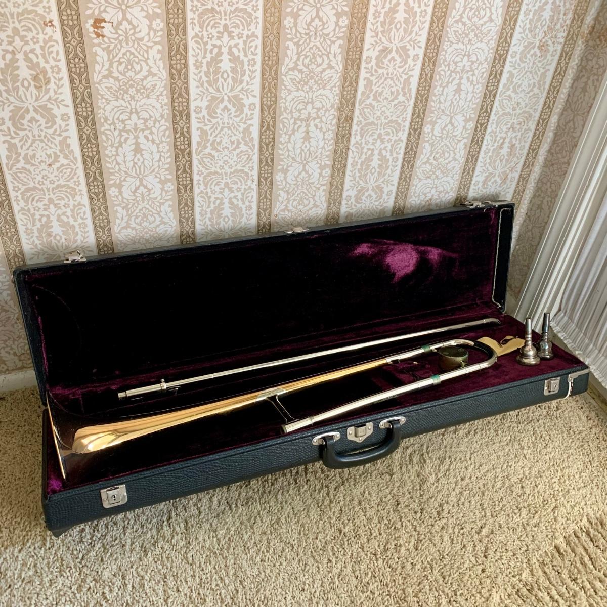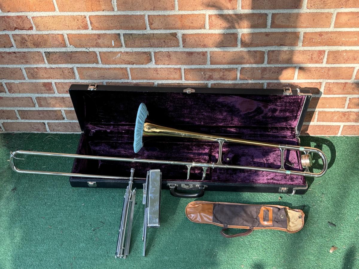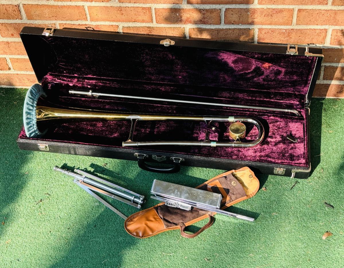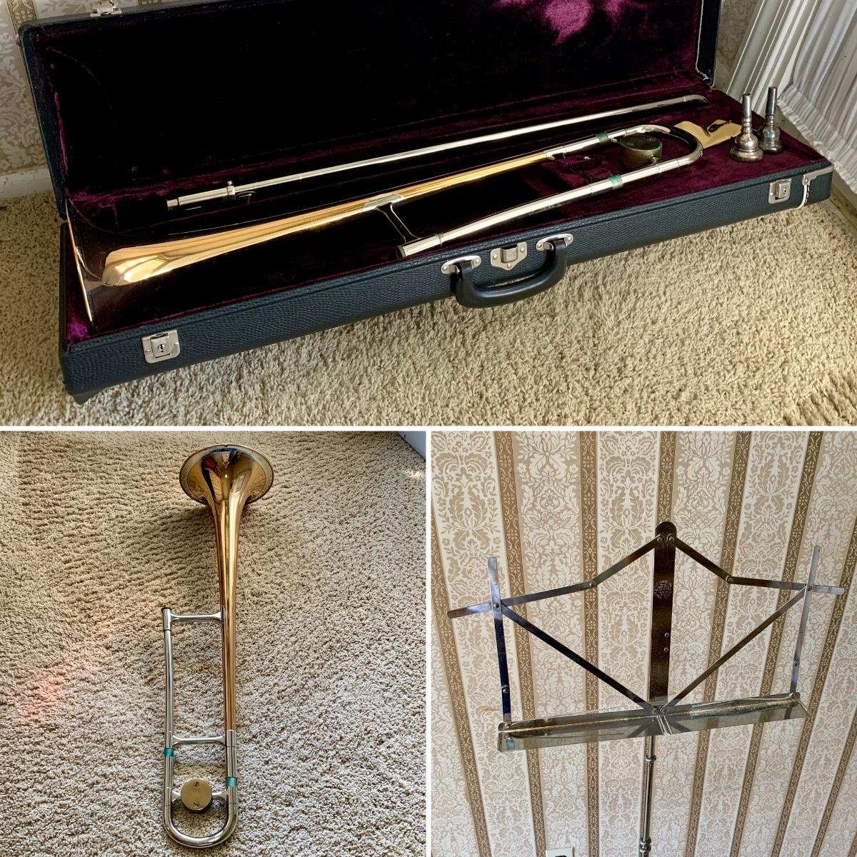 LOT 69: Vintage 1950's Olds "Super" Trombone F. E. Olds & Son Fullerton CA w/ Rudy Muck Cushion Rim Mouth Pieces, Case w/ Keys, & Music Stand