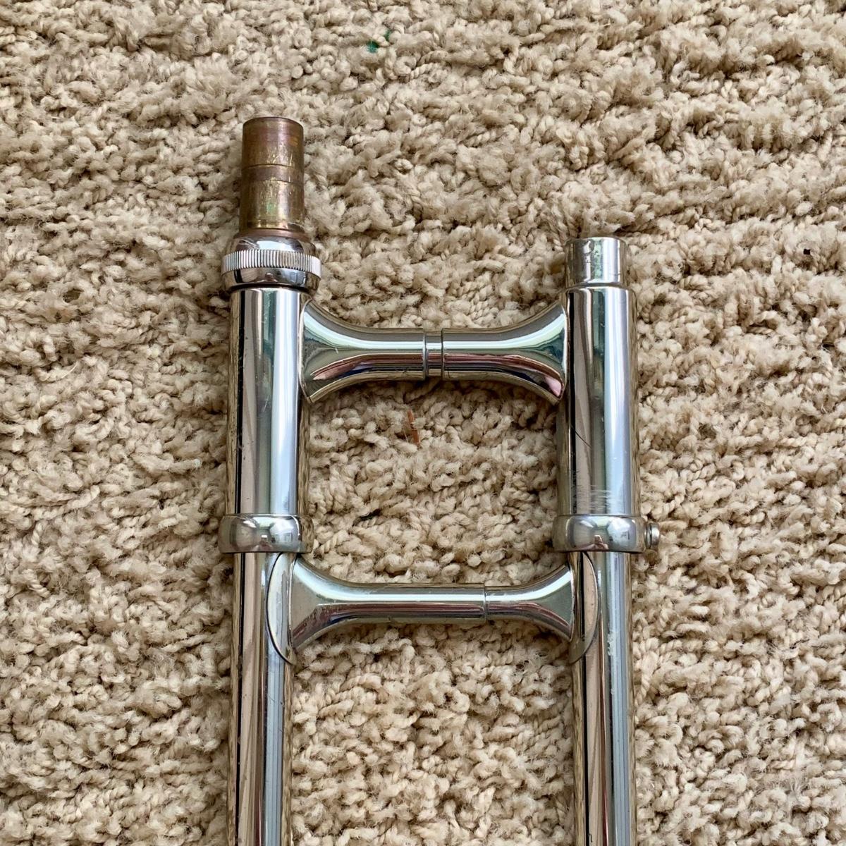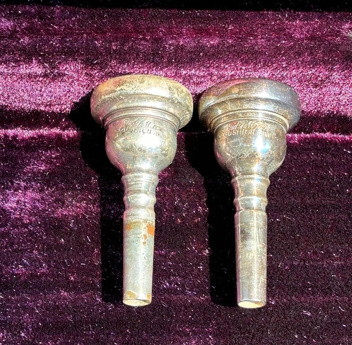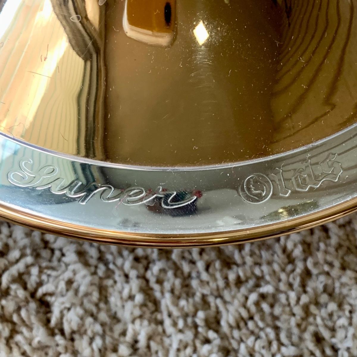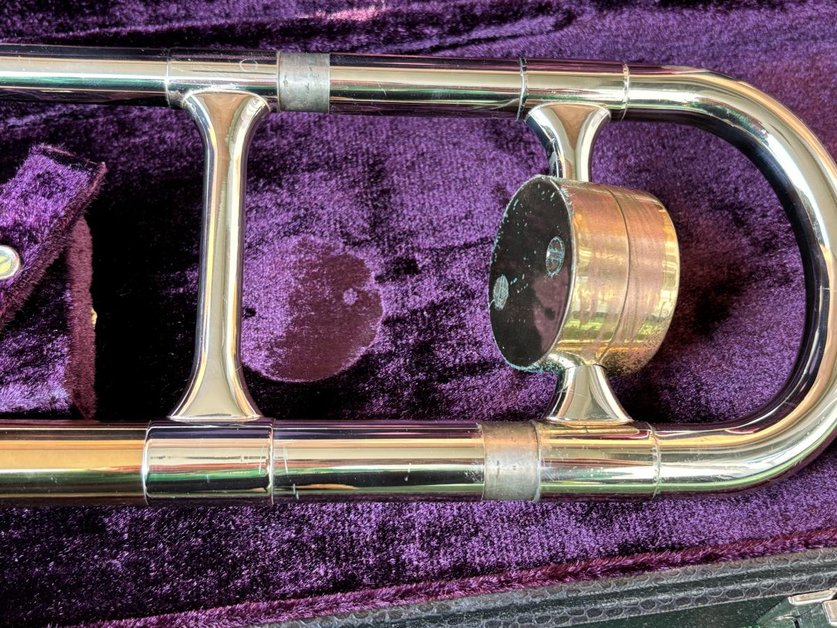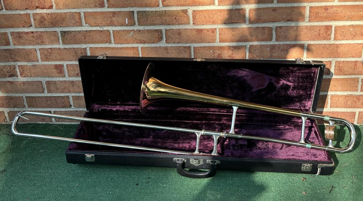 LOT 69: Vintage 1950's Olds "Super" Trombone F. E. Olds & Son Fullerton CA w/ Rudy Muck Cushion Rim Mouth Pieces, Case w/ Keys, & Music Stand