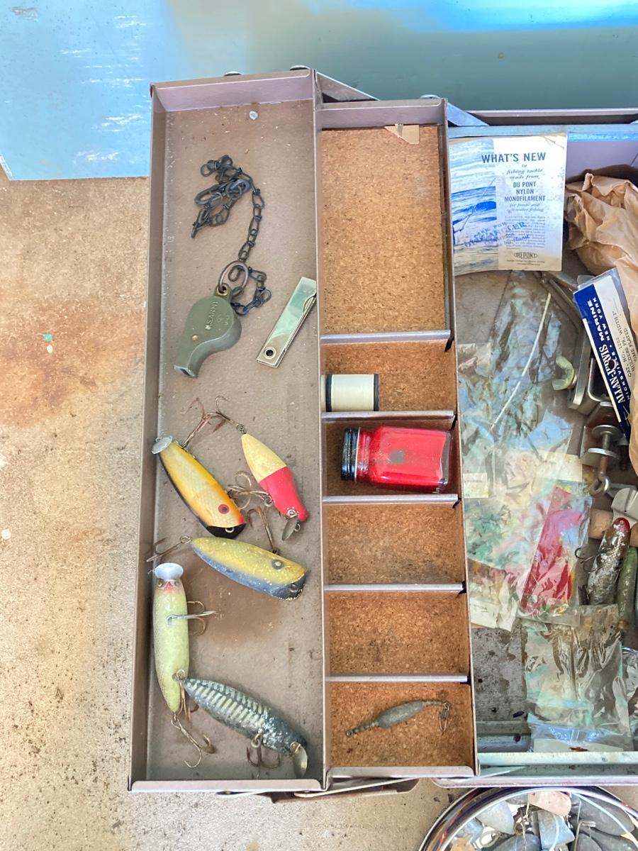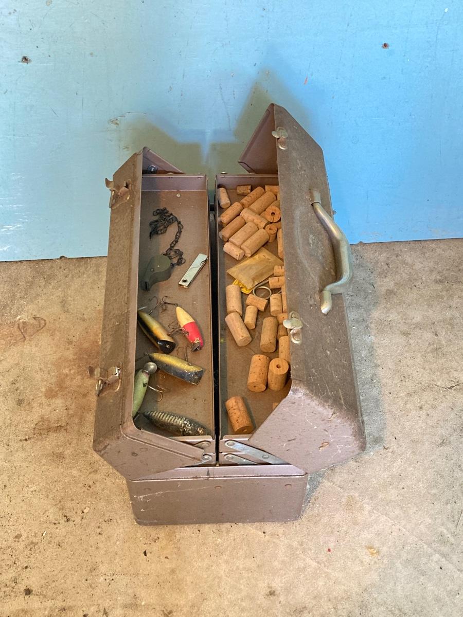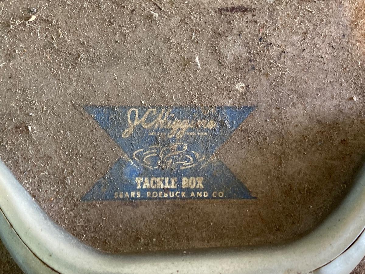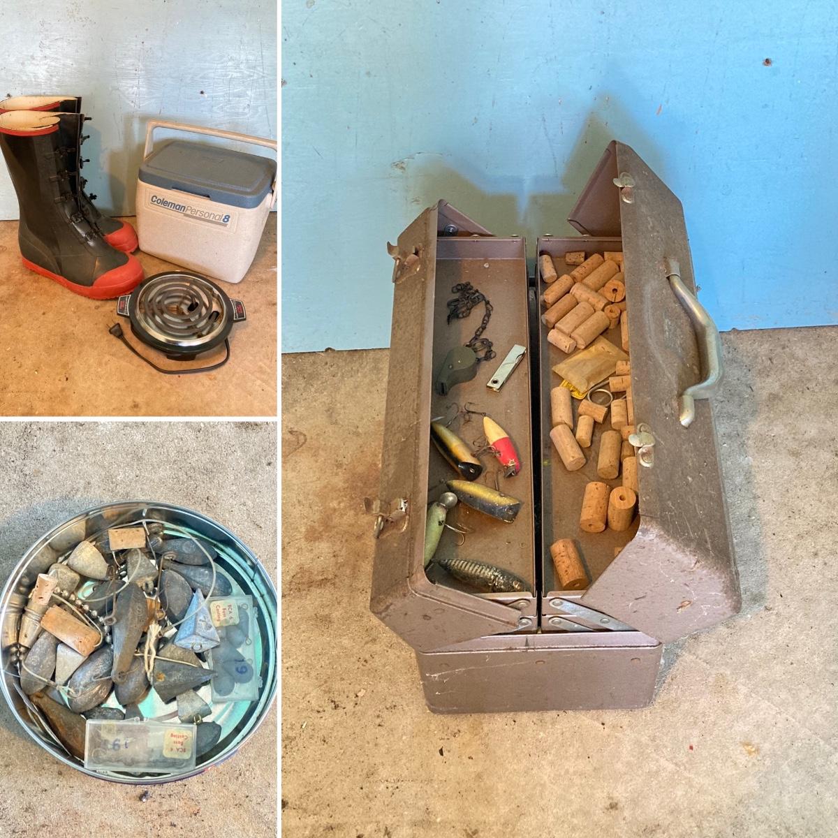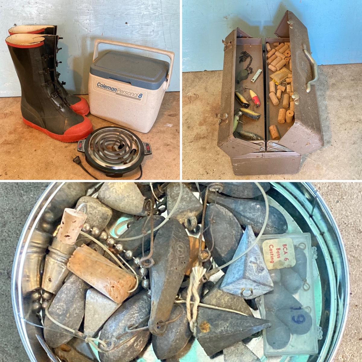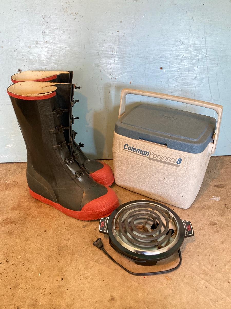 LOT 88G: Sears Roebuck and Co. JC Higgins Tackle Box with Contents, Fishing Weights, Weather Spirits Boots (Sz 9), Hamilton Beach Fifth Burner and Coleman Cooler