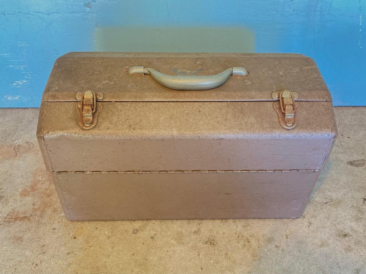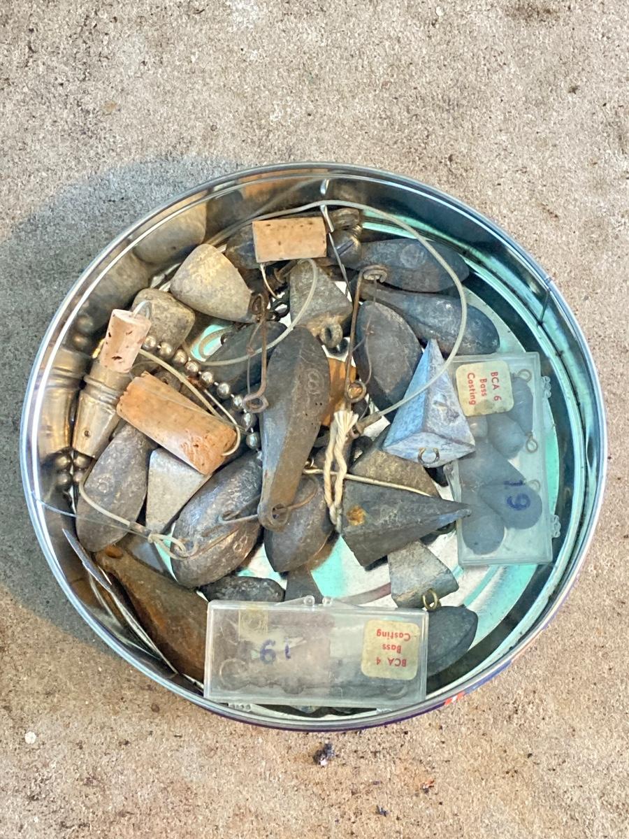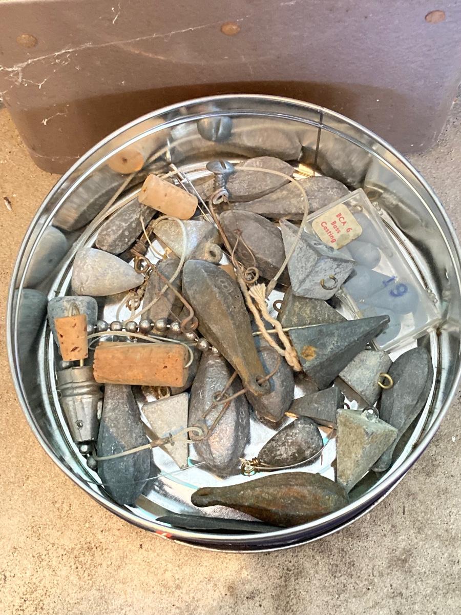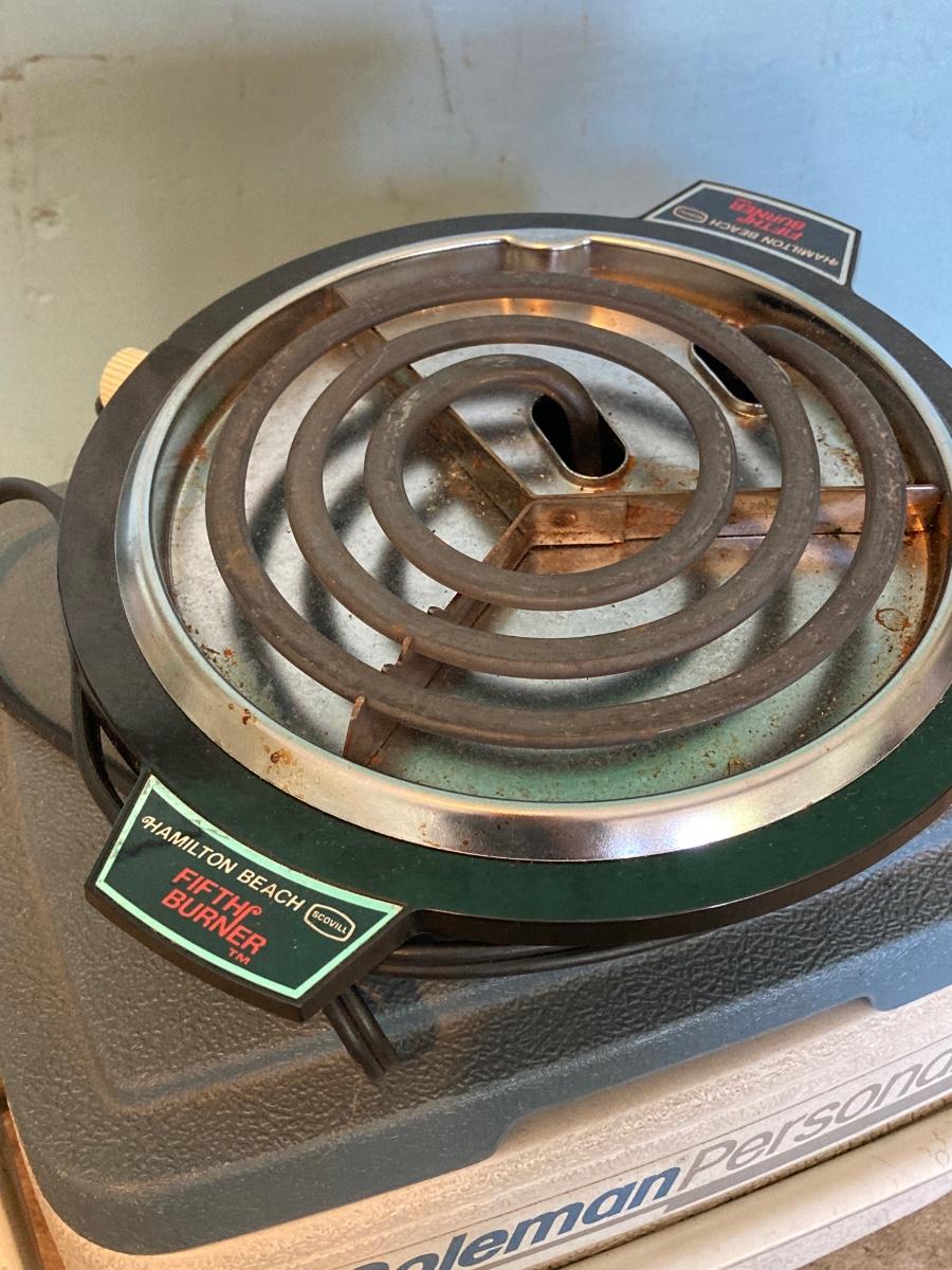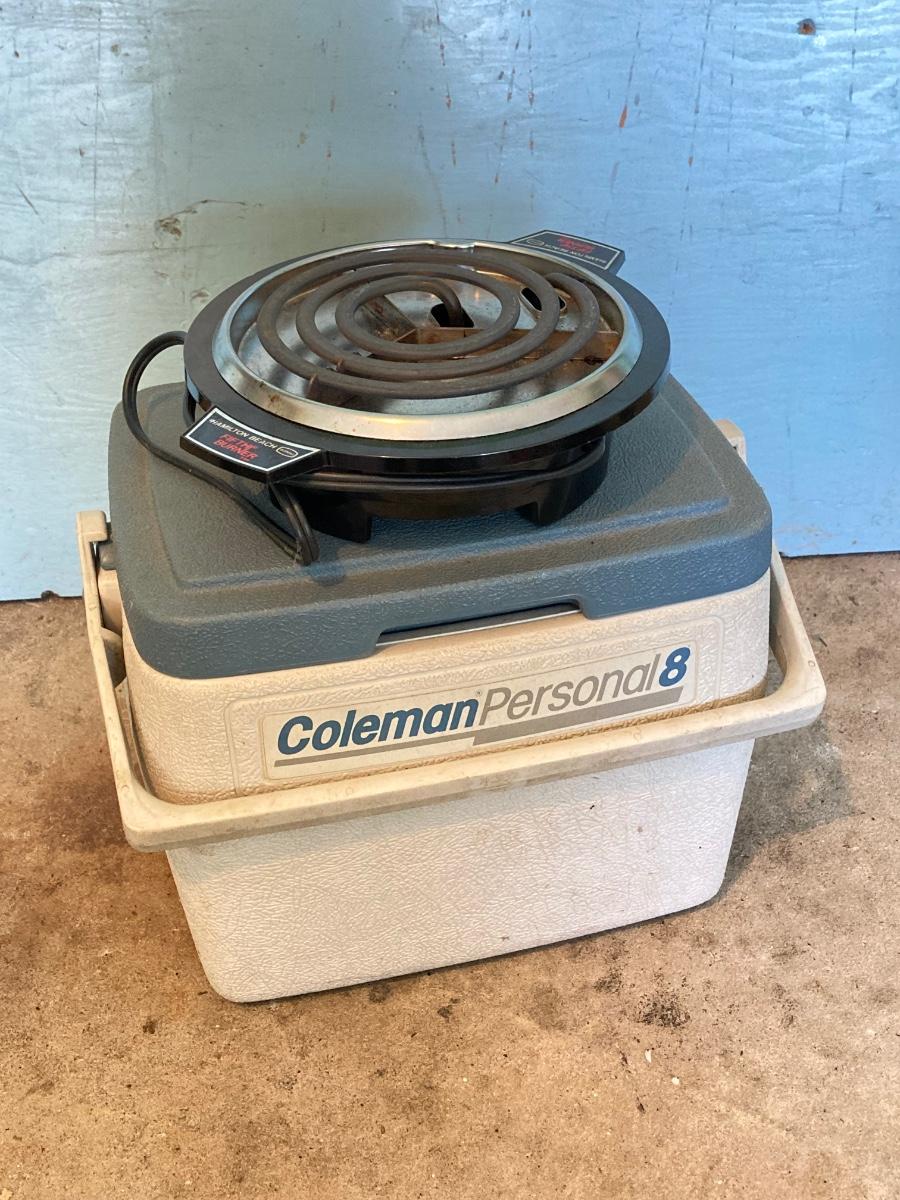 LOT 88G: Sears Roebuck and Co. JC Higgins Tackle Box with Contents, Fishing Weights, Weather Spirits Boots (Sz 9), Hamilton Beach Fifth Burner and Coleman Cooler