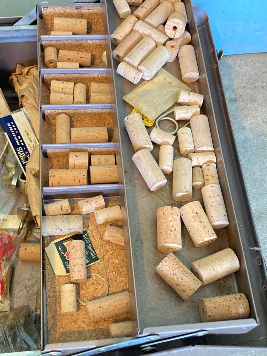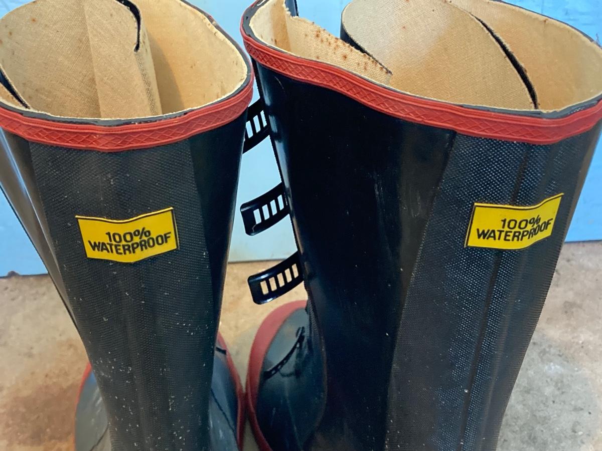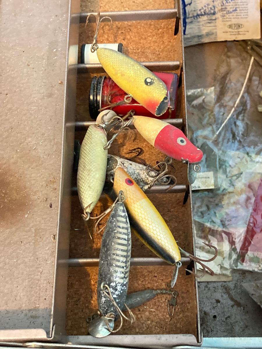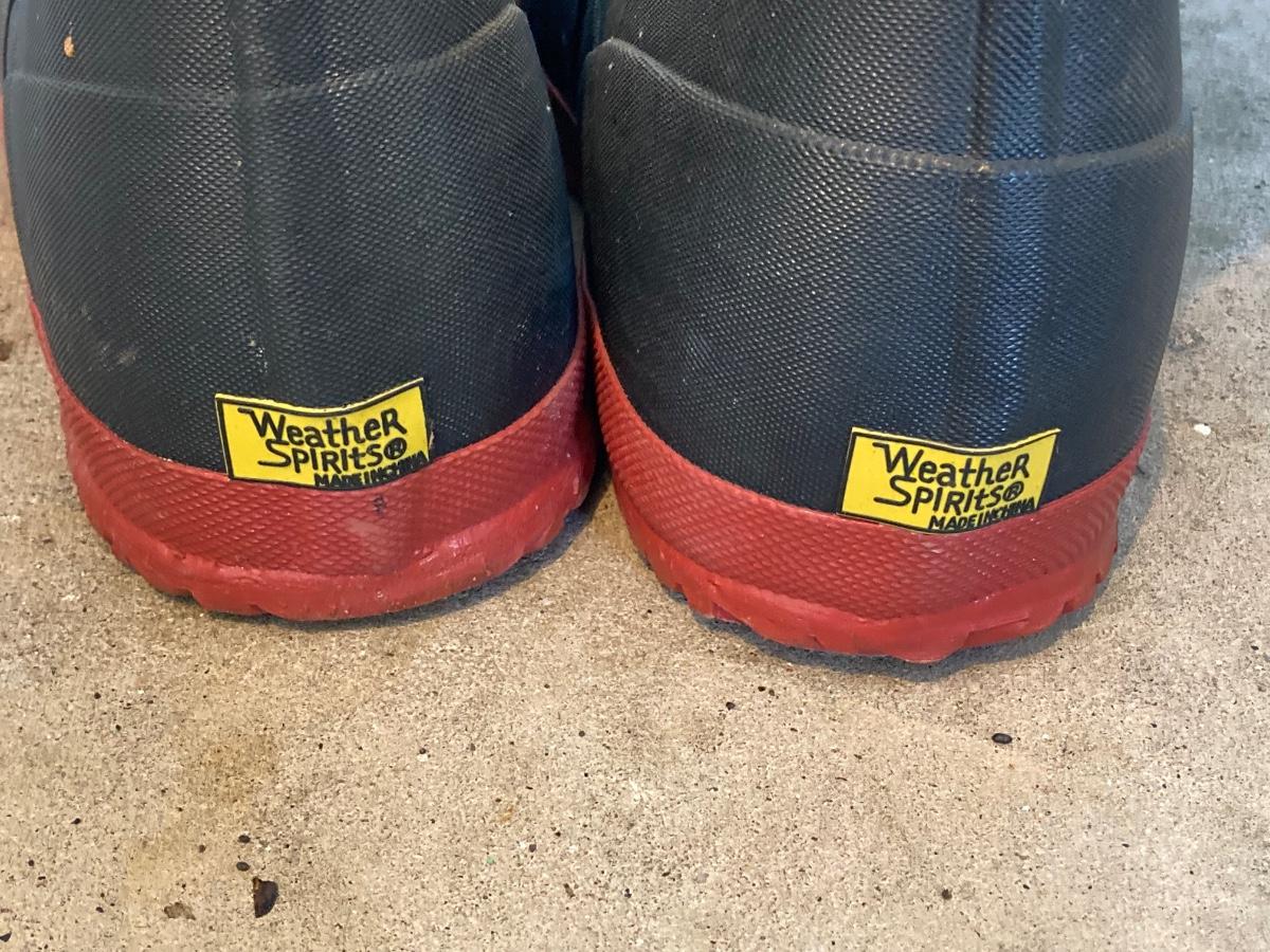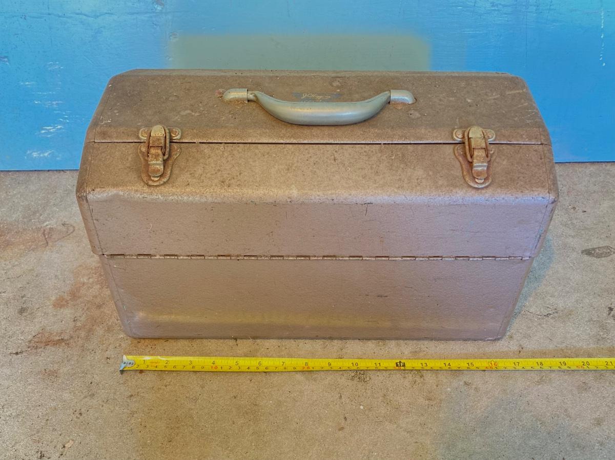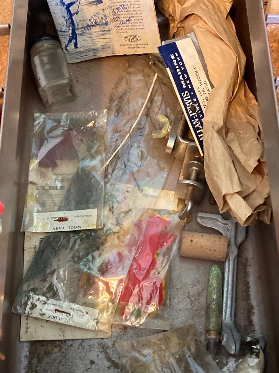 LOT 88G: Sears Roebuck and Co. JC Higgins Tackle Box with Contents, Fishing Weights, Weather Spirits Boots (Sz 9), Hamilton Beach Fifth Burner and Coleman Cooler