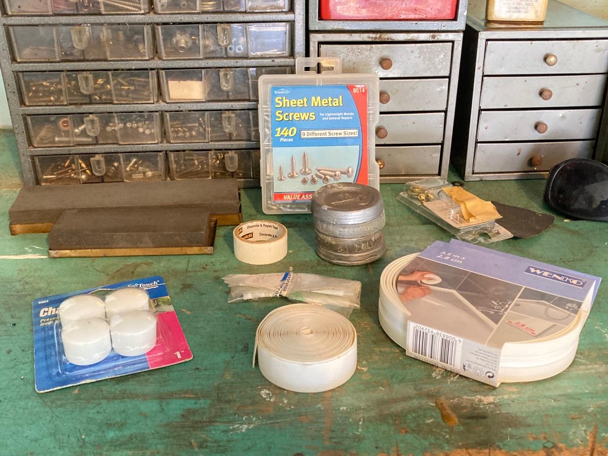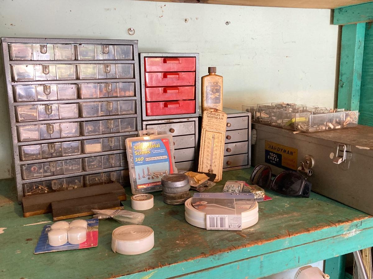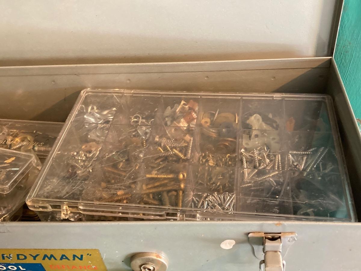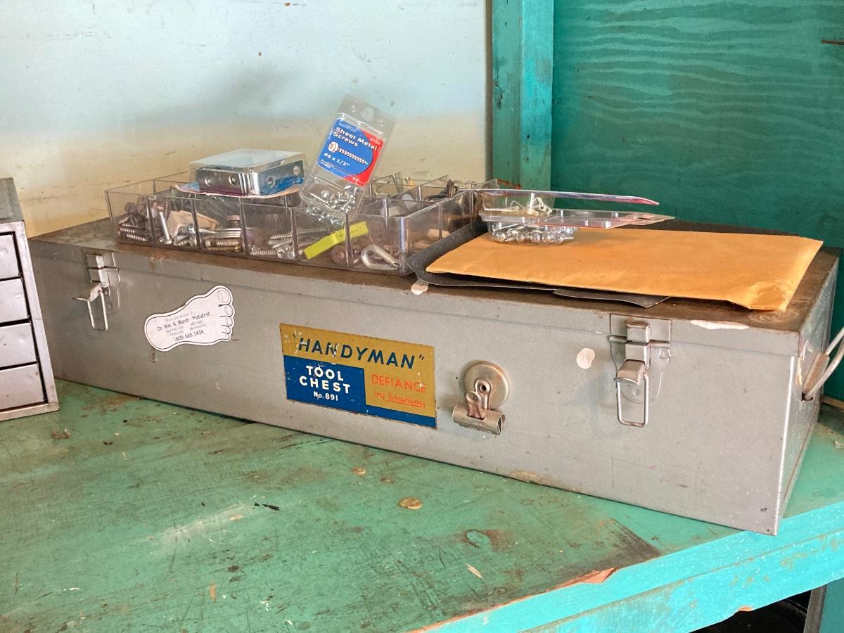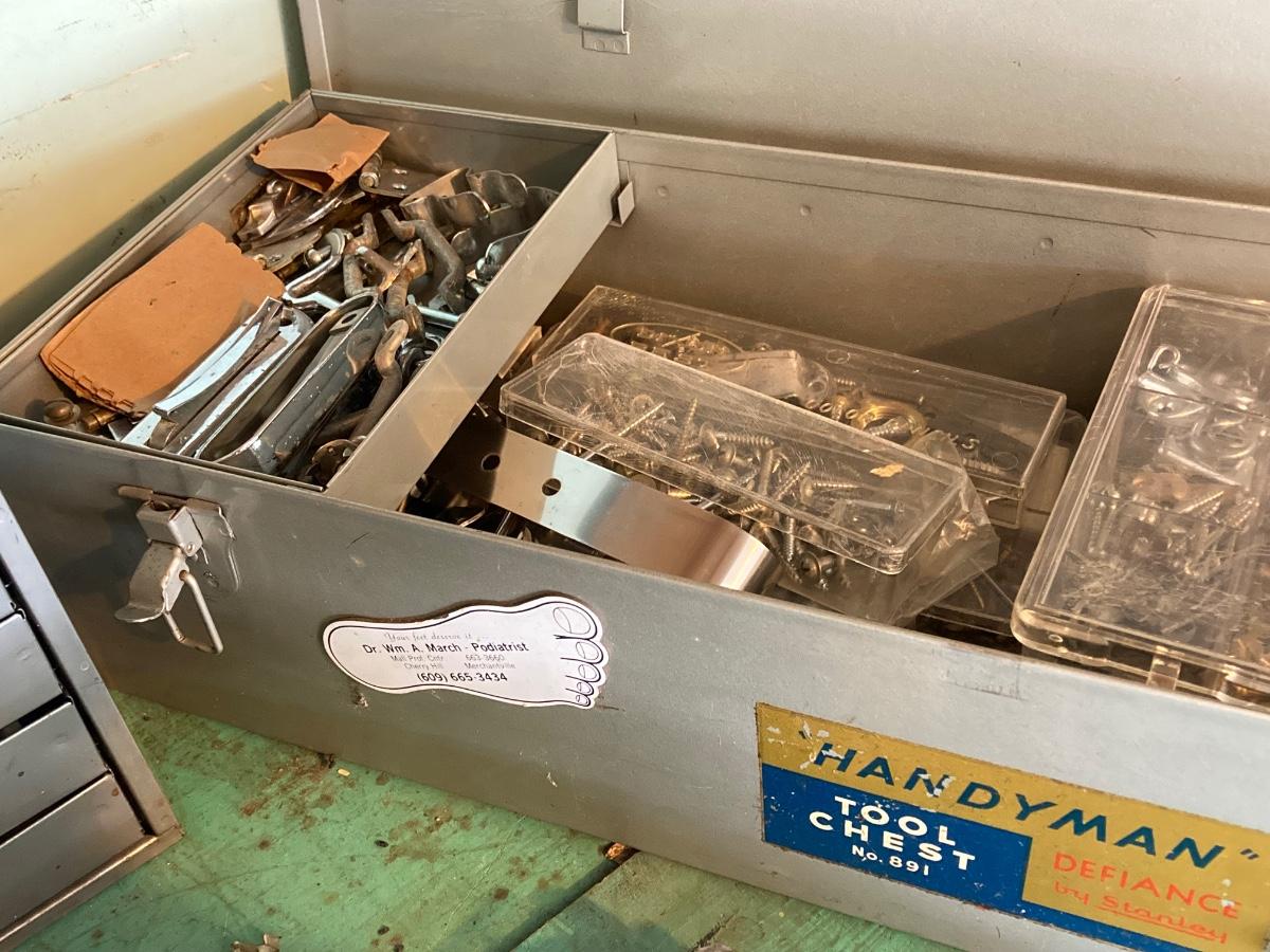 LOT 91G: Metal Storage Bins / Containers with Contents, Vintage Stanley Defiance "Handyman" Tool Chest No 891 with Contents and More