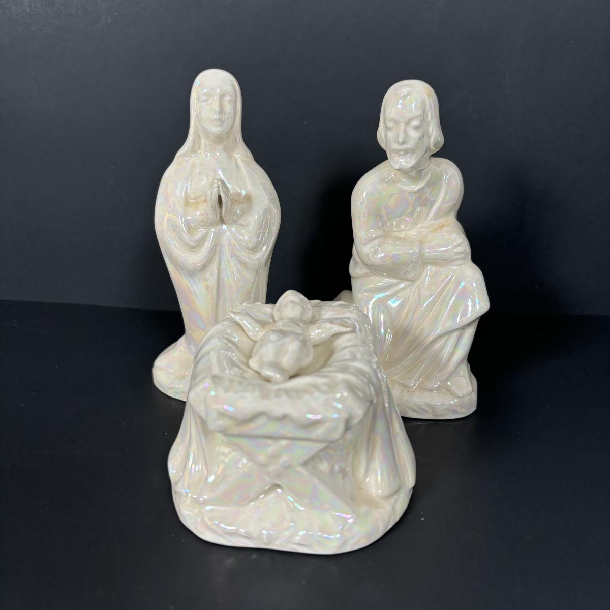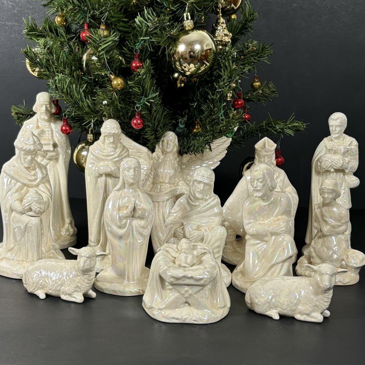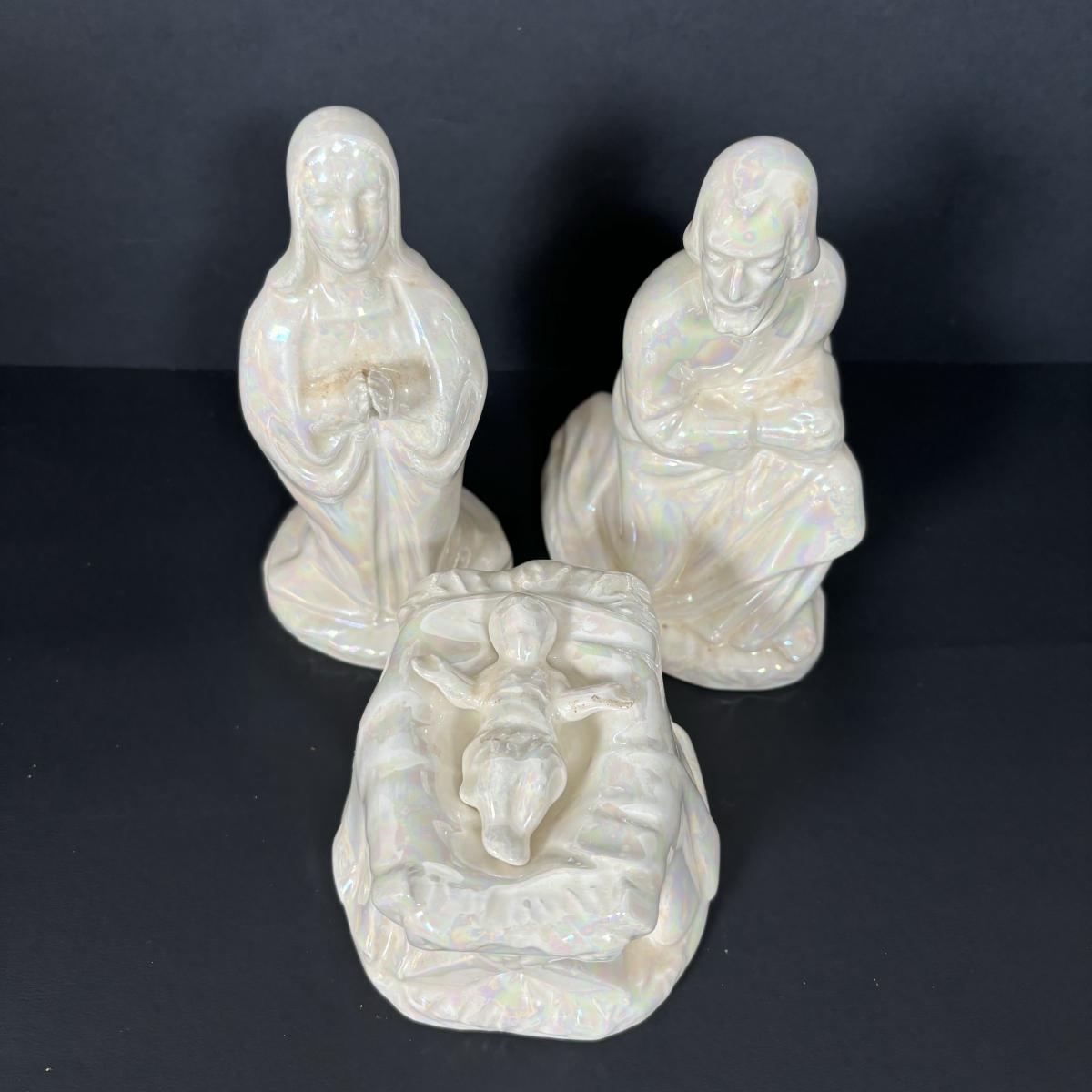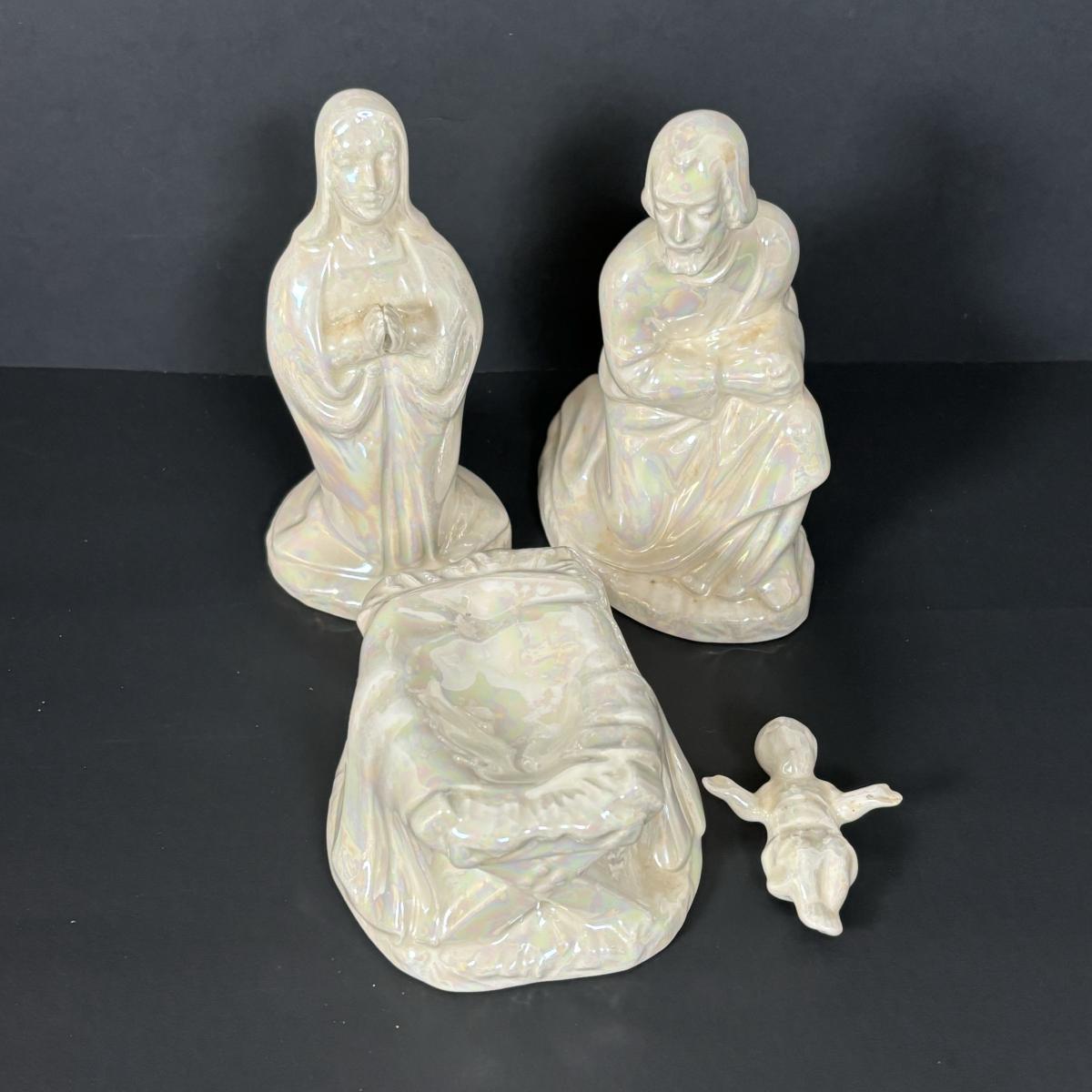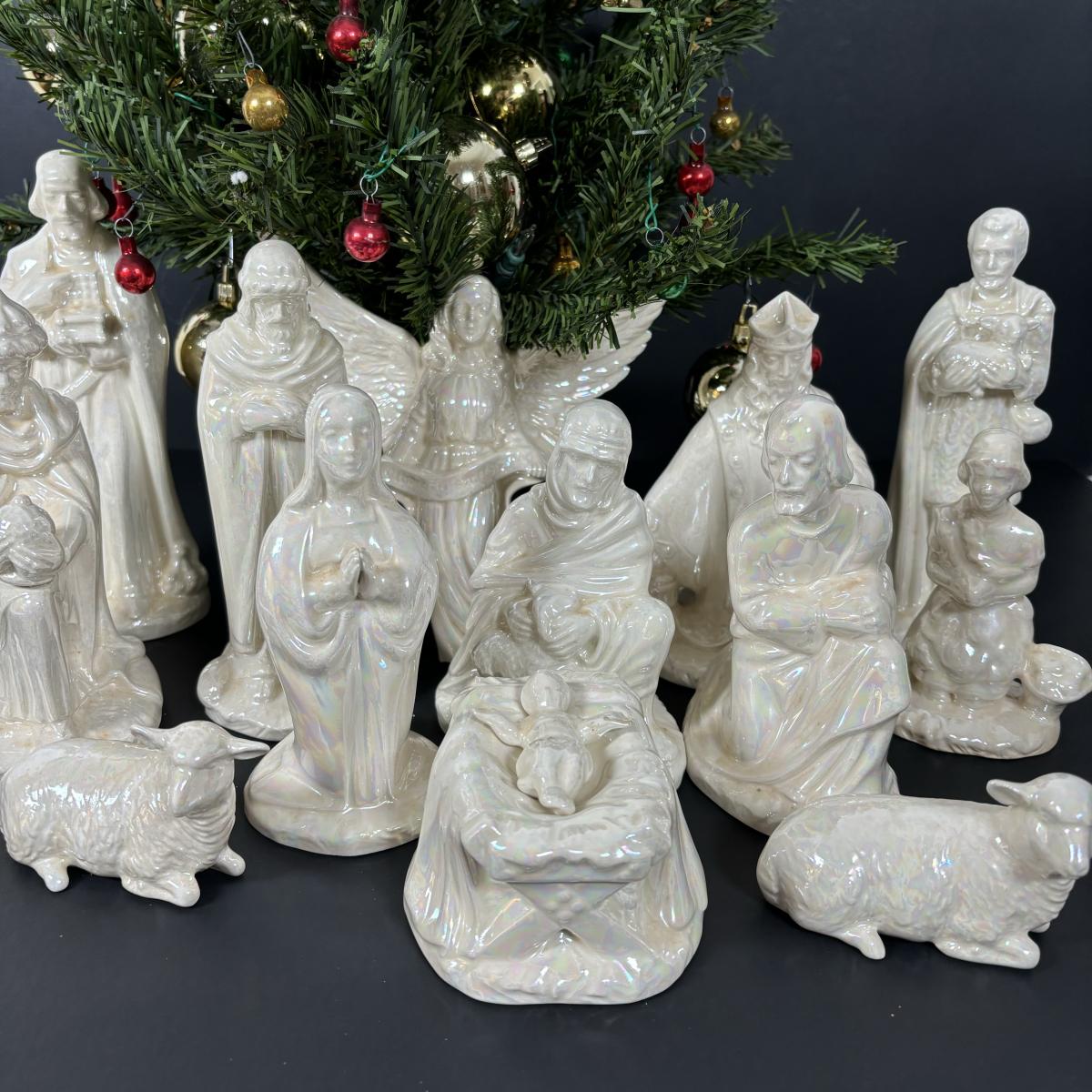 LOT 109: Mother of Pearl Glazed Ceramic Nativity Set & 24" Decorated Christmas Tree