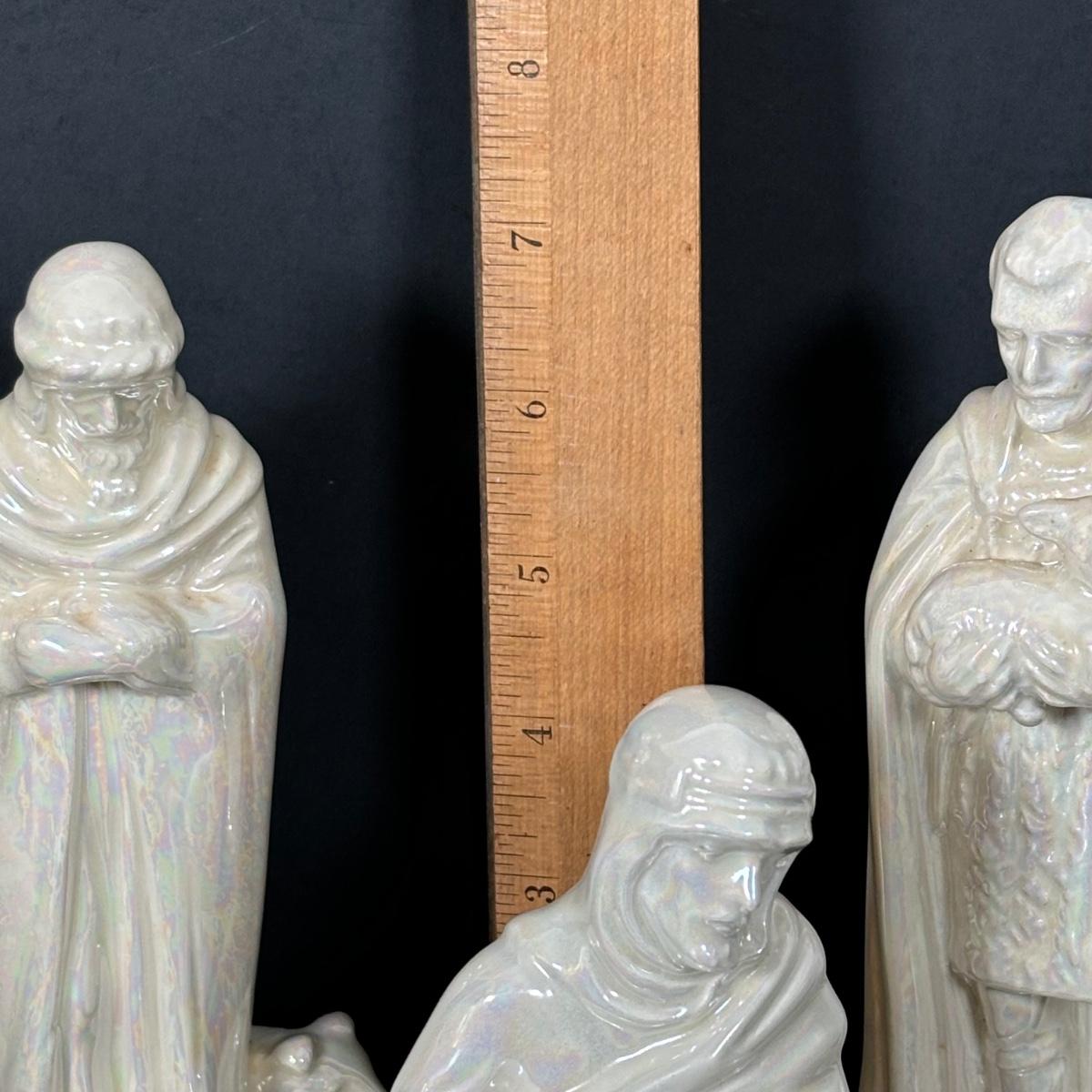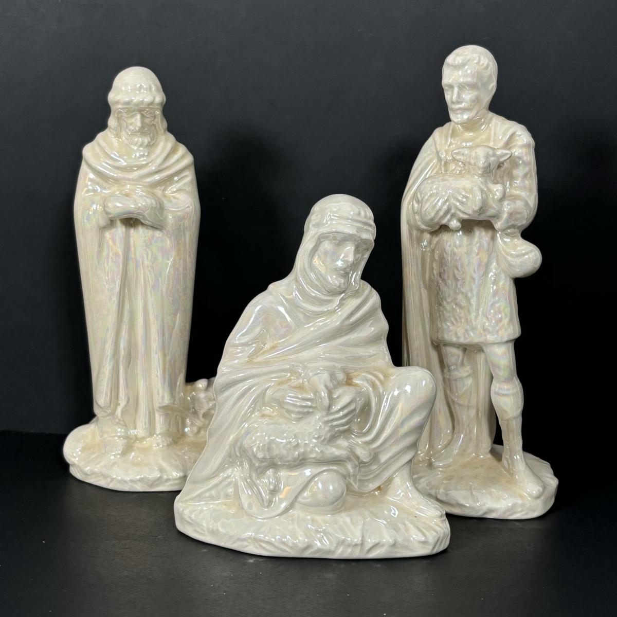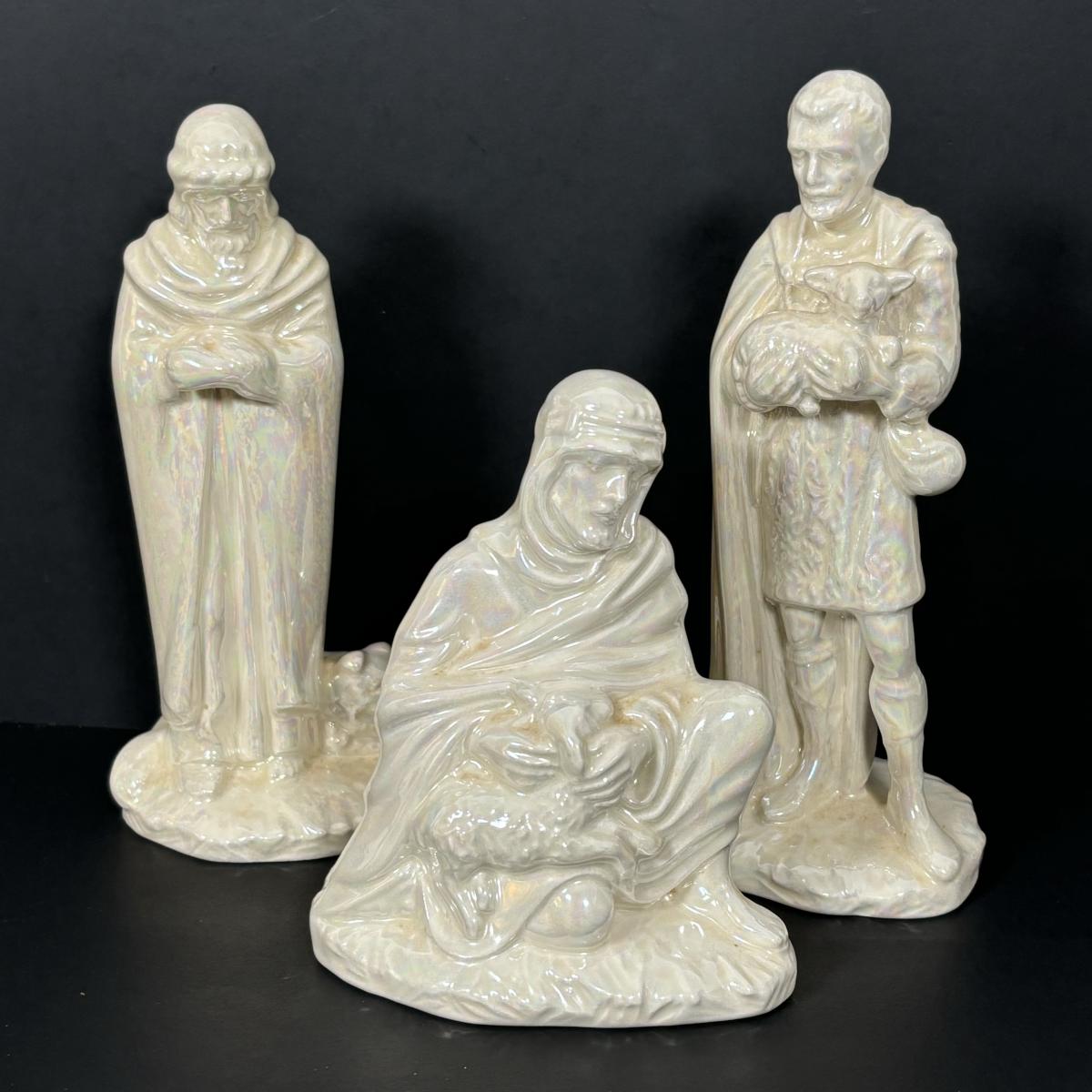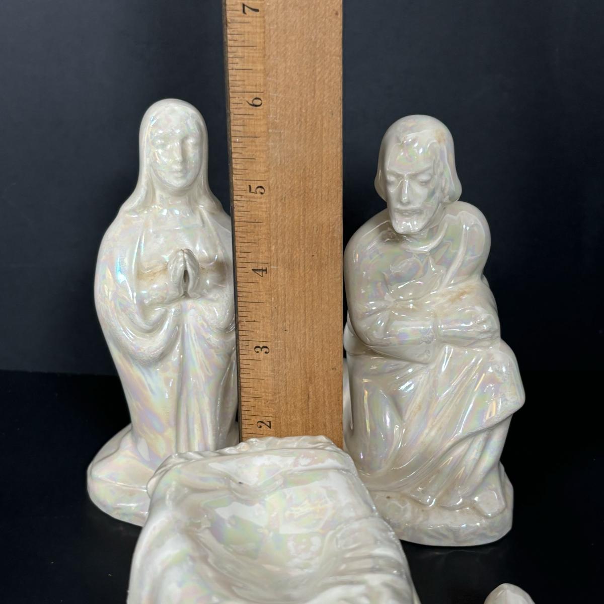 LOT 109: Mother of Pearl Glazed Ceramic Nativity Set & 24" Decorated Christmas Tree