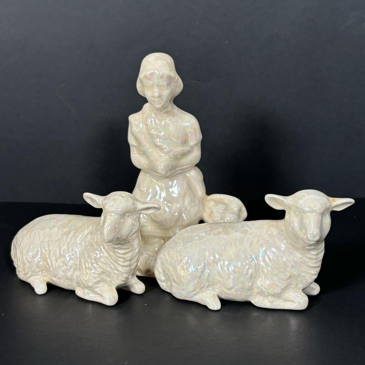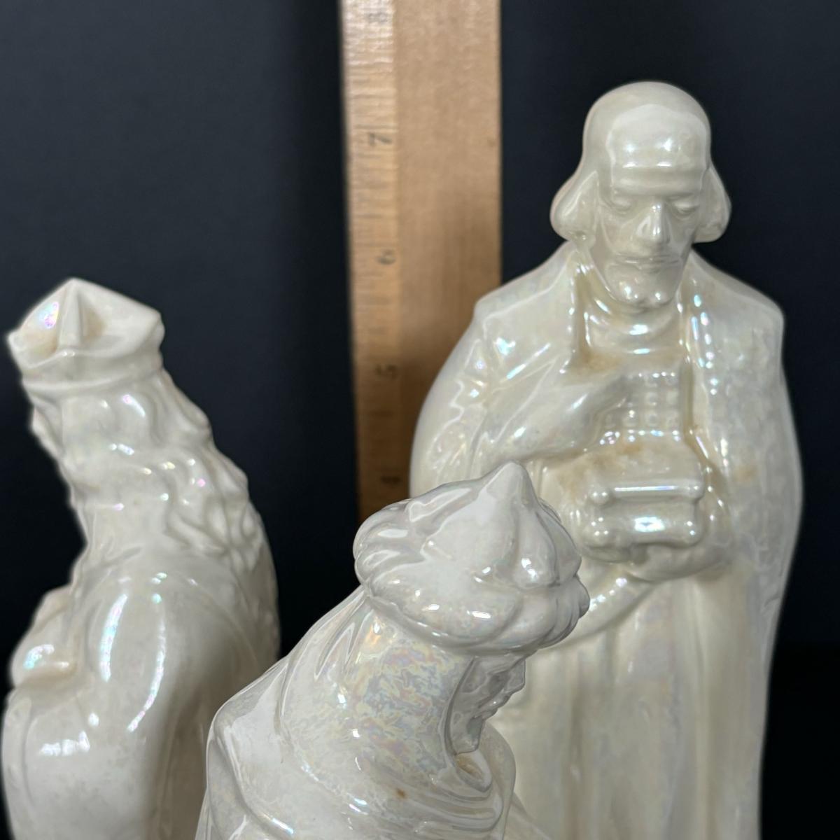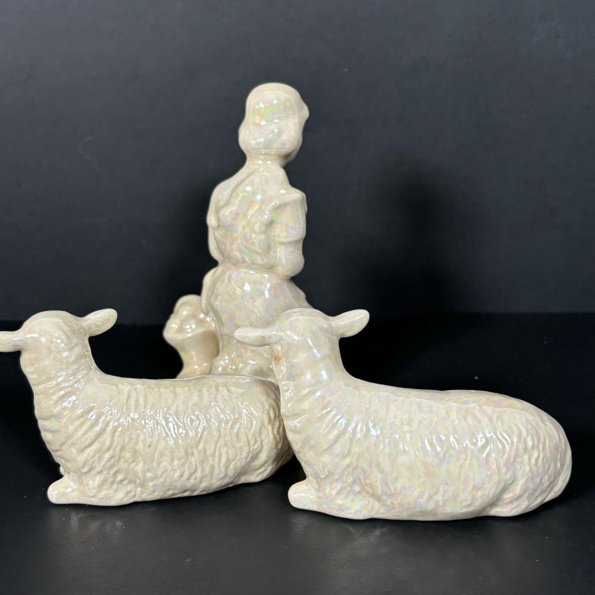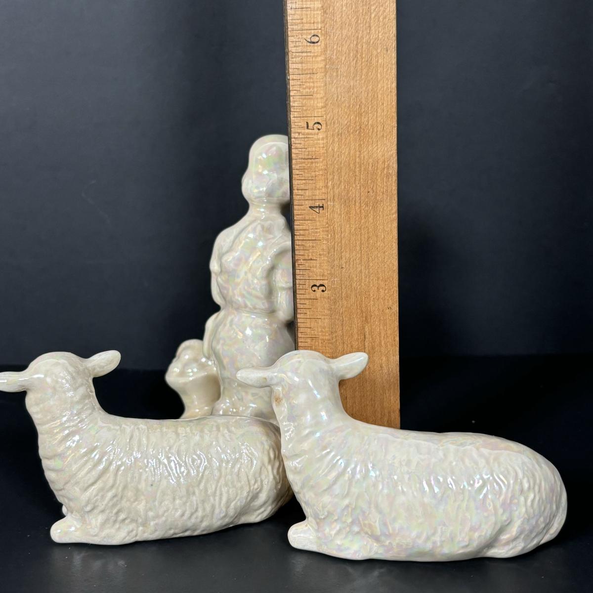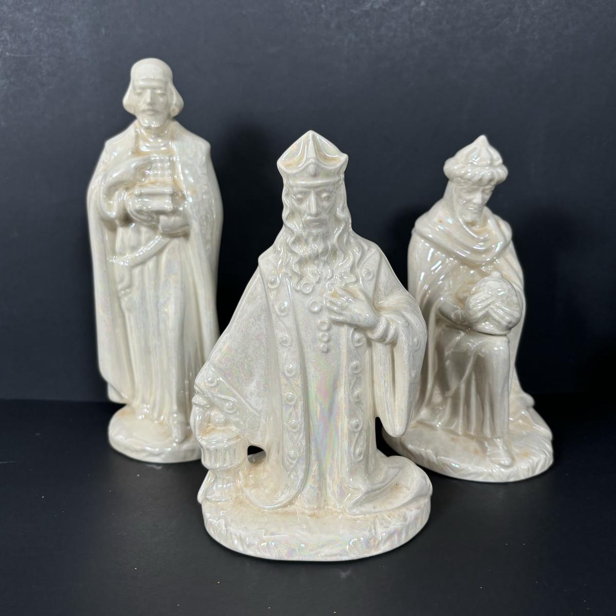 LOT 109: Mother of Pearl Glazed Ceramic Nativity Set & 24" Decorated Christmas Tree