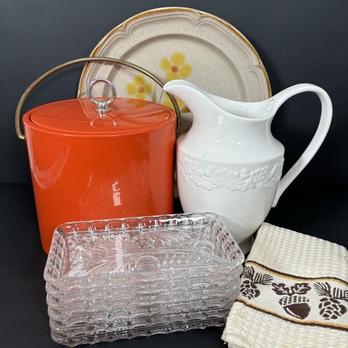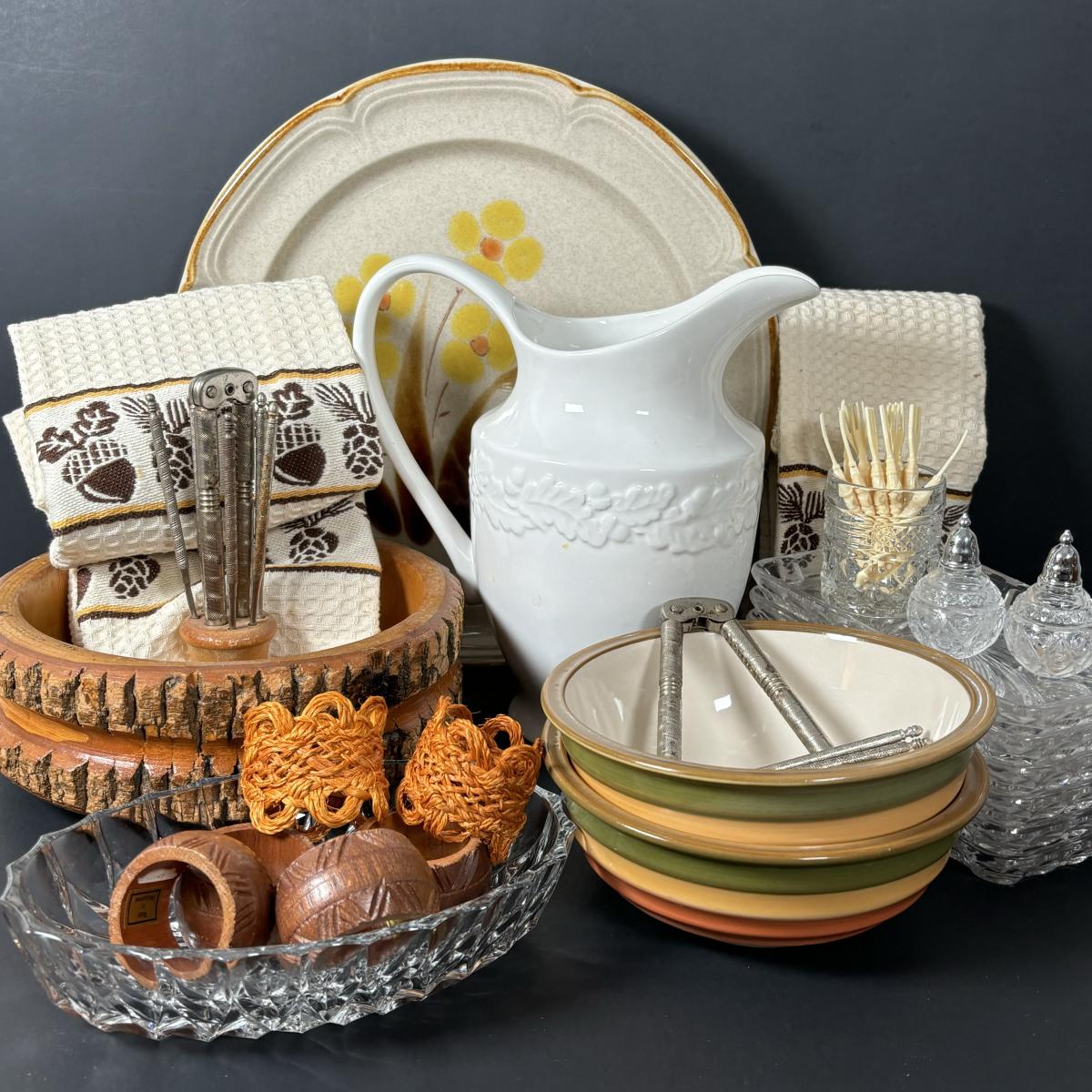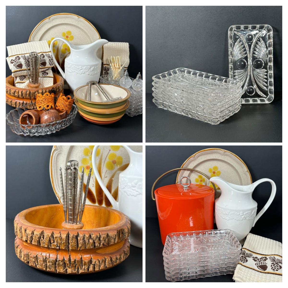 LOT 110: MCM Vinyl Ice Bucket, Wooden Nut Dish w/Nut Crackers/Picks Princess House Crystal Appetizer Trays, Imperial Crysal & More