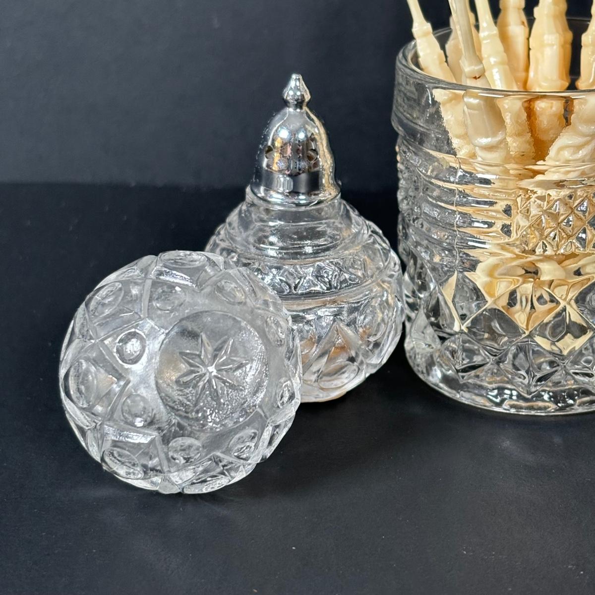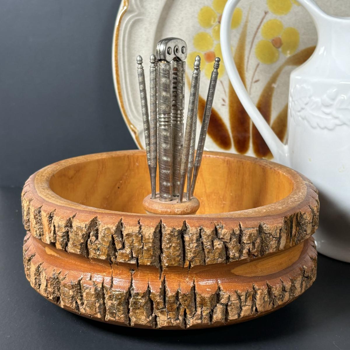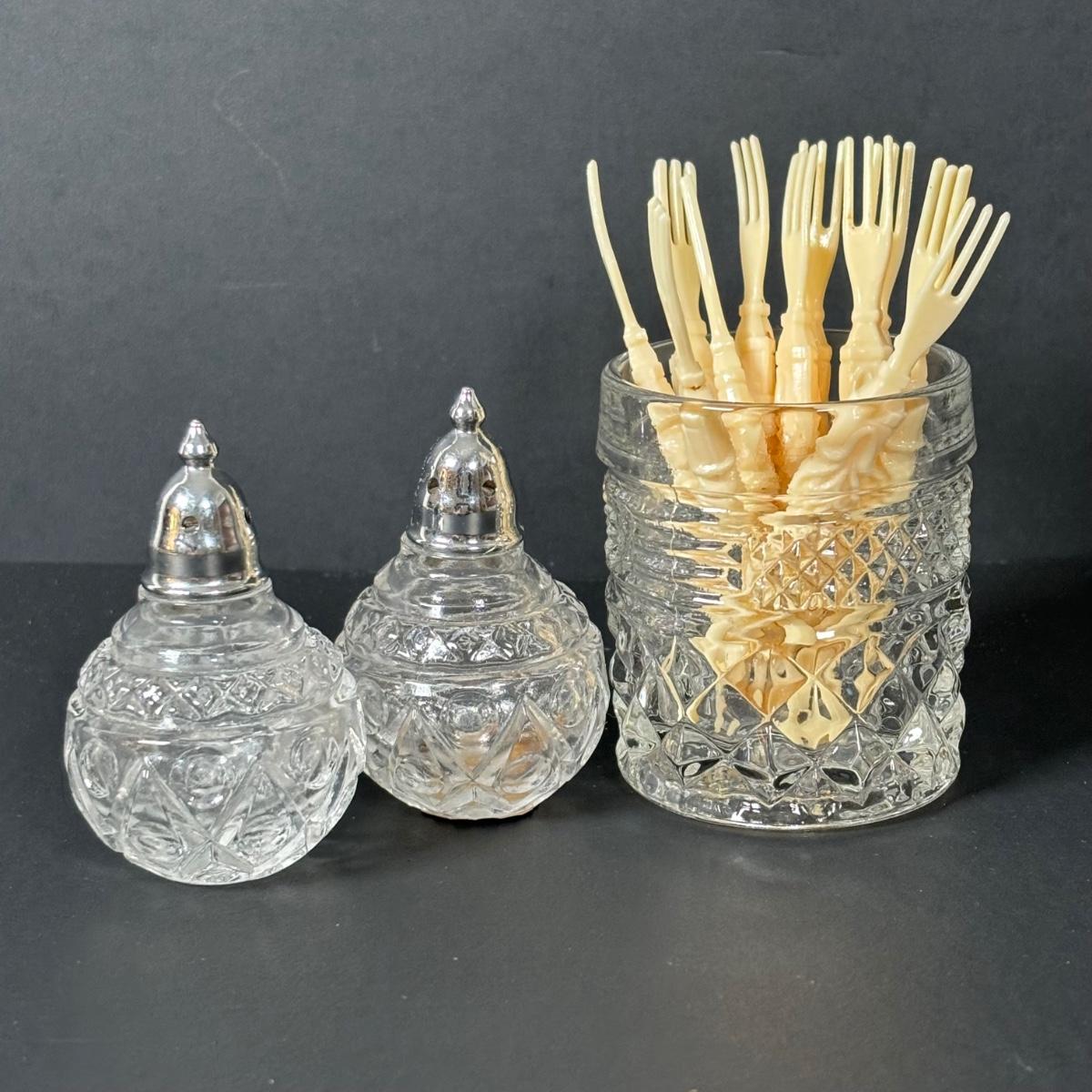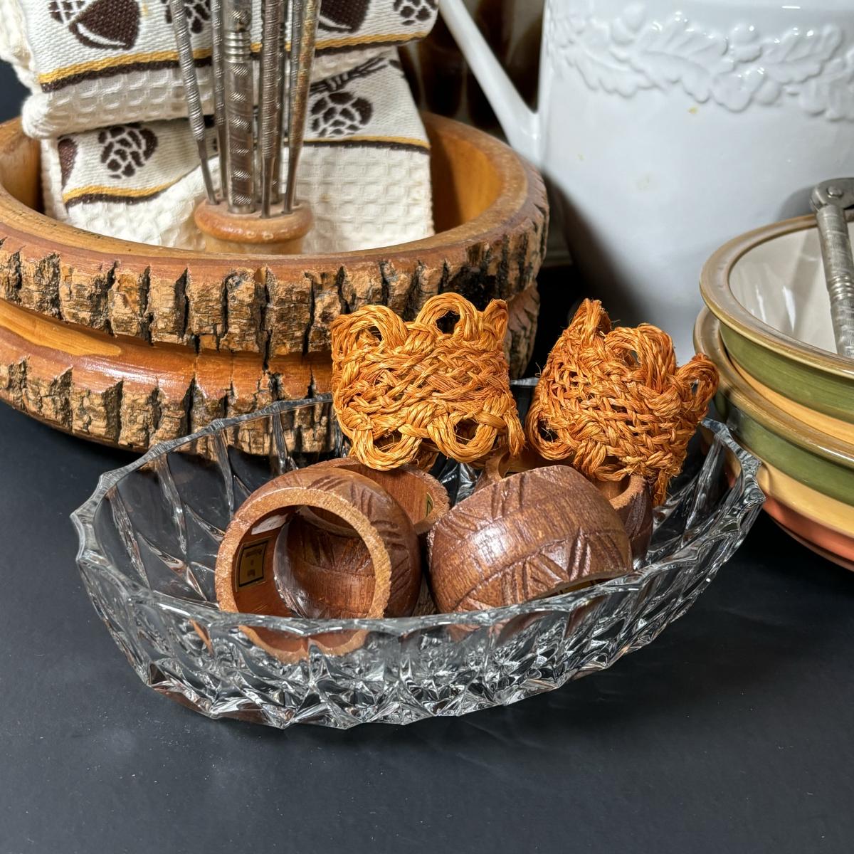 LOT 110: MCM Vinyl Ice Bucket, Wooden Nut Dish w/Nut Crackers/Picks Princess House Crystal Appetizer Trays, Imperial Crysal & More
