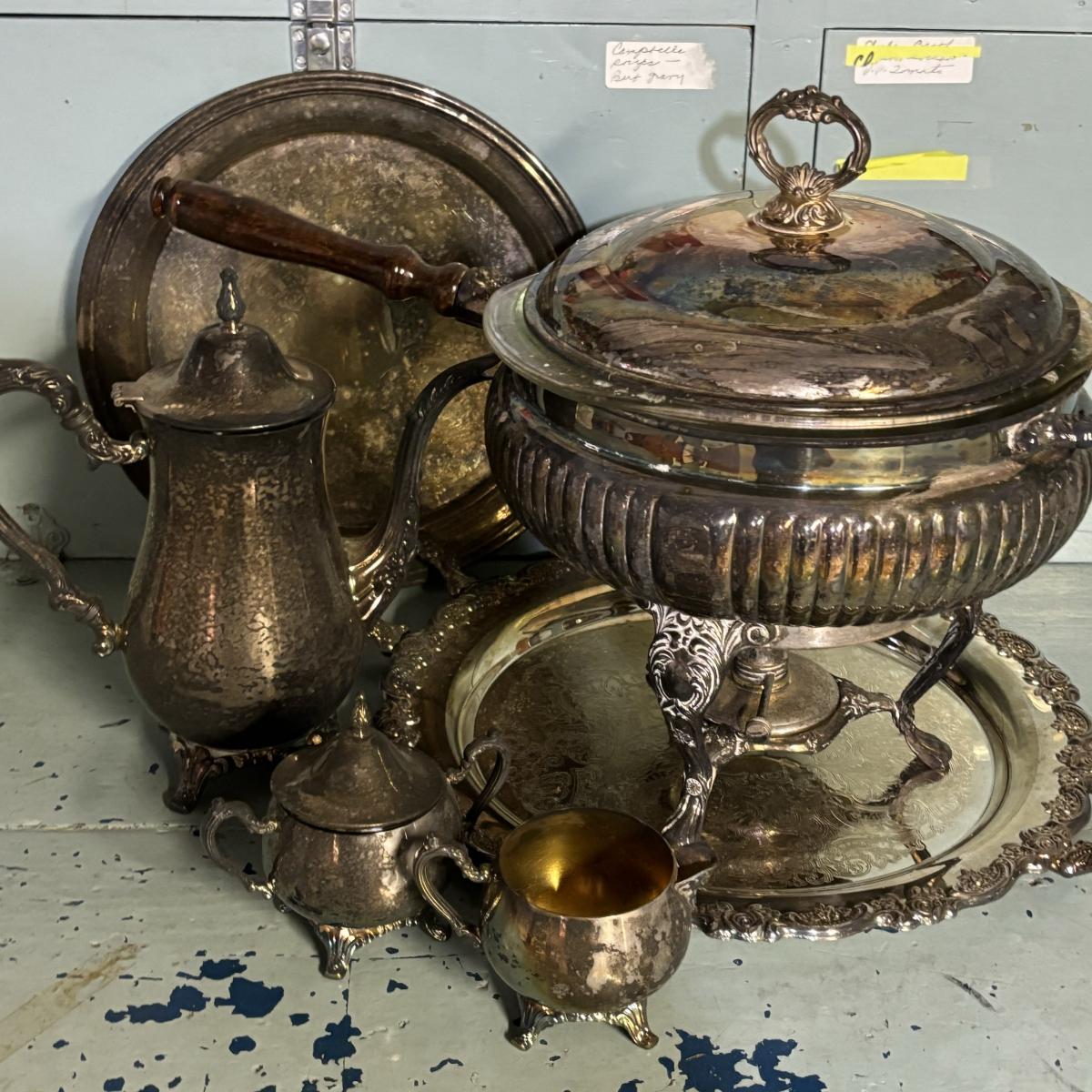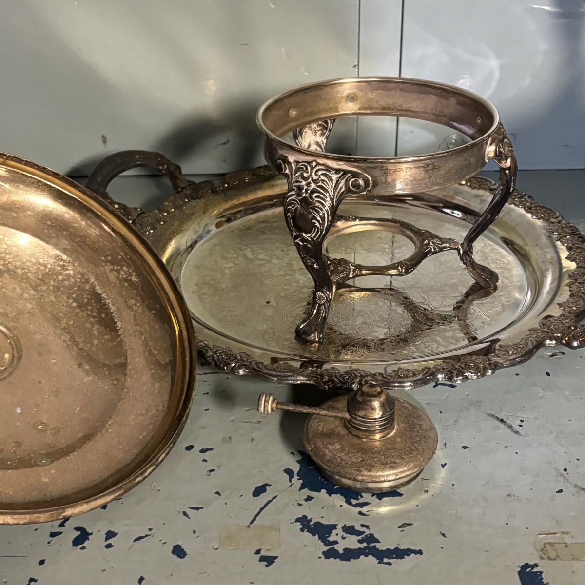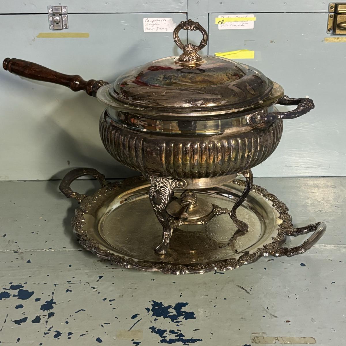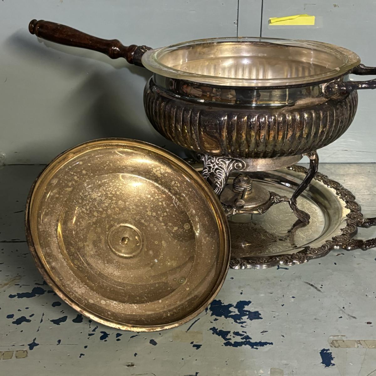 LOT 114: Vintage Oneida Silverplate Chafing Dish with Lid & Liner, Sheridan Silverplate Stand & Burner, Oneida Silverplate Teapot, Sugar Bowl, Creamer & Serving Tray